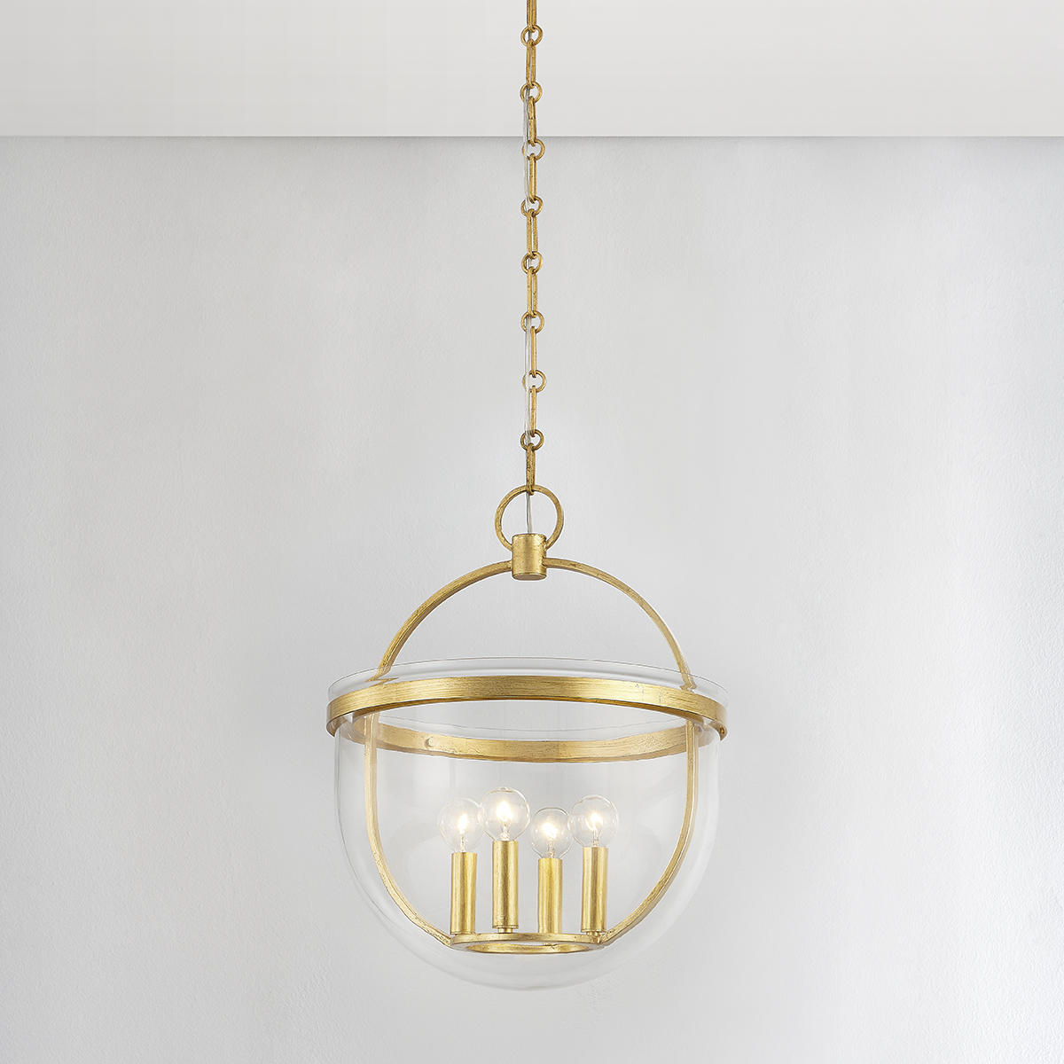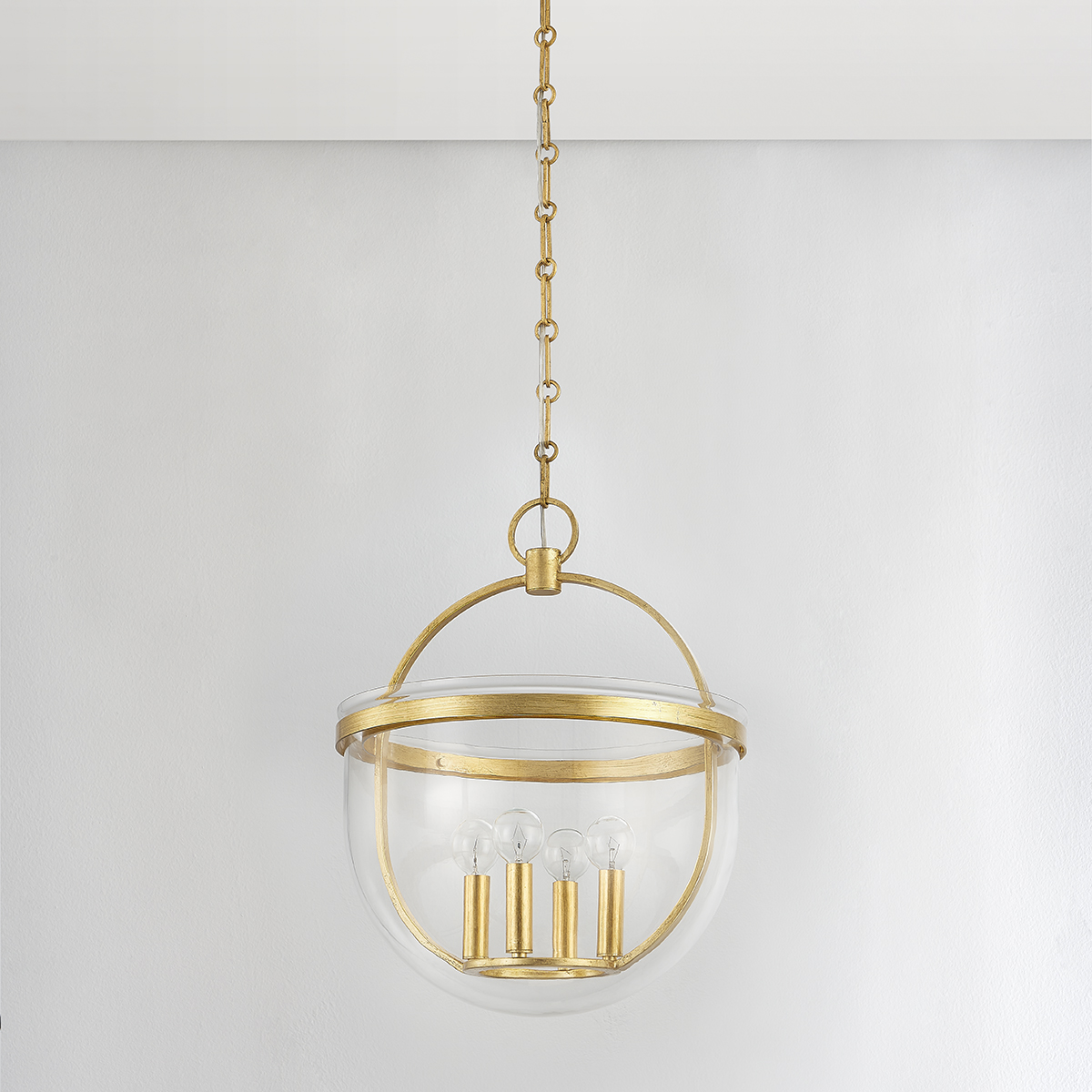 Malloy brings a chic, modern update to the traditional bell jar. An elongated semi-circular clear glass shade partially encloses an elliptical metal framework of Aged Iron or Vintage Gold Leaf. A matching metal band along the top of the glass holds the elements in place with screw details set on the interior band.