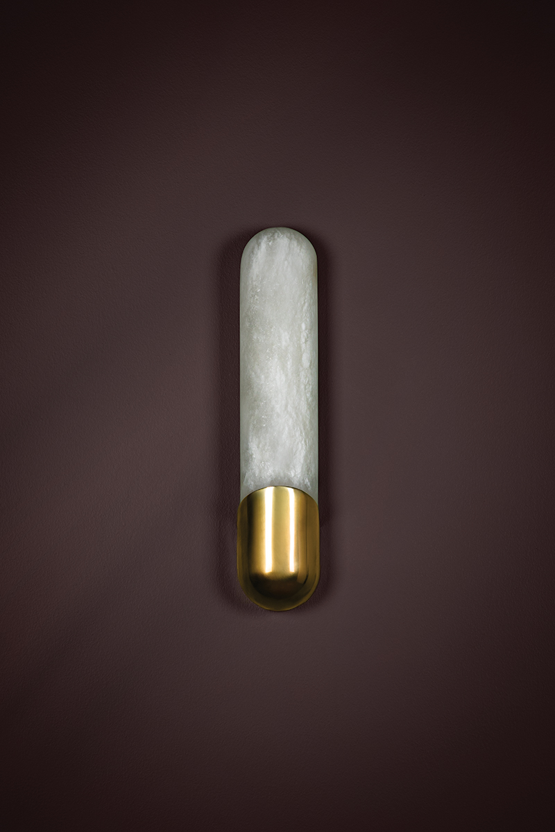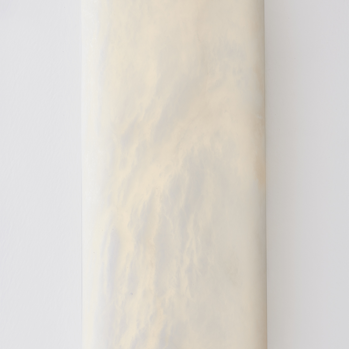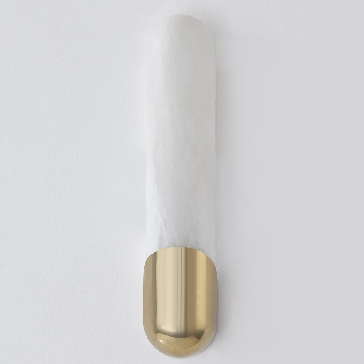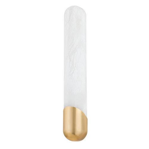 A straightforward sconce design allows the natural beauty of alabaster to shine. The smooth, curved Aged Brass holder puts a cylindrical alabaster shade on display. Lit from within by an LED, it casts a soft glow that highlights the veining in the stone. This versatile and stylish wall sconce can be hung alone or in multiples to bring a simple elegance anywhere in the home.