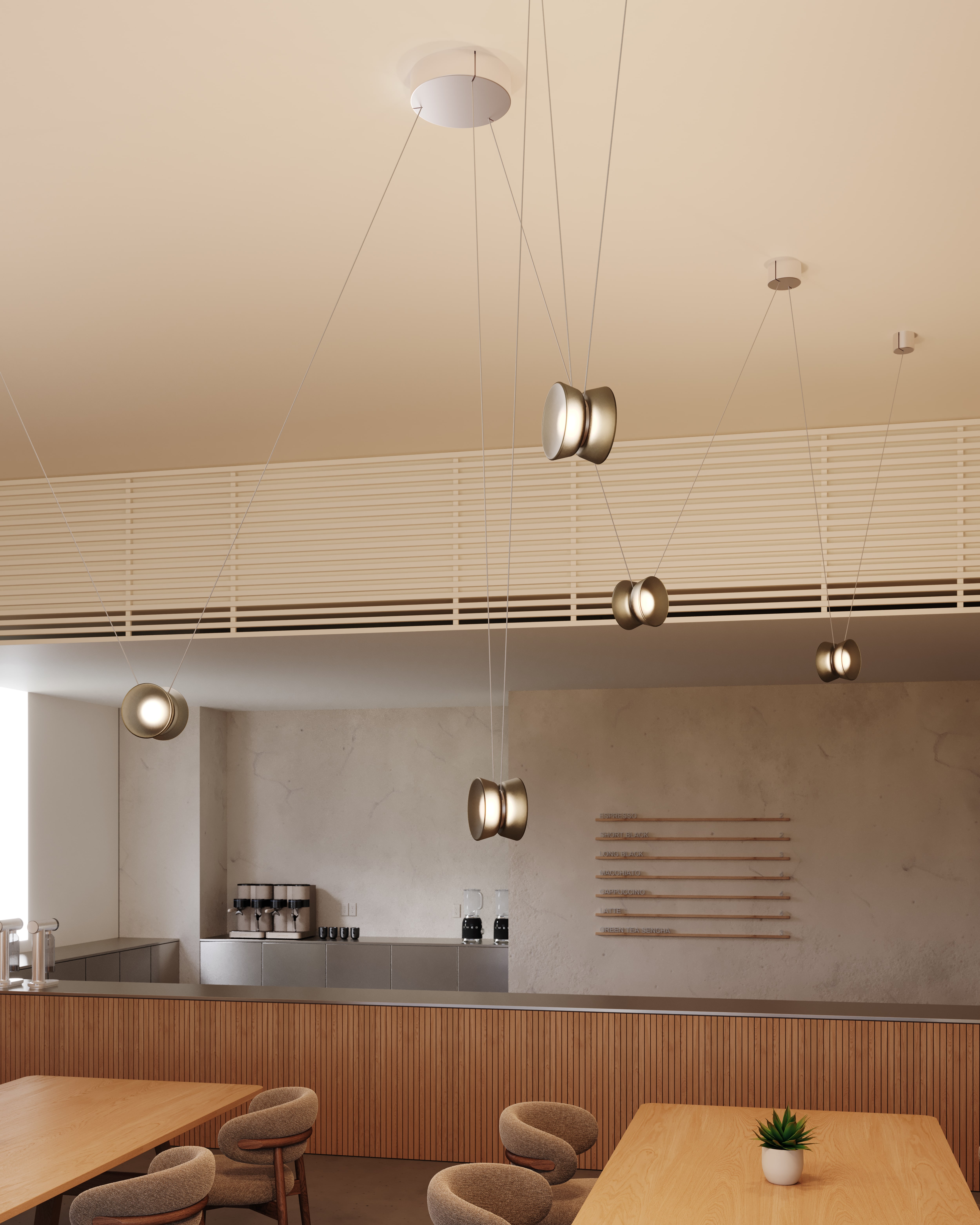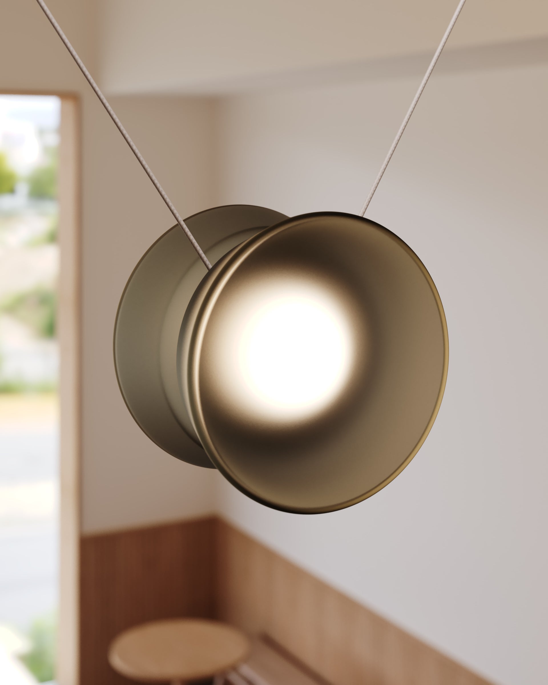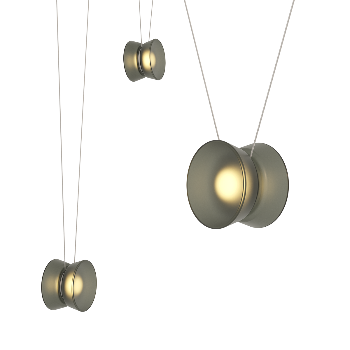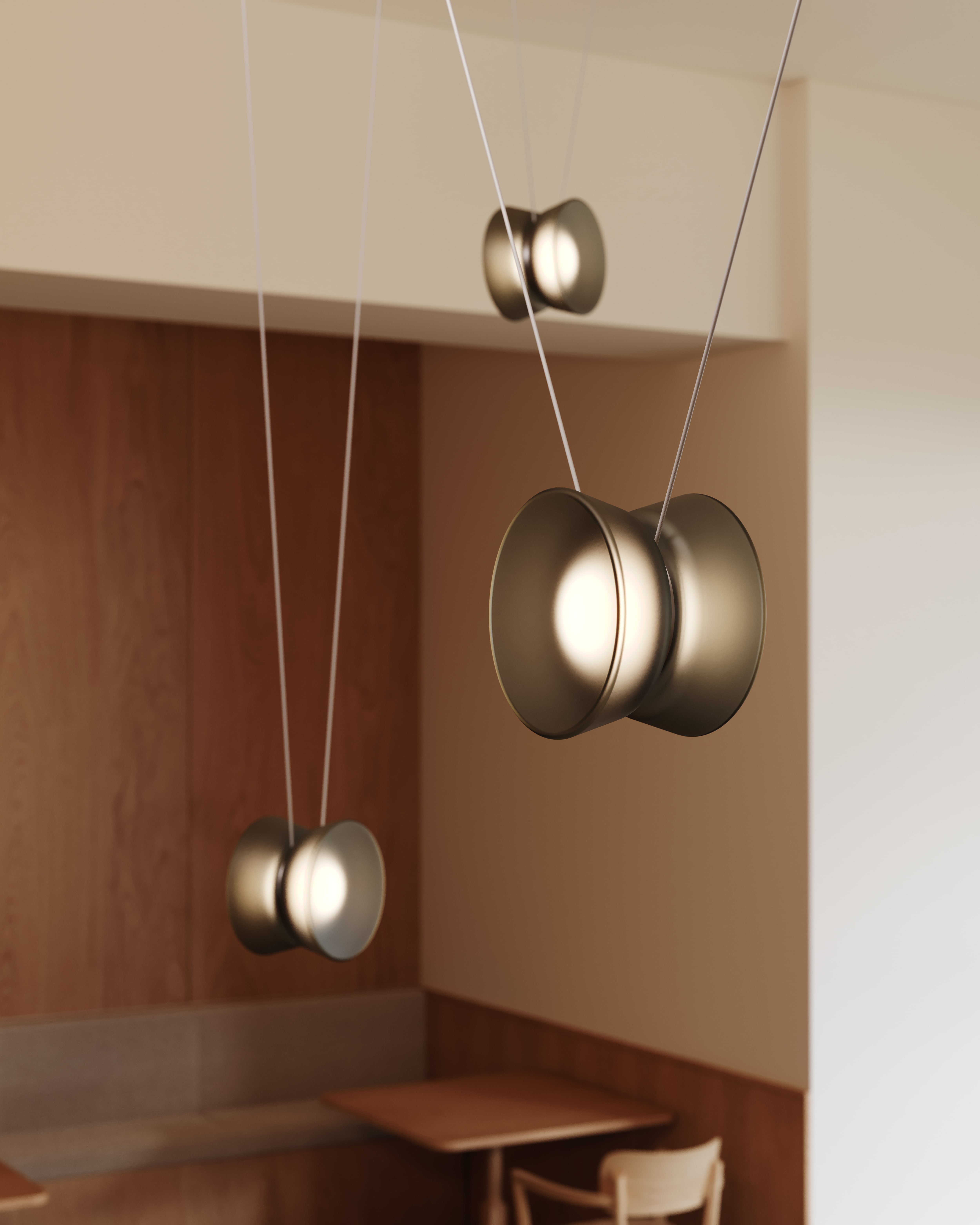 Inspired by the elegant geometry of a yo-yo, the Yo family of chandeliers transforms playful forms into sophisticated lighting solutions. Adjustable by design, each shade glides effortlessly along its cord, adapting to spaces with ease. This allows for more focused illumination when lowered and ambient radiance when raised. The configurations come in a variety of sizes with three shade shapes and a Natural Anodized finish on the metalwork.