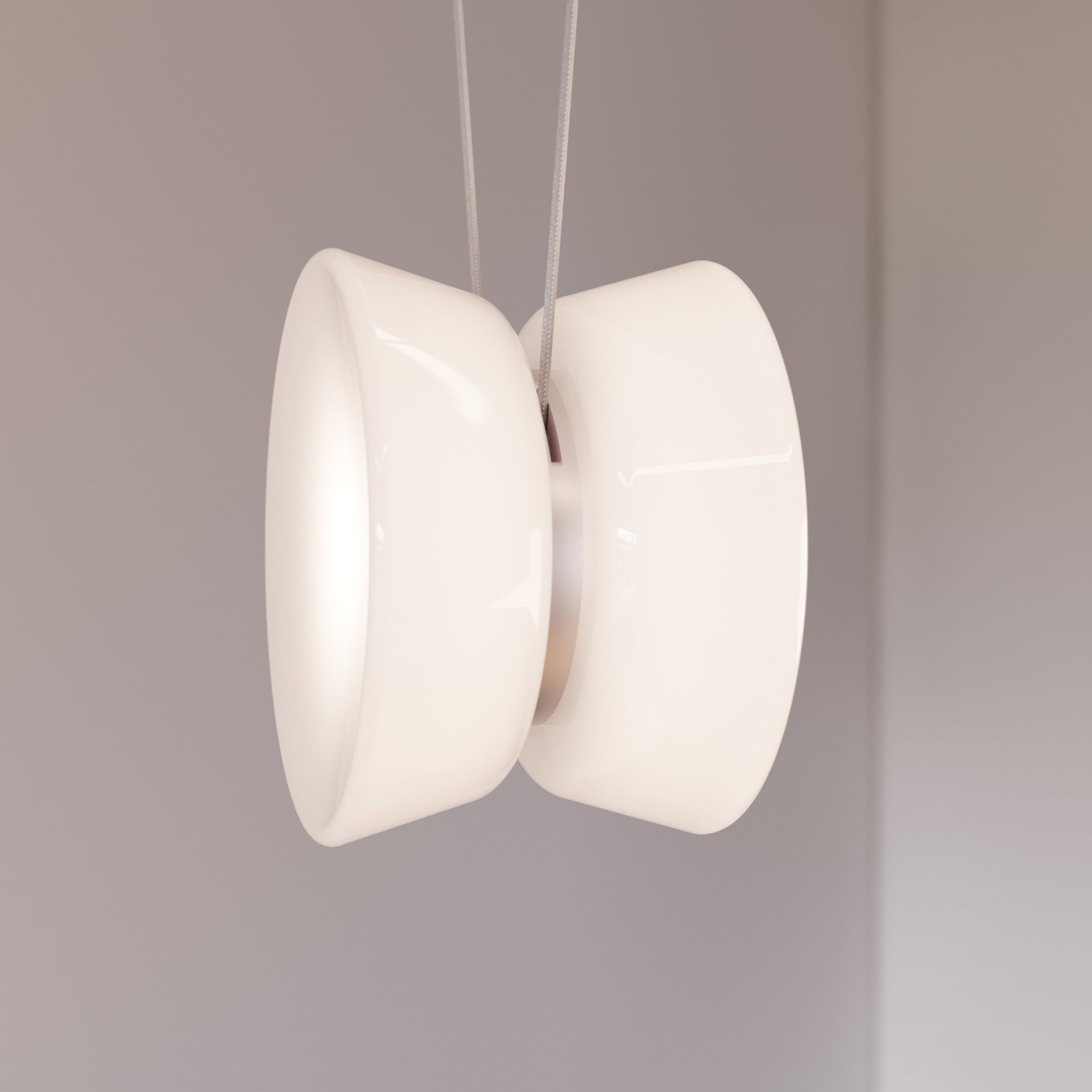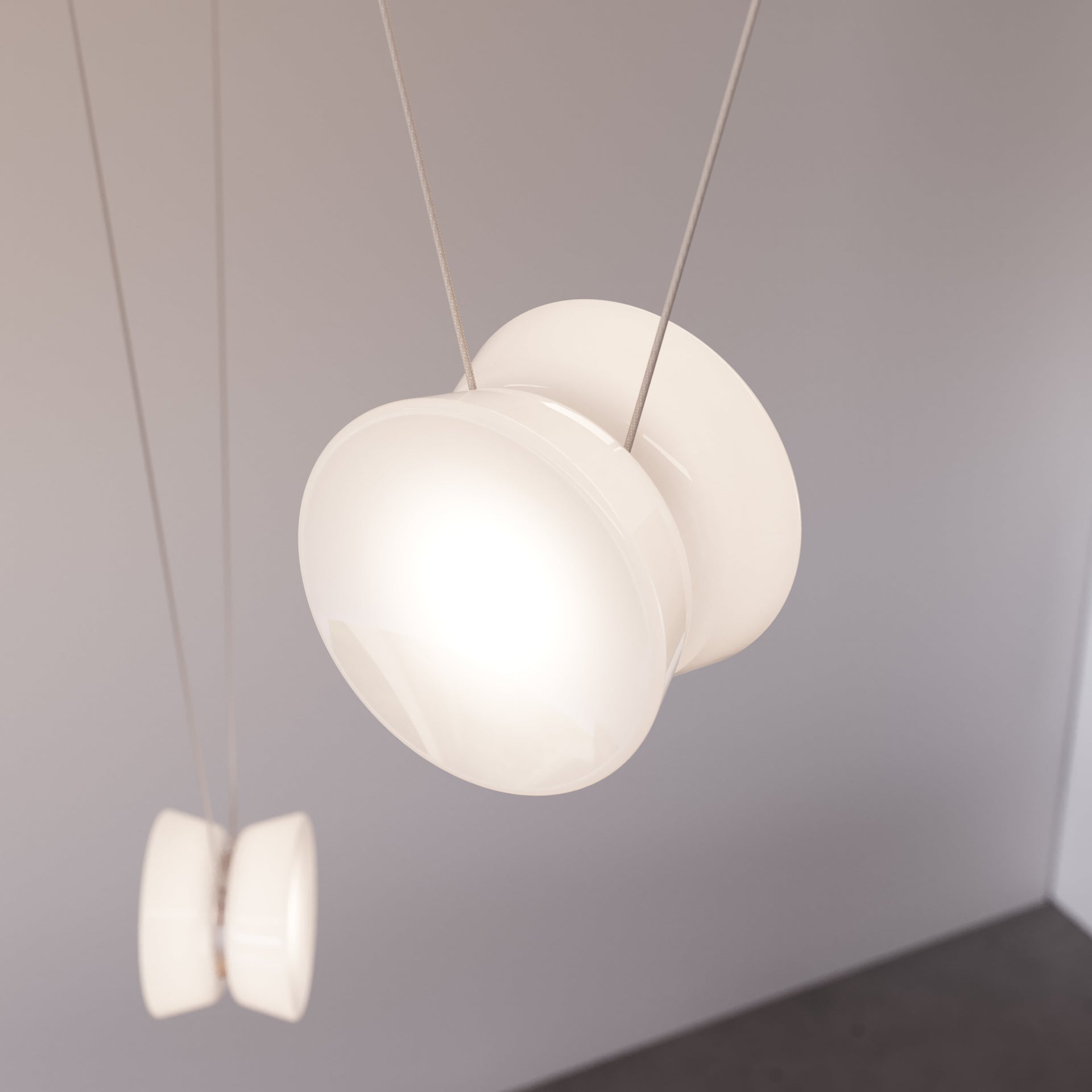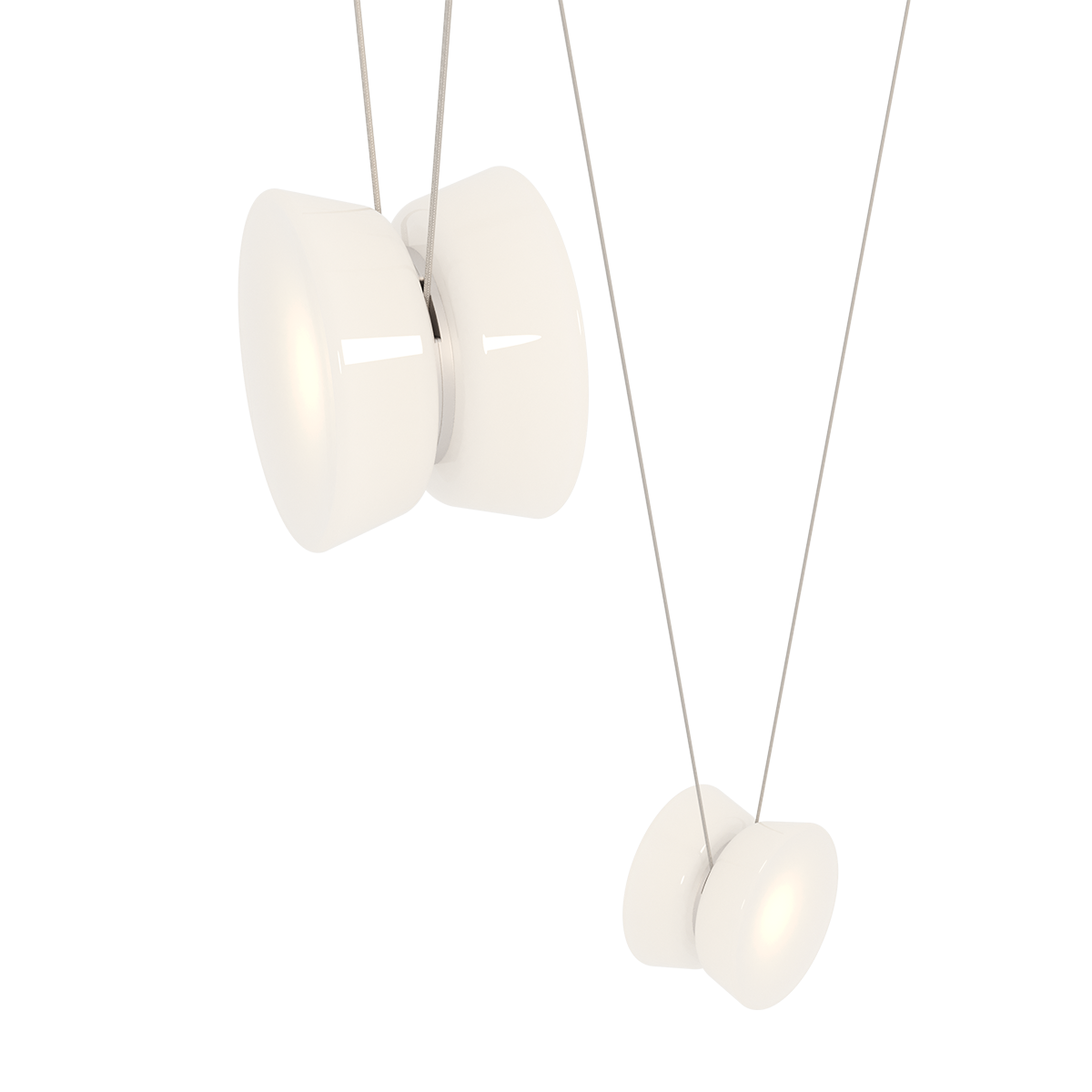 Inspired by the elegant geometry of a yo-yo, the Yo family of chandeliers transforms playful forms into sophisticated lighting solutions. Adjustable by design, each shade glides effortlessly along its cord, adapting to spaces with ease. This allows for more focused illumination when lowered and ambient radiance when raised. The configurations come in a variety of sizes with three shade shapes and a Natural Anodized finish on the metalwork.