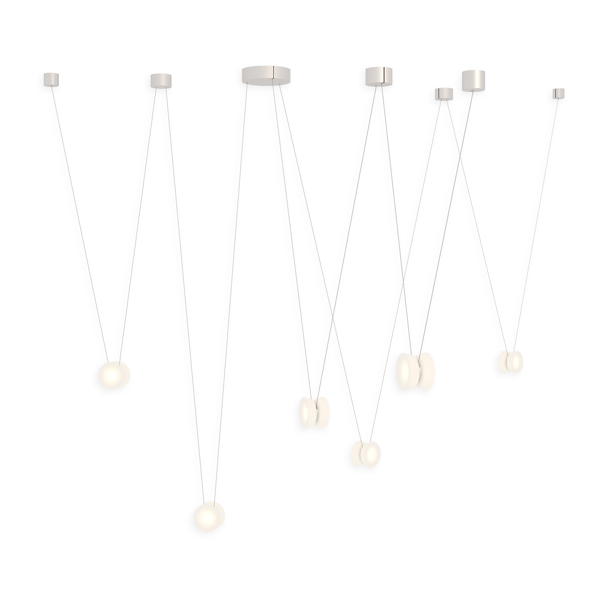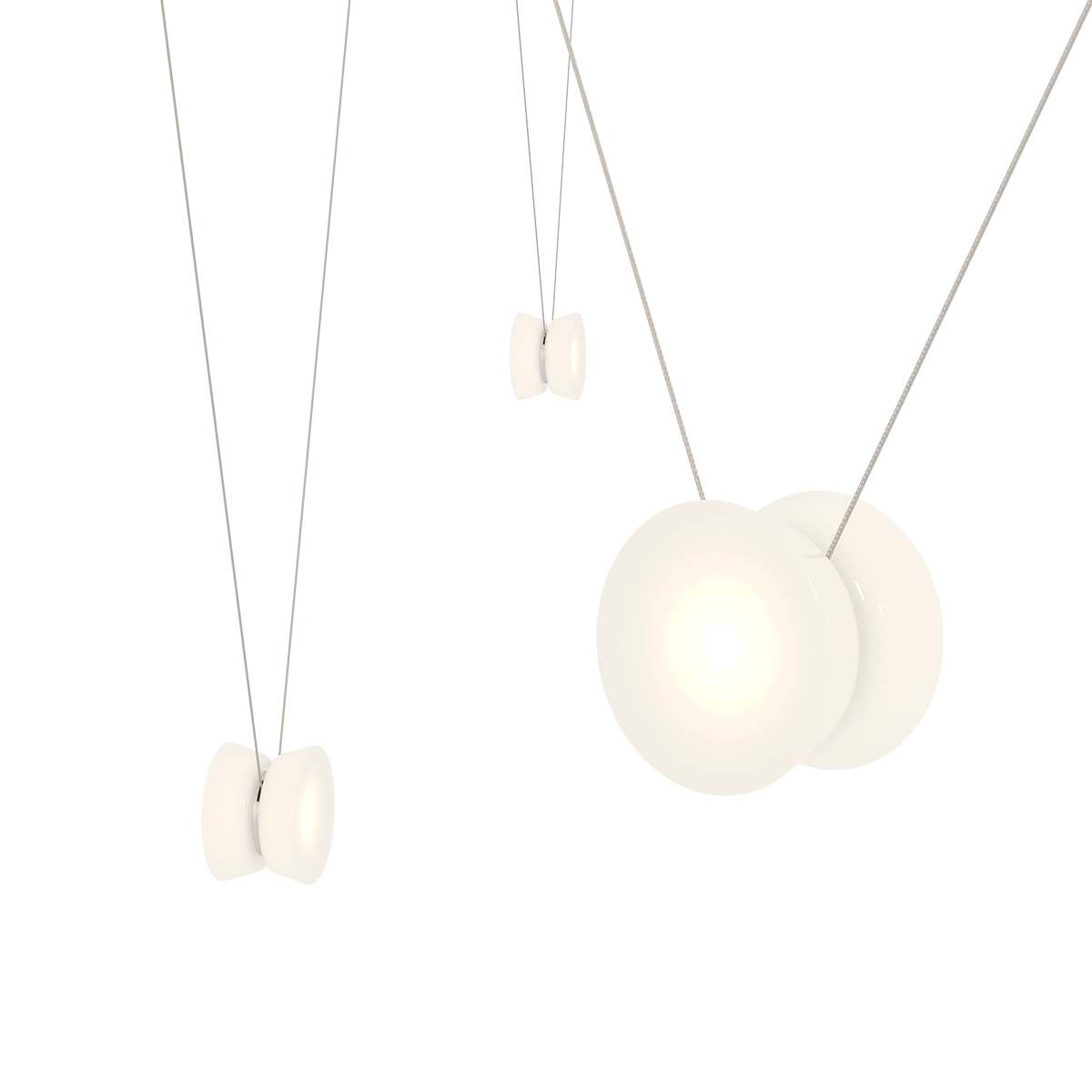 Inspired by the elegant geometry of a yo-yo, the Yo family of chandeliers transforms playful forms into sophisticated lighting solutions. Adjustable by design, each shade glides effortlessly along its cord, adapting to spaces with ease. This allows for more focused illumination when lowered and ambient radiance when raised. The configurations come in a variety of sizes with three shade shapes and a Natural Anodized finish on the metalwork.