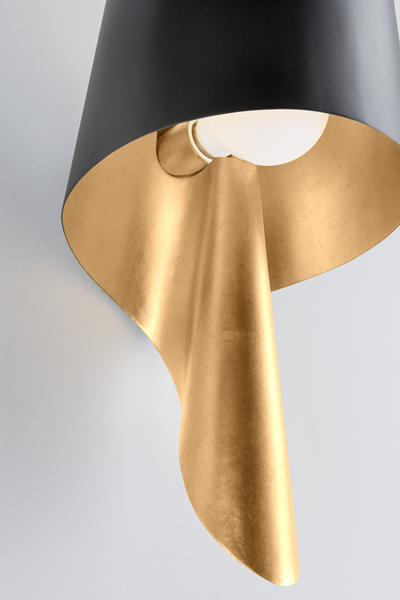 A dramatic material mix of Vintage Gold Leaf and Soft Black combines with a unique silhouette to give this sconce a sculptural, artistic aesthetic. The wave-like, draped shape adds movement and the interior Vintage Gold Leaf picks up the light to cast a soft, soothing glow.