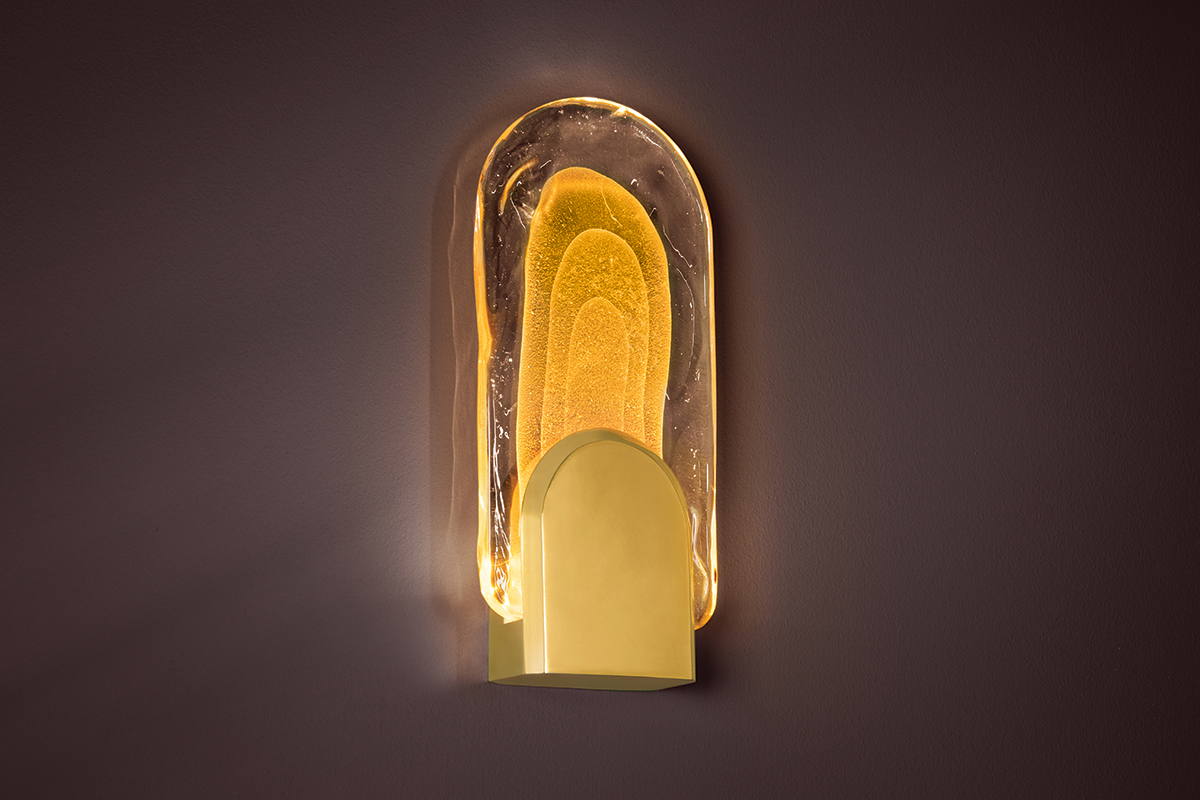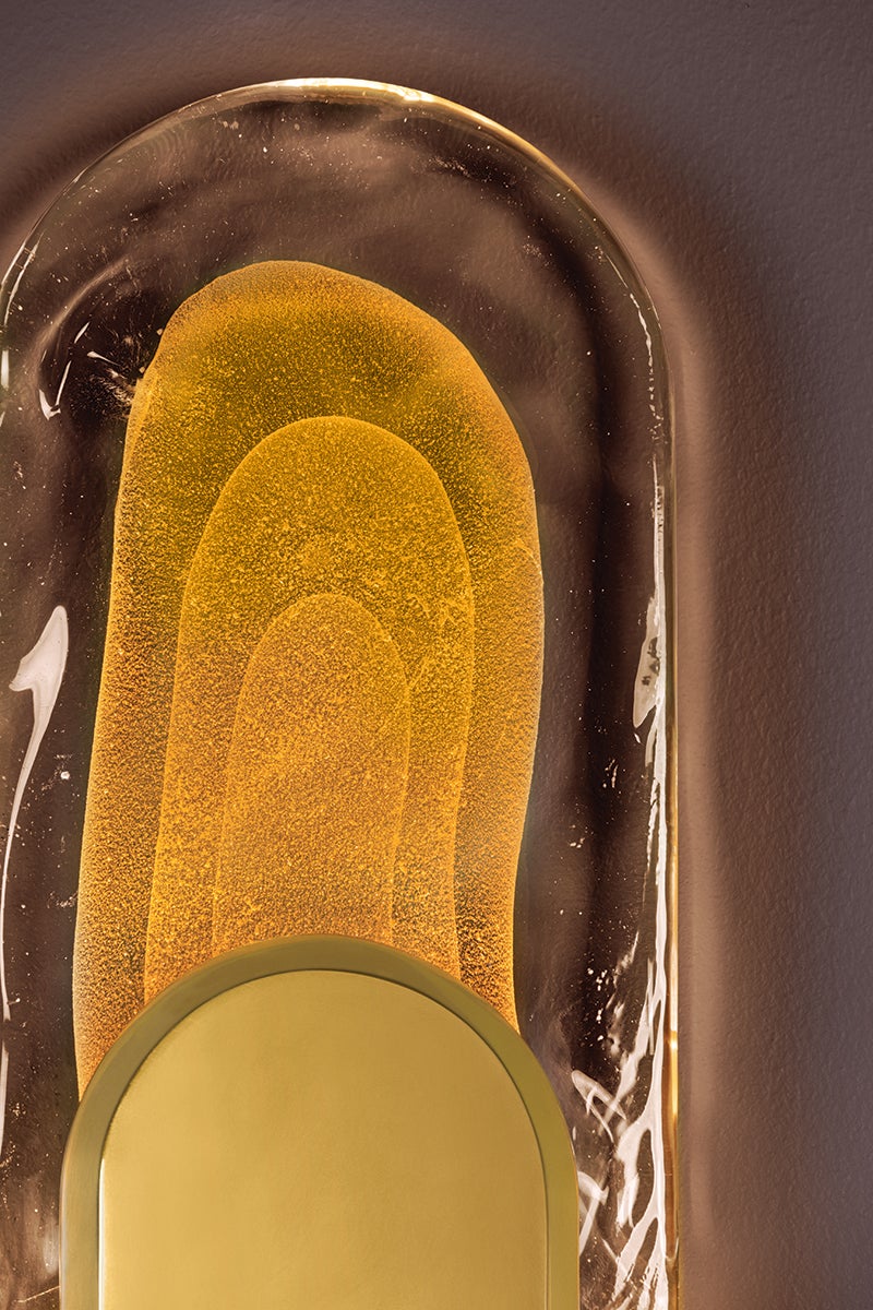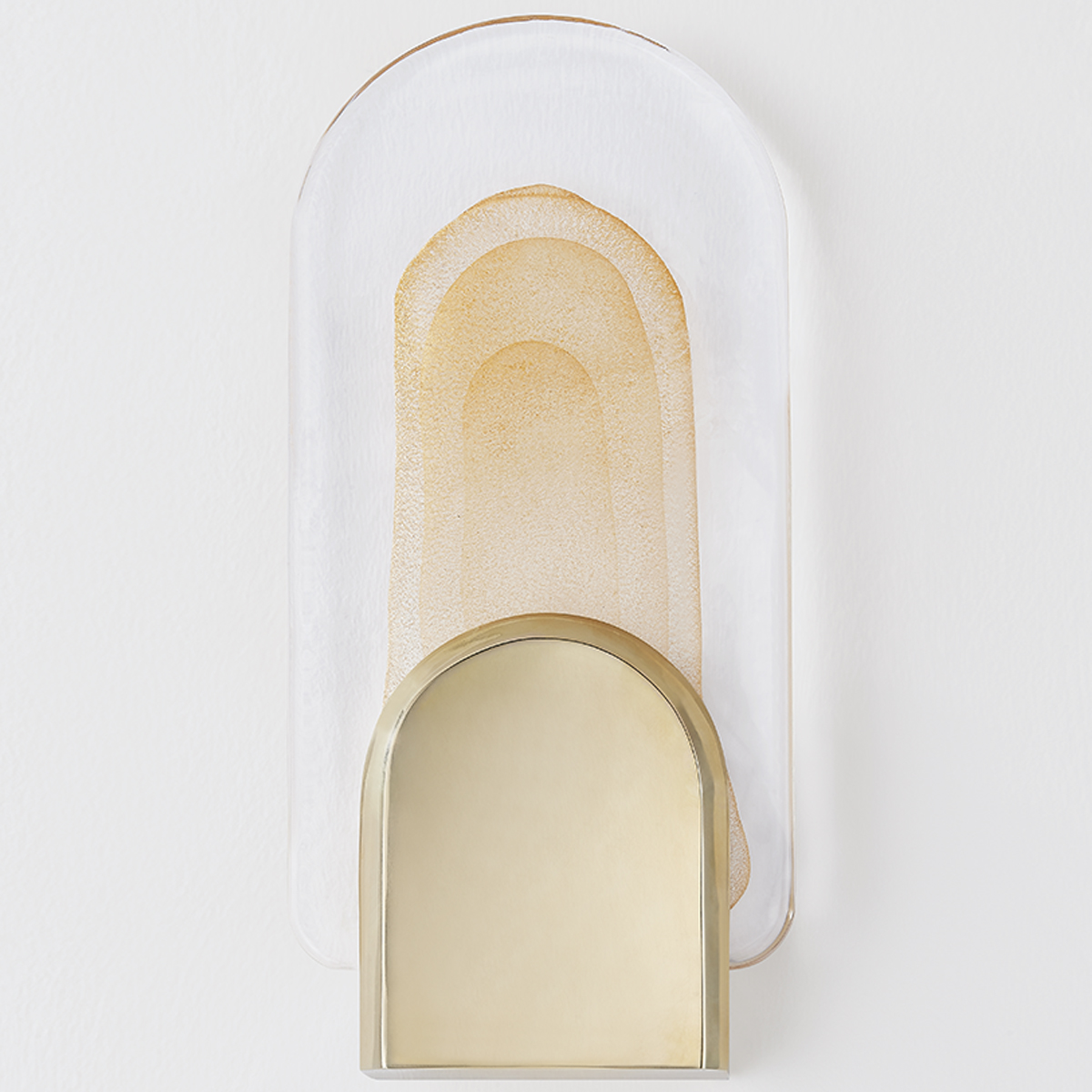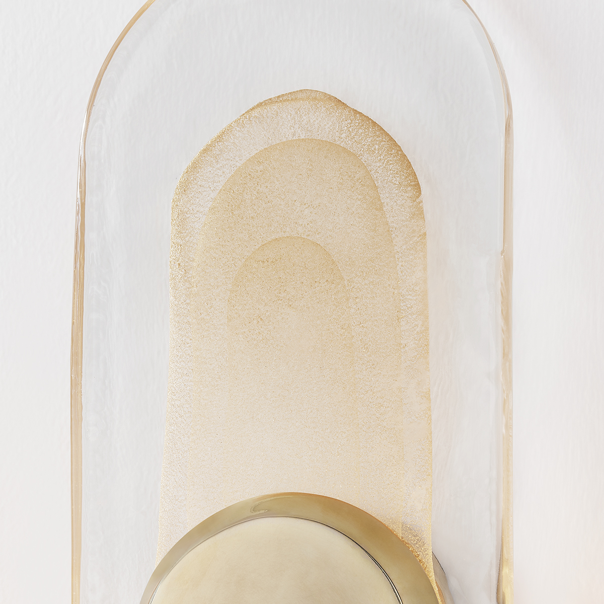 This beautiful modern sconce features a rounded piece of clear cast glass displayed within a smooth Vintage Brass bracket. The glass has layers of bubbles that fill with light from the LED below to produce a warm, unique glow that is simply stunning. No two gold dustings are alike, every wall sconce will be unique in its own visual character.