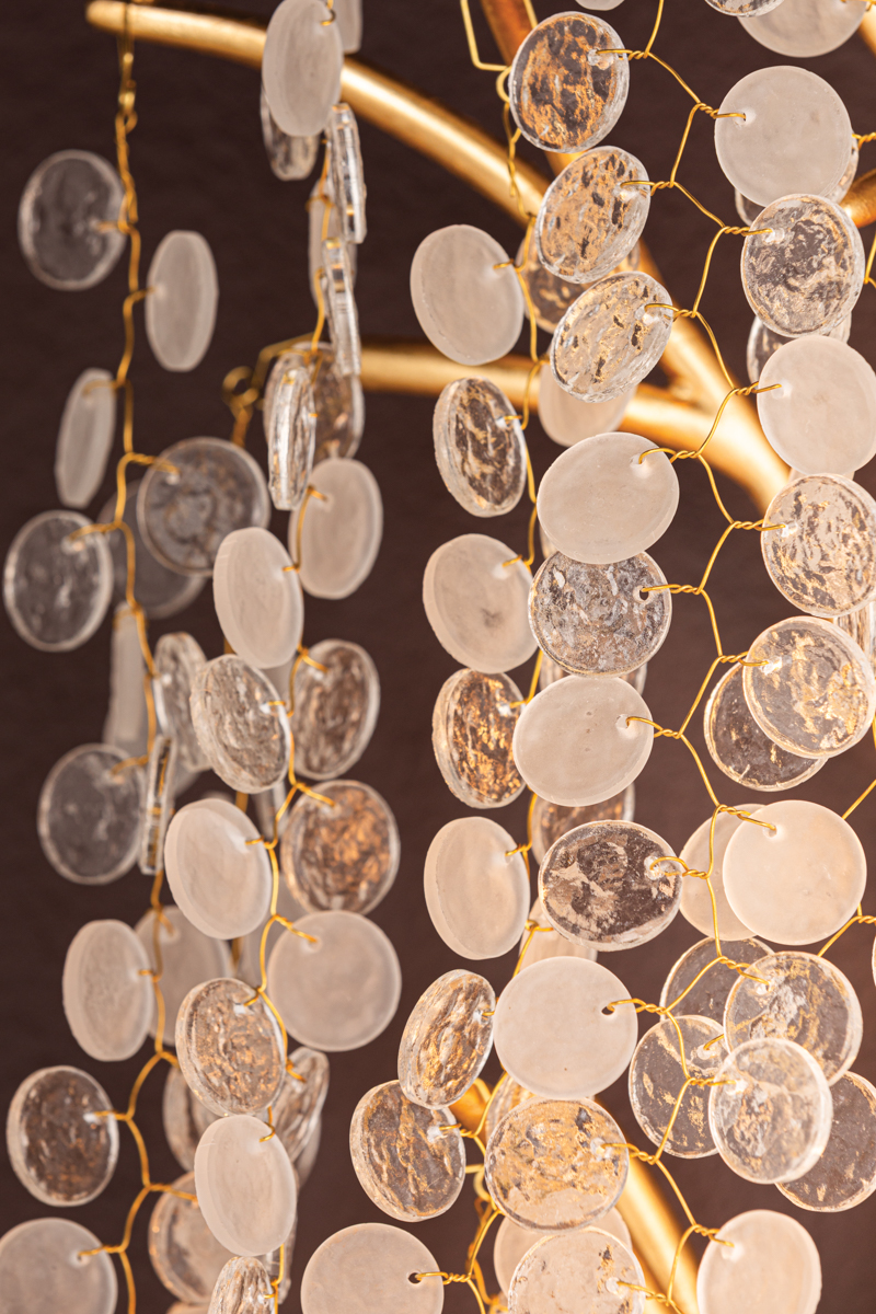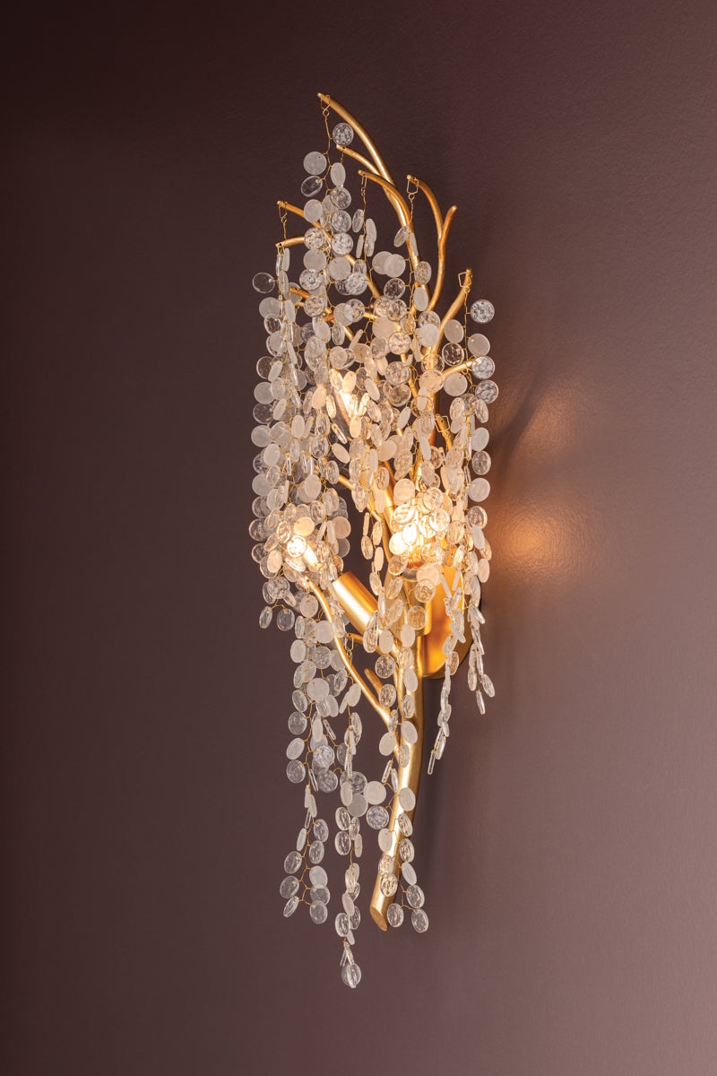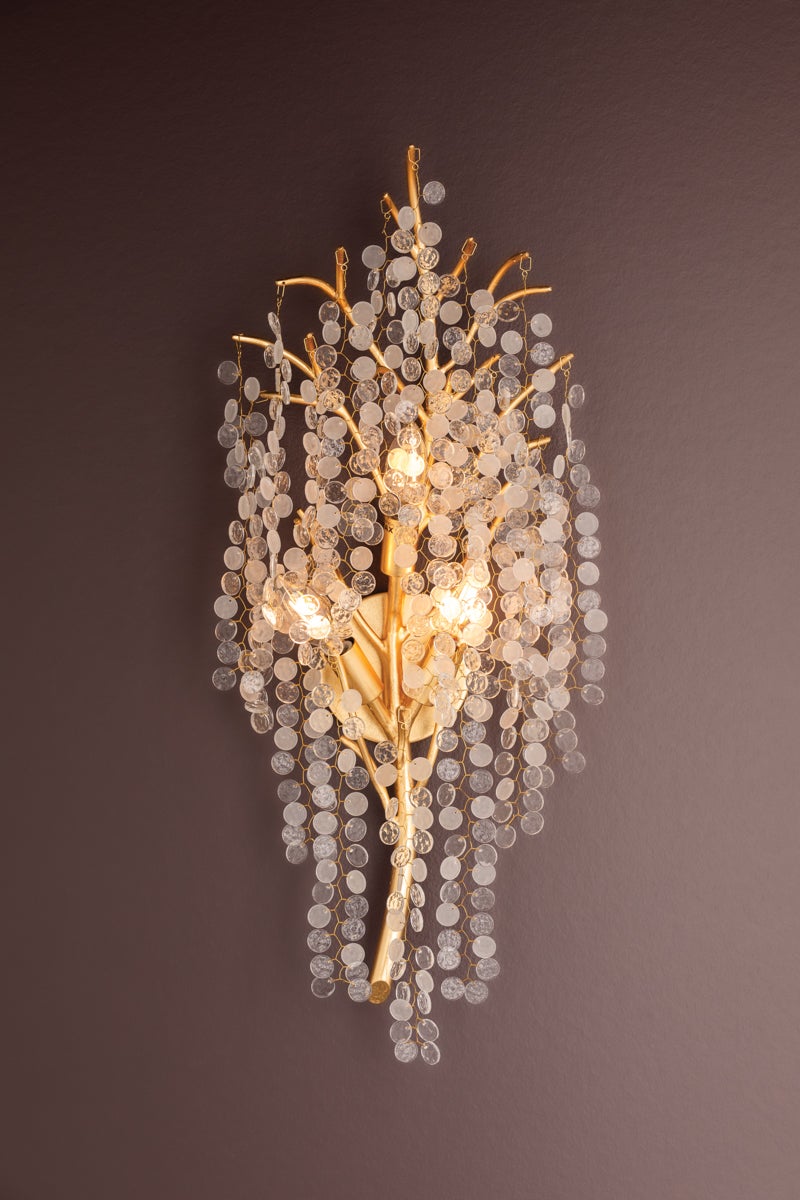 Individual drops of clear and frosted glass are intricately strung through delicate threads of Gold Leaf for a striking, weeping willow-inspired silhouette. Thicker Gold Leaf arms act as branches, suspending varying lengths of the glass strands to create a calming, cascading effect. Available as a wall sconce, pendant, and chandelier.