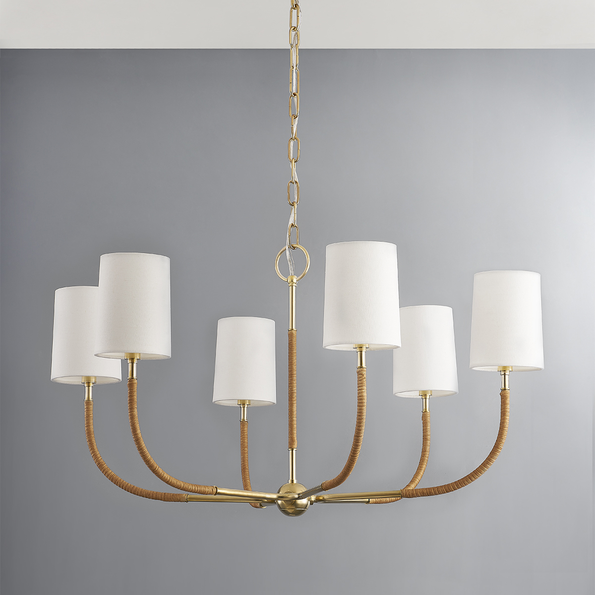 Webson's classic silhouette, swooping Aged Brass arms, and rounded white linen shades are accented by natural rattan wrapping for a soft organic feel. Available as a chandelier and 2-light wall sconce.