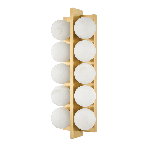 Drawing inspiration from Art Deco jewelry design and playing with shape, symmetry and repetition, this chic sconce features pairs of alabaster globes on a rectangular metal backplate separated by a metal spine at the center. The globes reflect off the Vintage Brass or Polished Nickel finish, creating a mirror-like feel and the alabaster gives off a soft light.