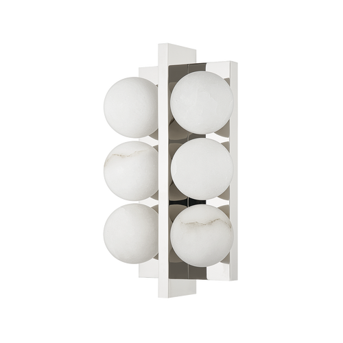 Drawing inspiration from Art Deco jewelry design and playing with shape, symmetry and repetition, this chic sconce features pairs of alabaster globes on a rectangular metal backplate separated by a metal spine at the center. The globes reflect off the Vintage Brass or Polished Nickel finish, creating a mirror-like feel and the alabaster gives off a soft light.