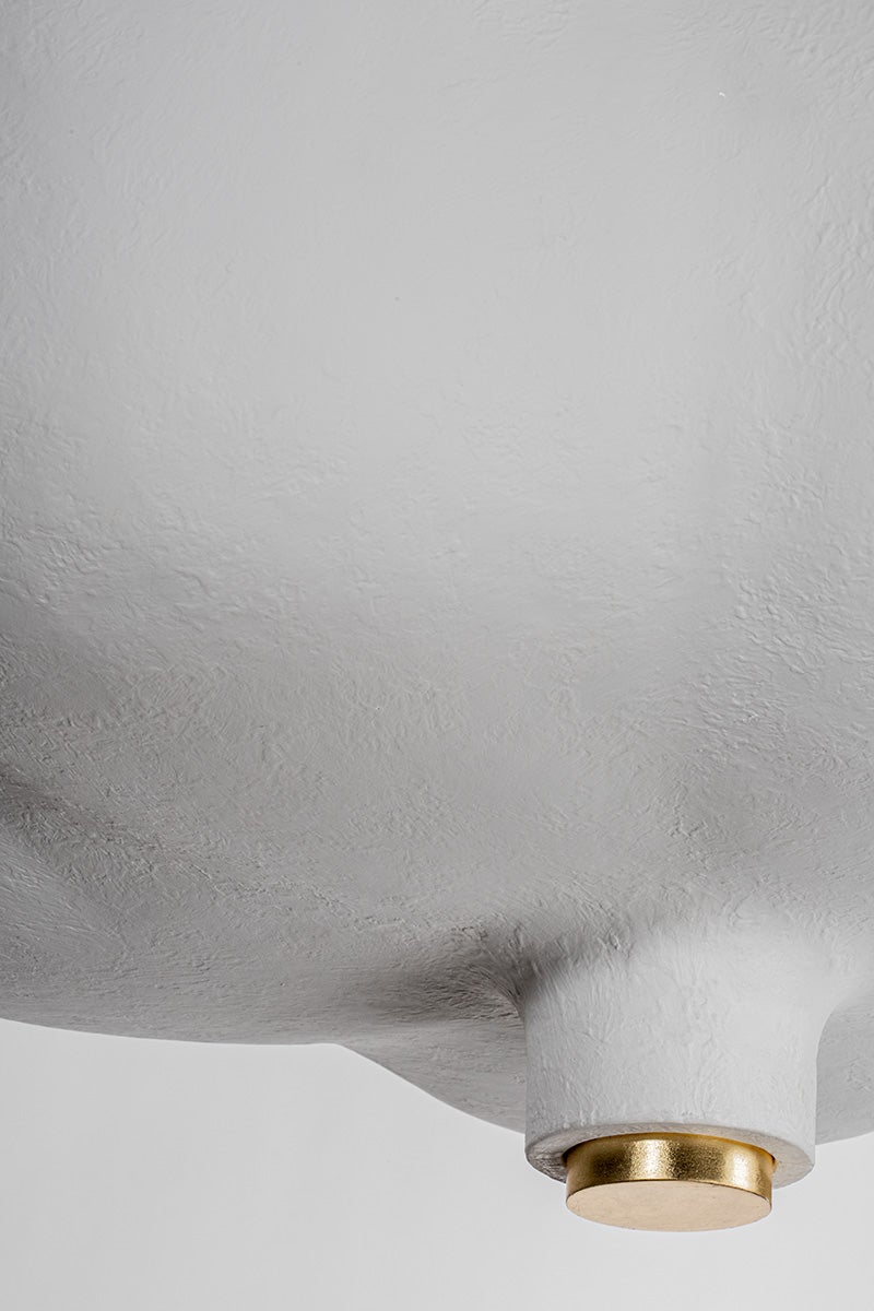 Rimini pairs an organic shape with modern materials. A White Gesso shade with a botanical form suspends from a similarly shaped canopy. The tapered light source above the shade emits a warm uplight. Thoughtfully placed Gold Leaf finishes at the finial, arm and canopy pop against the White Gesso and stand out on a white ceiling.