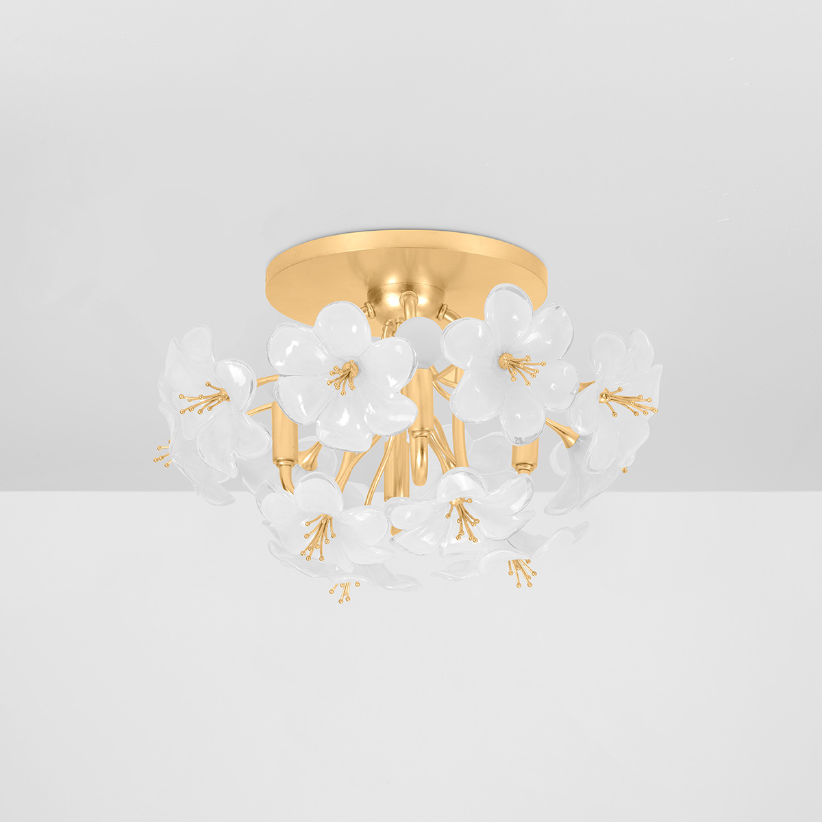 An airy spray of white glass flowers forms the cloud-like silhouette of Hygea. Gold Leaf arms act as stems, supporting the delicate blooms as they gently diffuse light. Available as a wall sconce, flush mount, or chandelier in two sizes, Hygea casts a bright glow over modern interiors.