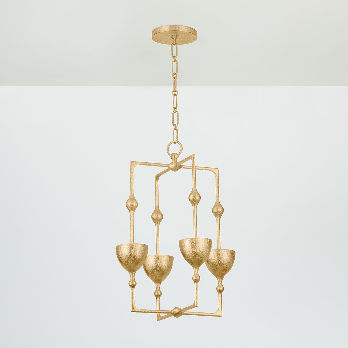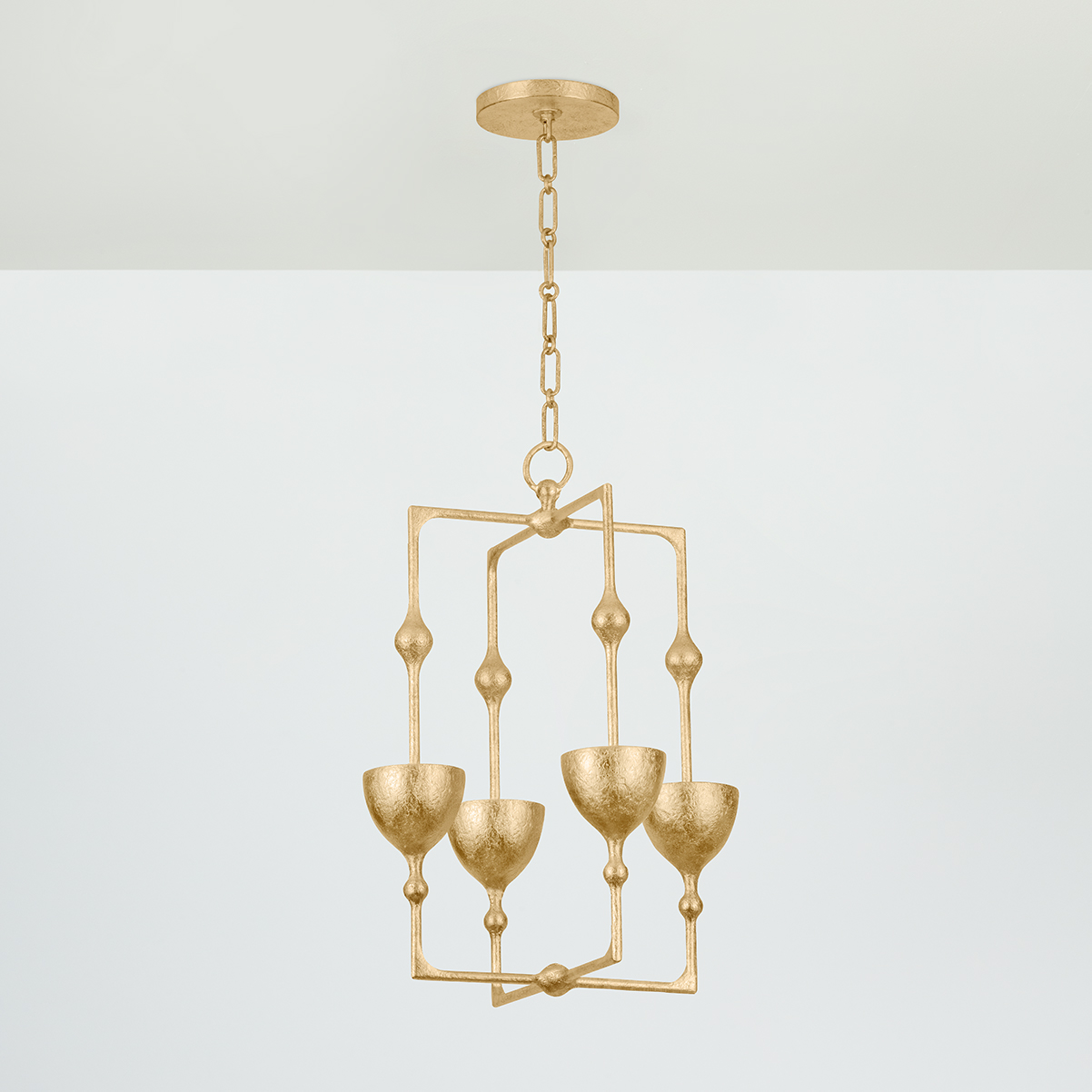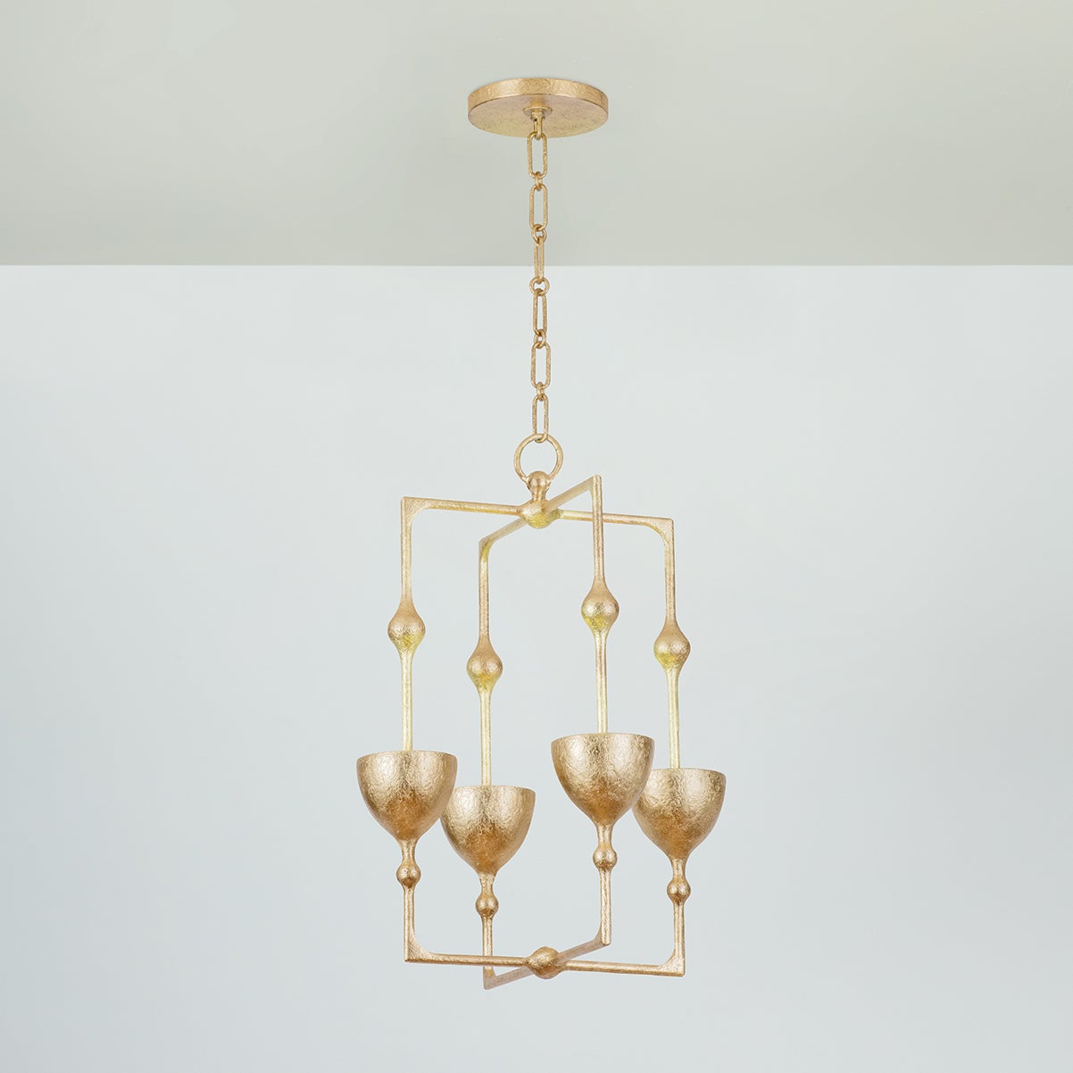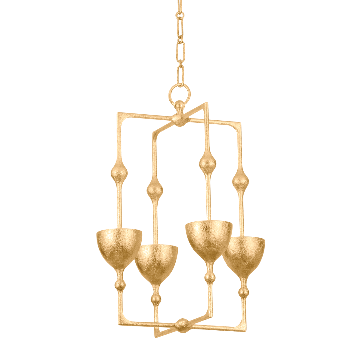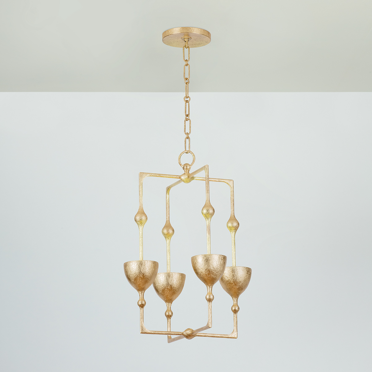 Drawing inspiration from the geometric patterns of Turkish tiles, this LED fixture merges high-concept design with otherworldly beauty. Long biomorphic stems support inverted bowl shades that direct light upwards. Available as a sconce or lantern in two sizes with the choice of a fresh Gesso White or luxurious Vintage Gold Leaf finish.