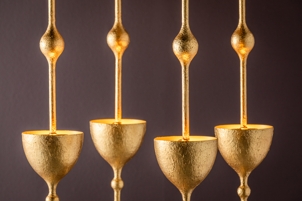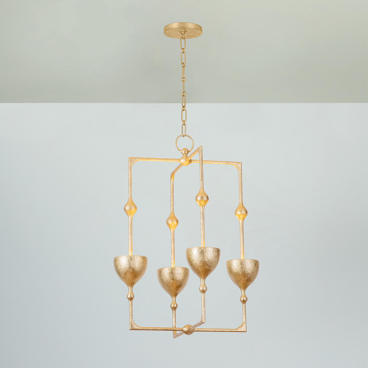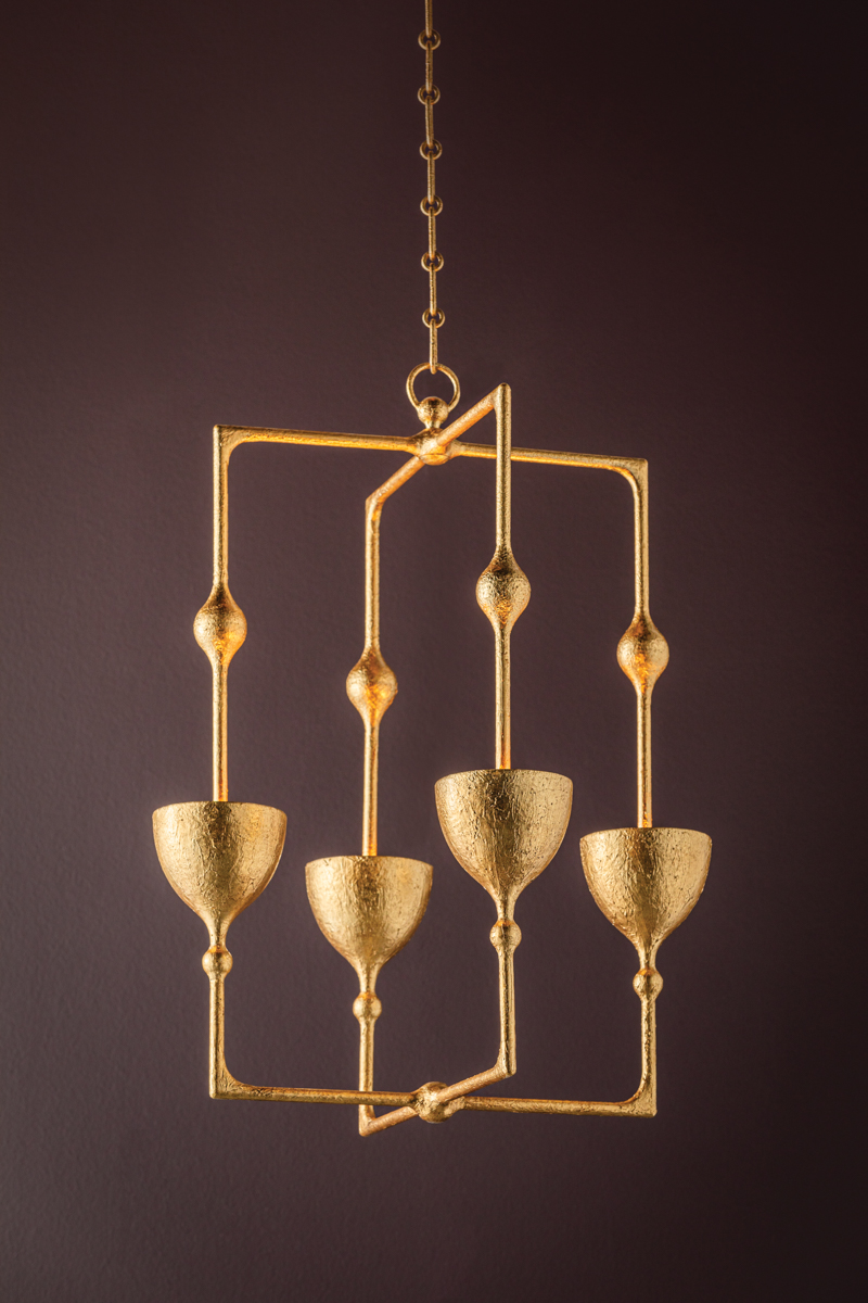 Drawing inspiration from the geometric patterns of Turkish tiles, this LED fixture merges high-concept design with otherworldly beauty. Long biomorphic stems support inverted bowl shades that direct light upwards. Available as a sconce or lantern in two sizes with the choice of a fresh Gesso White or luxurious Vintage Gold Leaf finish.