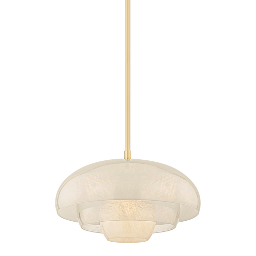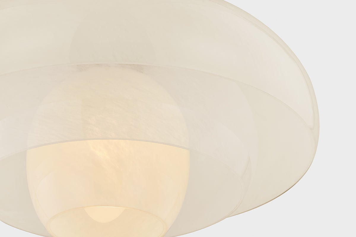 Three nested mushroom shades create the voluminous silhouette of the Auburndale pendant. The layering of clear cloud glass provides levels of ethereal diffusion, softening the light for a more gentle, ambient glow. The metal stem is available in two finishes: Aged Brass for a warm, classic look or Polished Nickel for a more contemporary feel.