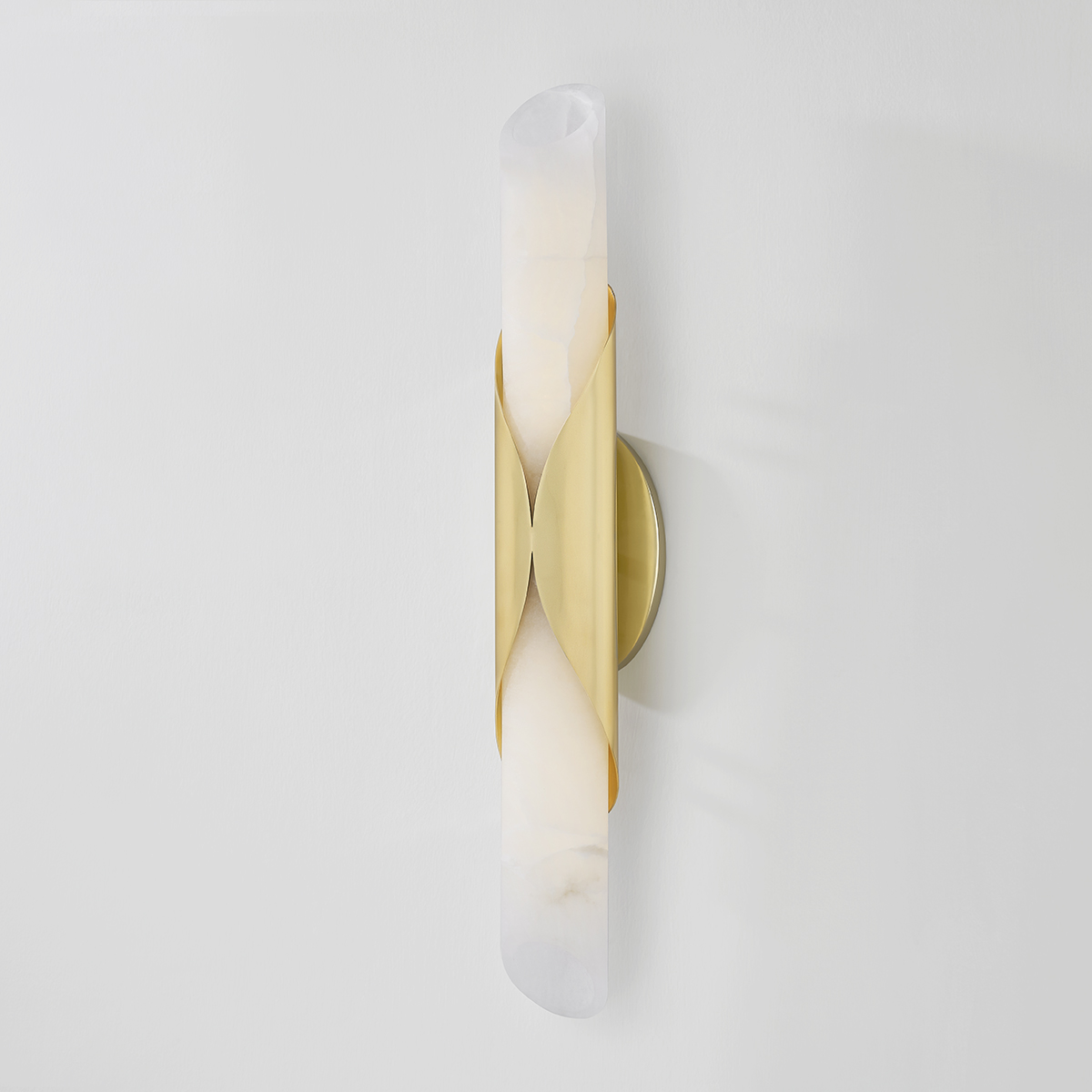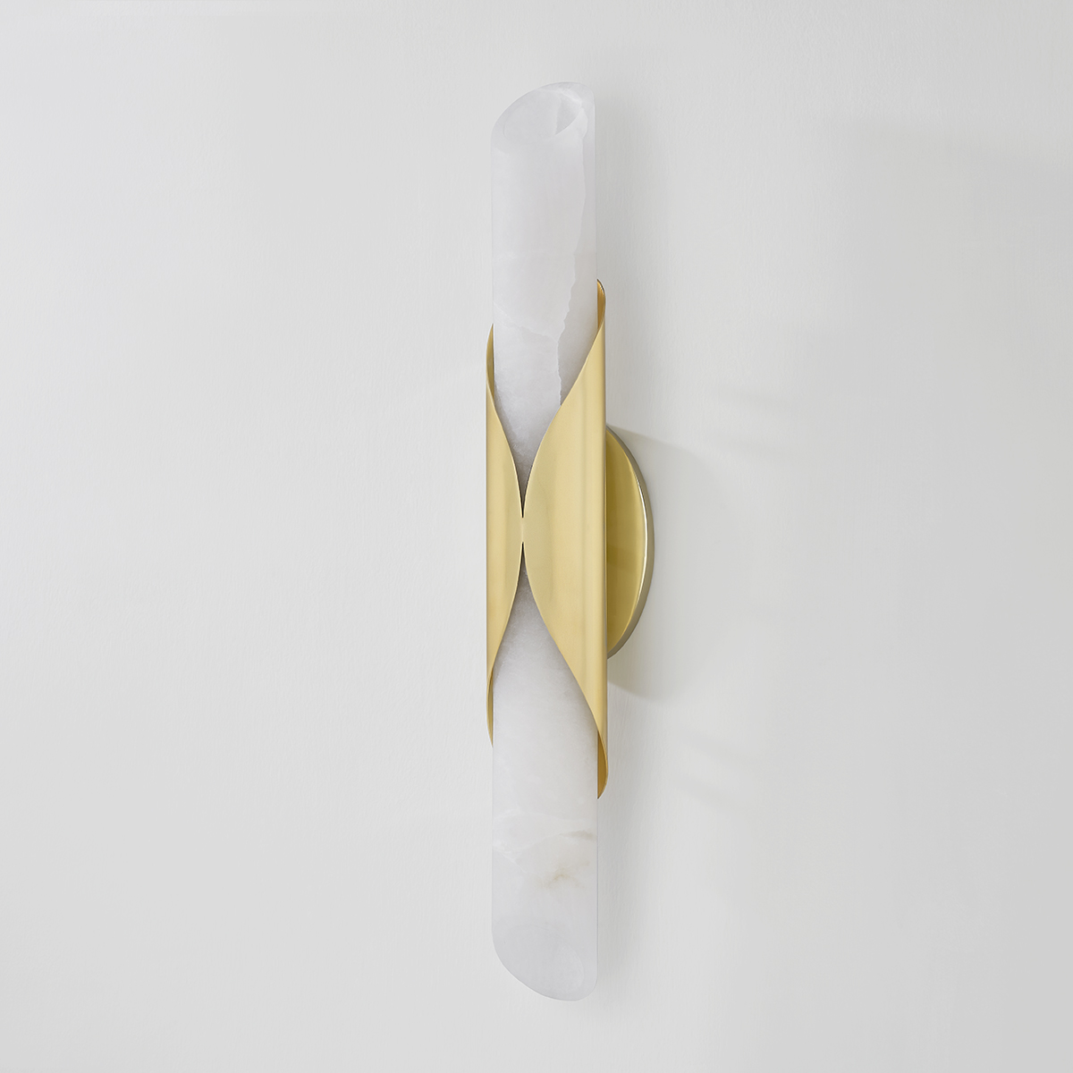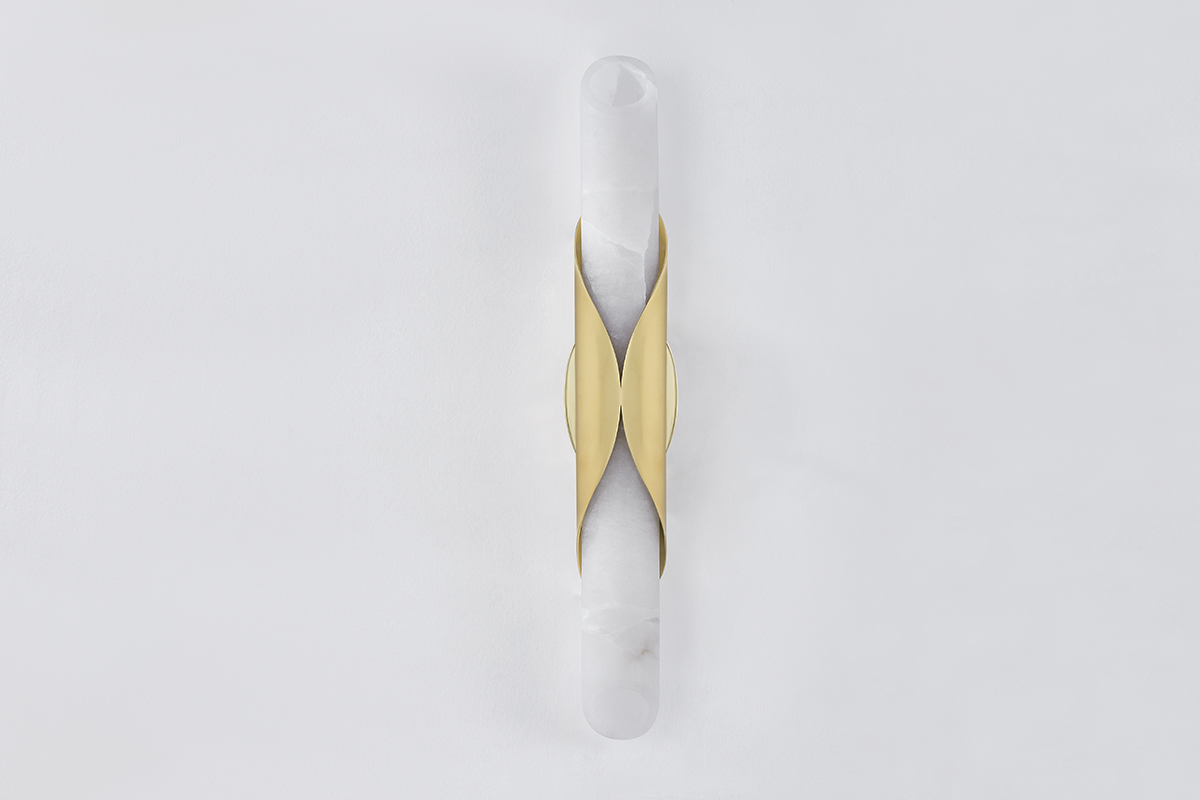 Embodying easy elegance, Camilla explores the relationship between natural stone and sleek metal. A translucent alabaster tube is wrapped by timeless Vintage Brass forms that resemble leaves. Paying homage to nature through both materiality and form, this sconce emanates serenity from within.