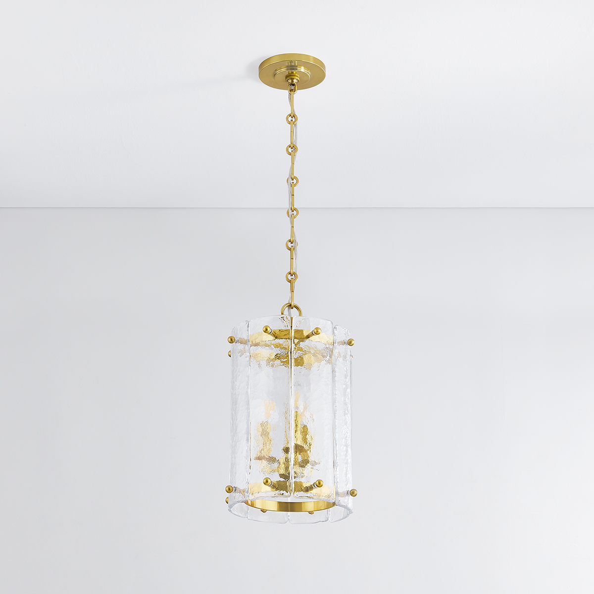 With hand-blown Piastra glass, this statement pendant reimagines a traditional lantern as an aquatic vision. Resembling water, the rippled glass silhouette diffuses and reflects the light coming from within. Vintage Brass pins and chains suspend the fixture, bringing a sense of the old world to the contemporary materiality. Available in three sizes as a lantern or as a flush mount.