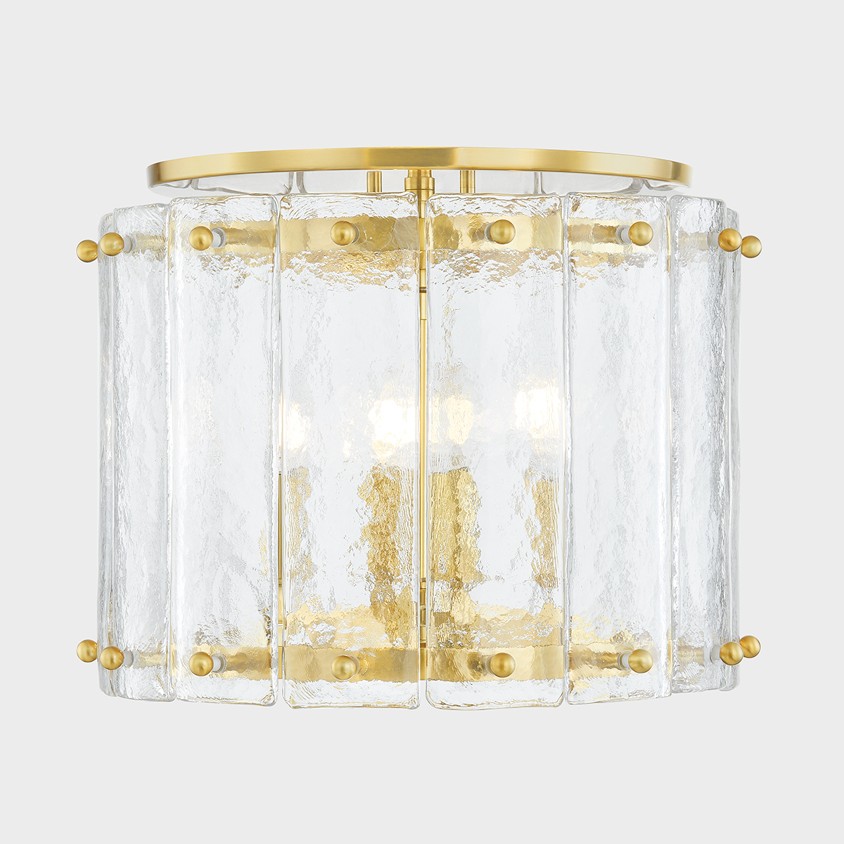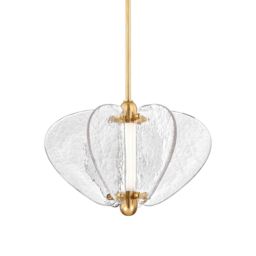 With hand-blown Piastra glass, this statement pendant reimagines a traditional lantern as an aquatic vision. Resembling water, the rippled glass silhouette diffuses and reflects the light coming from within. Vintage Brass pins and chains suspend the fixture, bringing a sense of the old world to the contemporary materiality. Available in three sizes as a lantern or as a flush mount.