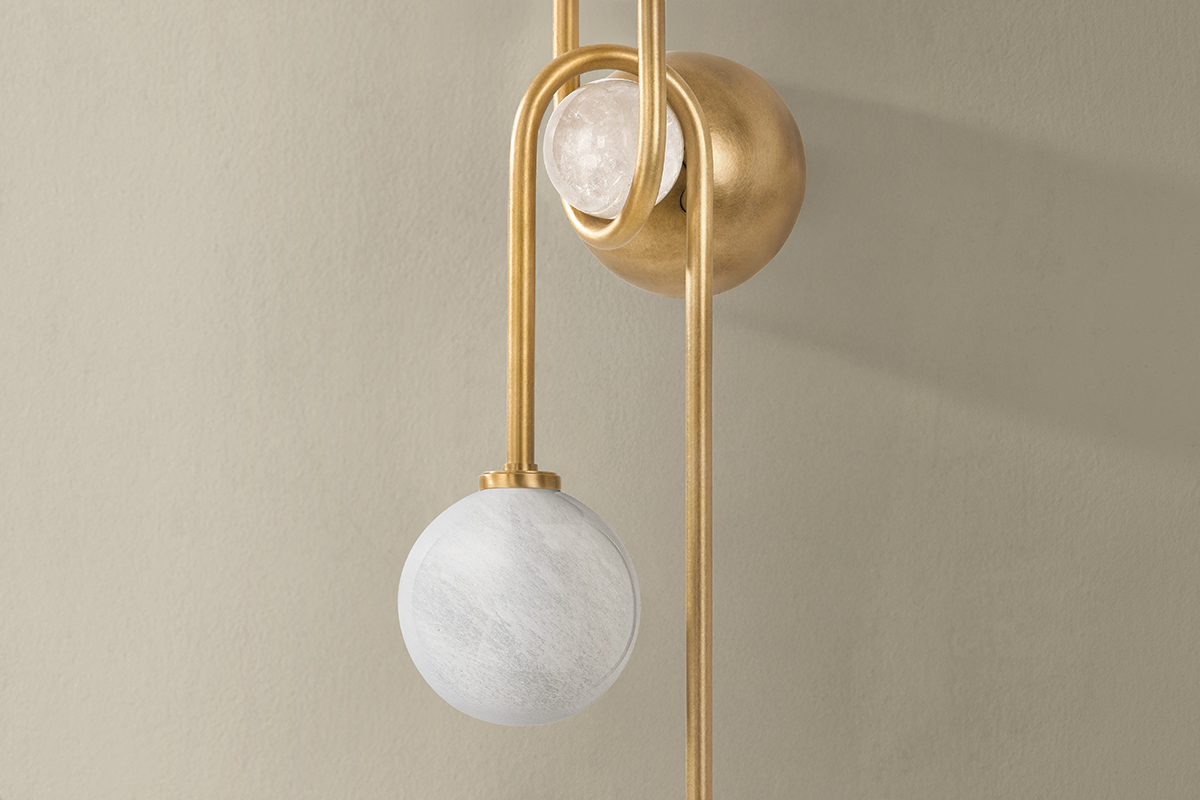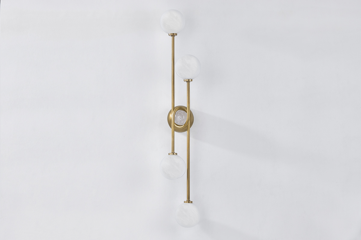 Influenced by Art Deco design, this Vintage Brass sconce brings a sense of artistry with straight lines, gentle curves, and unexpected twists. Four cloud glass globes extend from slender arms that wrap around a central knob. Etched inside, the orbs illuminate a large area with their milky glow.