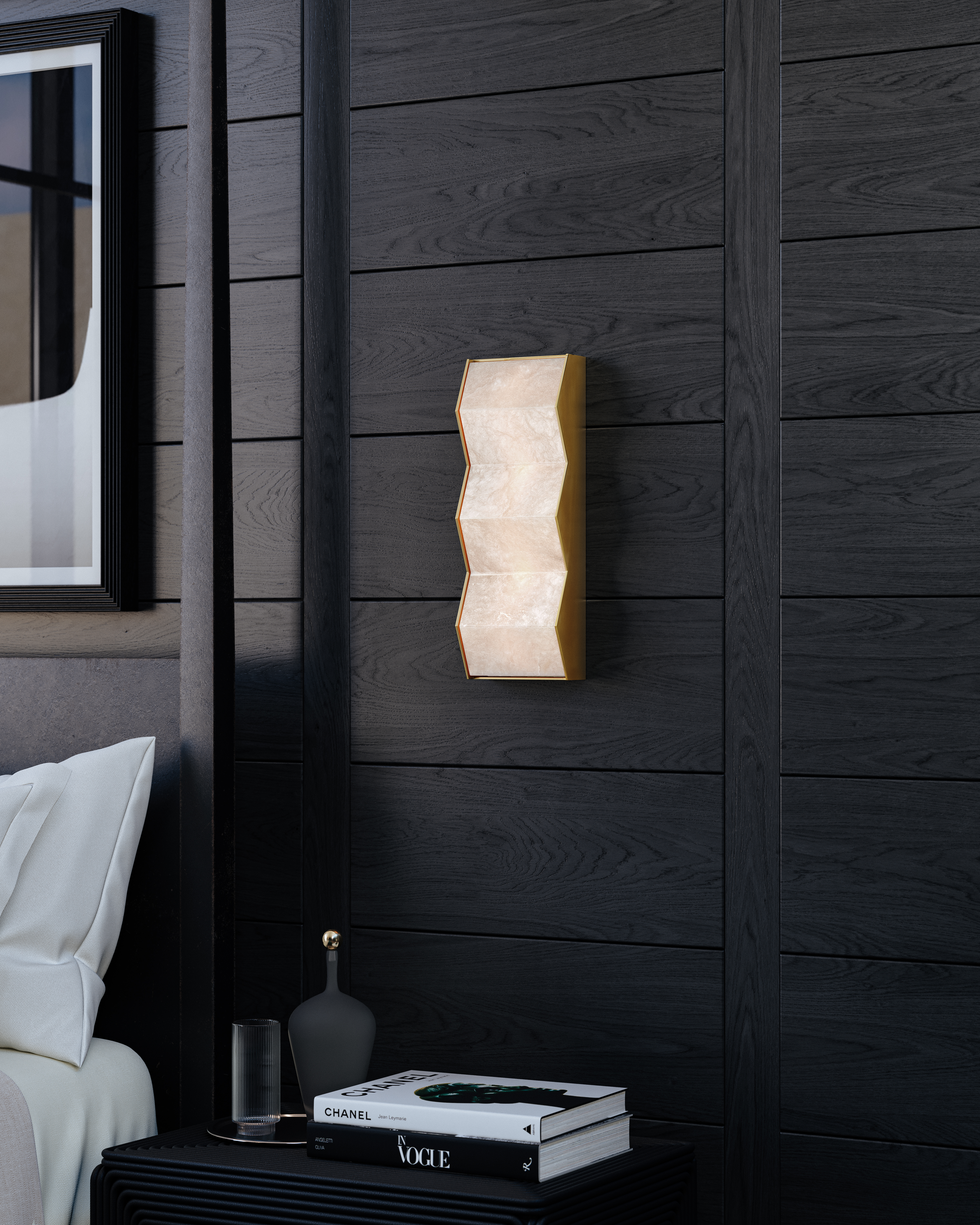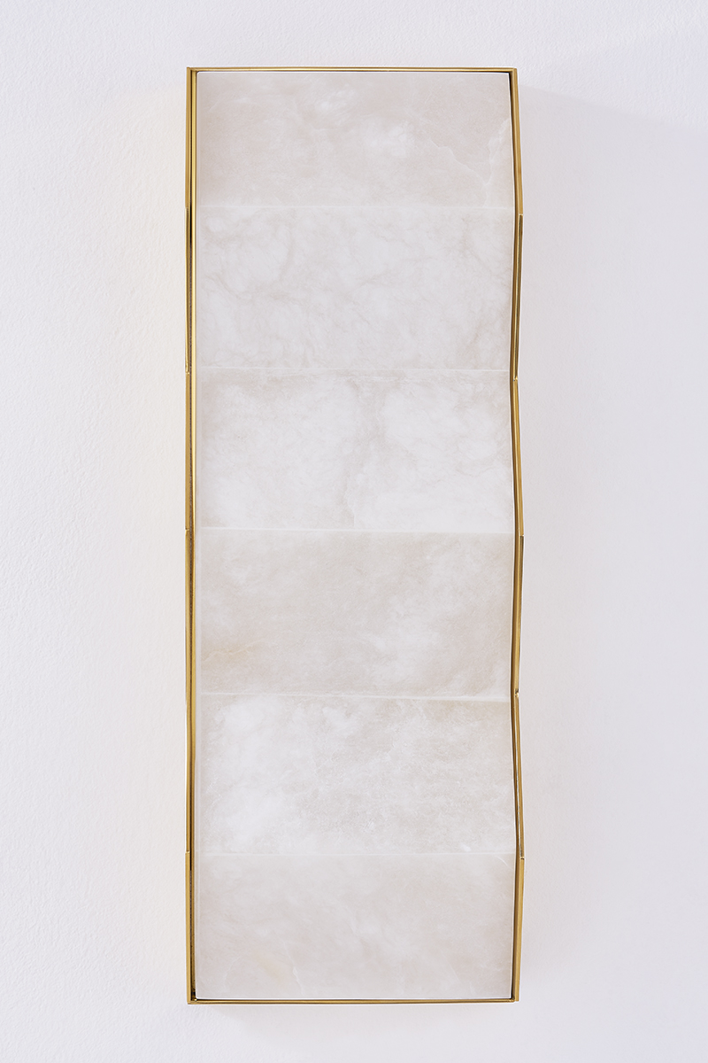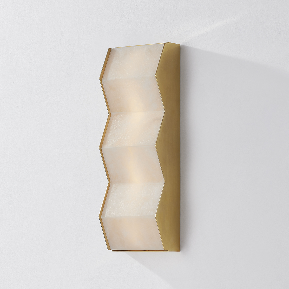 A distinctive geometric wall sculpture, Tanzanite features a folded motif of translucent alabaster. The Vintage Brass frame brings out the warm tonal variations found in the alabaster while adding a metallic contrast to the natural stone. Whether the sconce is illuminated or not, the juxtaposition of materiality makes a poetic statement.