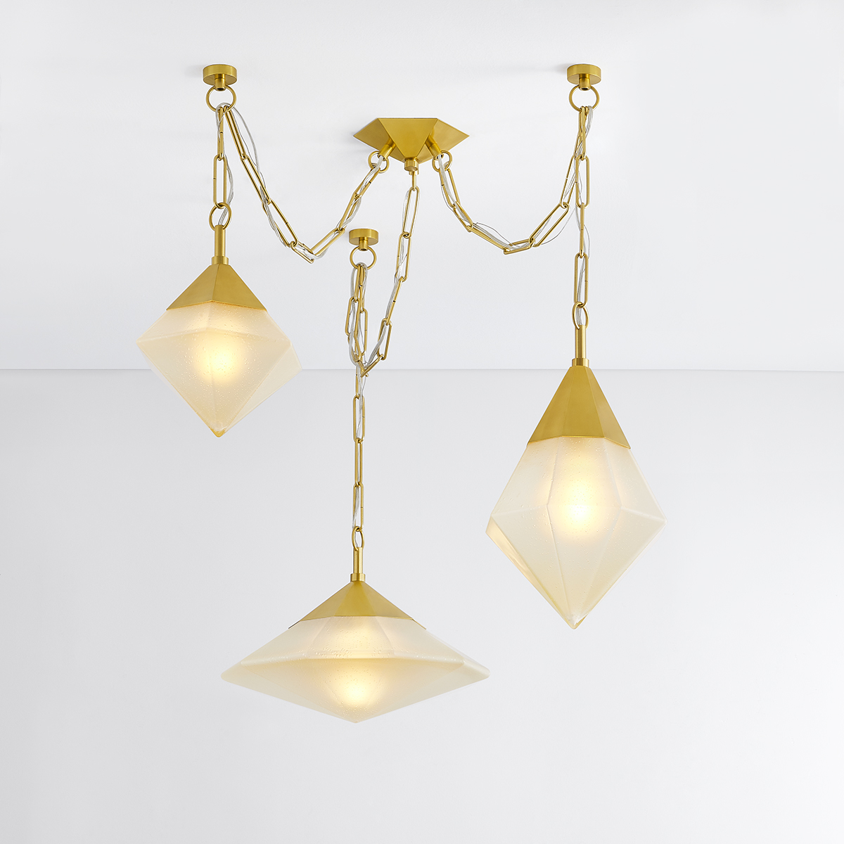 Inspired by the timeless allure of diamonds, Angelique features a cluster of geometric pendant lights with sparkling seeded glass facets. Suspended from a Vintage Brass chandelier, each pendant glows on a different level to create a luxe visual display overhead. The distinctive hand-blown glass bubbles resemble raindrops when the fixture is lit. Available in two sizes, Angelique brings an element of mysticism to interior design.