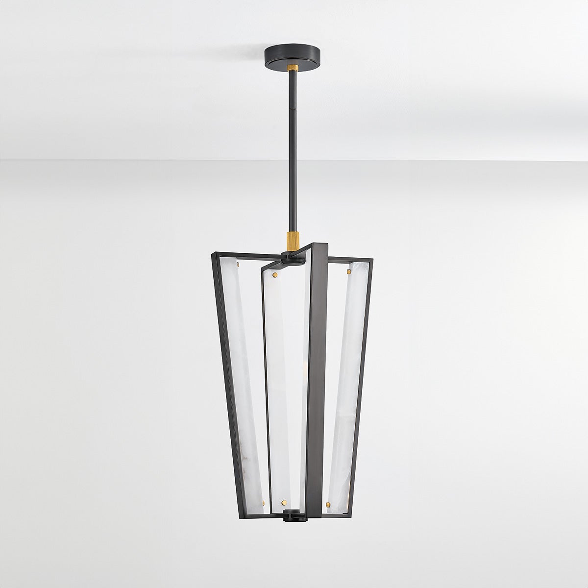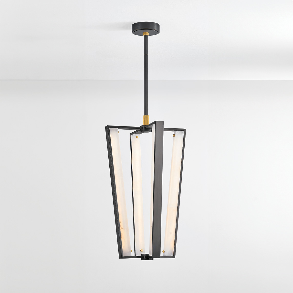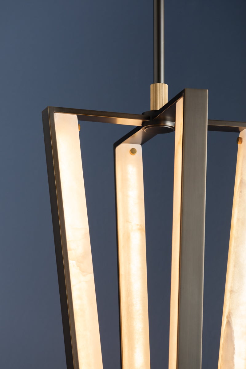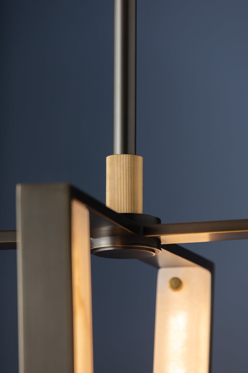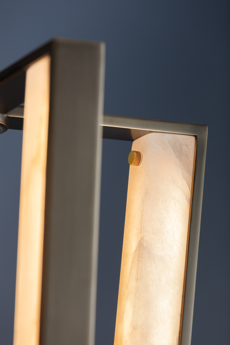 A modern ‘air lantern’ design with a bold architectural silhouette. In lieu of a central light source, LED strips are integrated into the cage of Edgemere itself. A rectangular panel of alabaster is attached to each arm, creating a geometric array of light within the piece. The sleek mixed materiality feels grand and traditional with a futuristic edge. Available in a 3 or 4-light pendant in Aged Brass or Aged Brass and Distressed Bronze or a single light sconce in Aged Brass or Distressed Bronze.