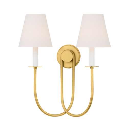 Fresh yet familiar, the Midtown sconce is a charming everyday staple with a twist – literally. While the streamlined backplate speaks to contemporary aesthetics, the fluidity of the two looping arms and traditional shades nod to antique style. Choose from crisp white linen shades and an Aged Brass finish or Garnet Linen shades with an Old Bronze finish.