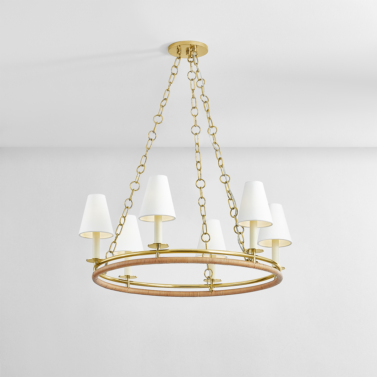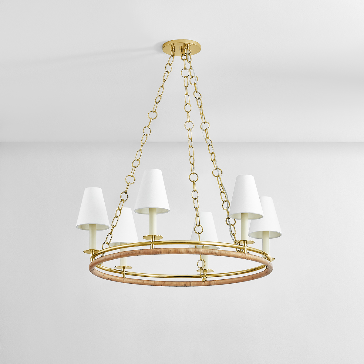A distinctive double-ring chandelier presents the opportunity to play with mixing materials. As if in conversation, the upper ring of Swanton is finished in sleek Aged Brass, while the lower is cleanly wrapped in natural rattan. Linen shades top cream candlesticks, lending the fixture a light, airy quality that feels nautical. Suspended from three large looped chains, Swanton is available as a 6 or 8-light chandelier.