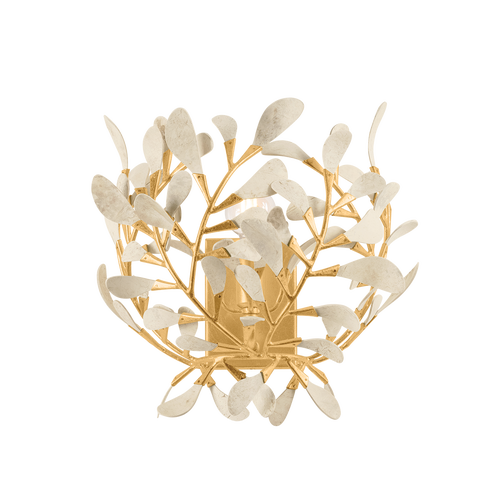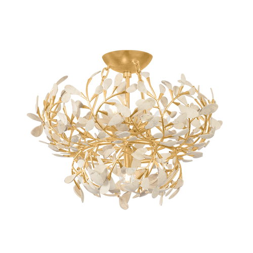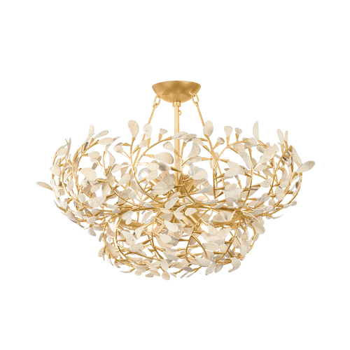 Graceful, scrolling ‘vines’ with delicate coco shell ‘petals’ wisp around to create the nest-like silhouettes of the Maybrook family. The organic beauty of the carved coco shell is paired with a Vintage Gold Leaf finish in this glamorous ode to nature. Whether as a sconce, semi-flush mount, or chandelier in two sizes, Maybrook’s silhouette is voluminous and radiant, creating an enchanting focal point.