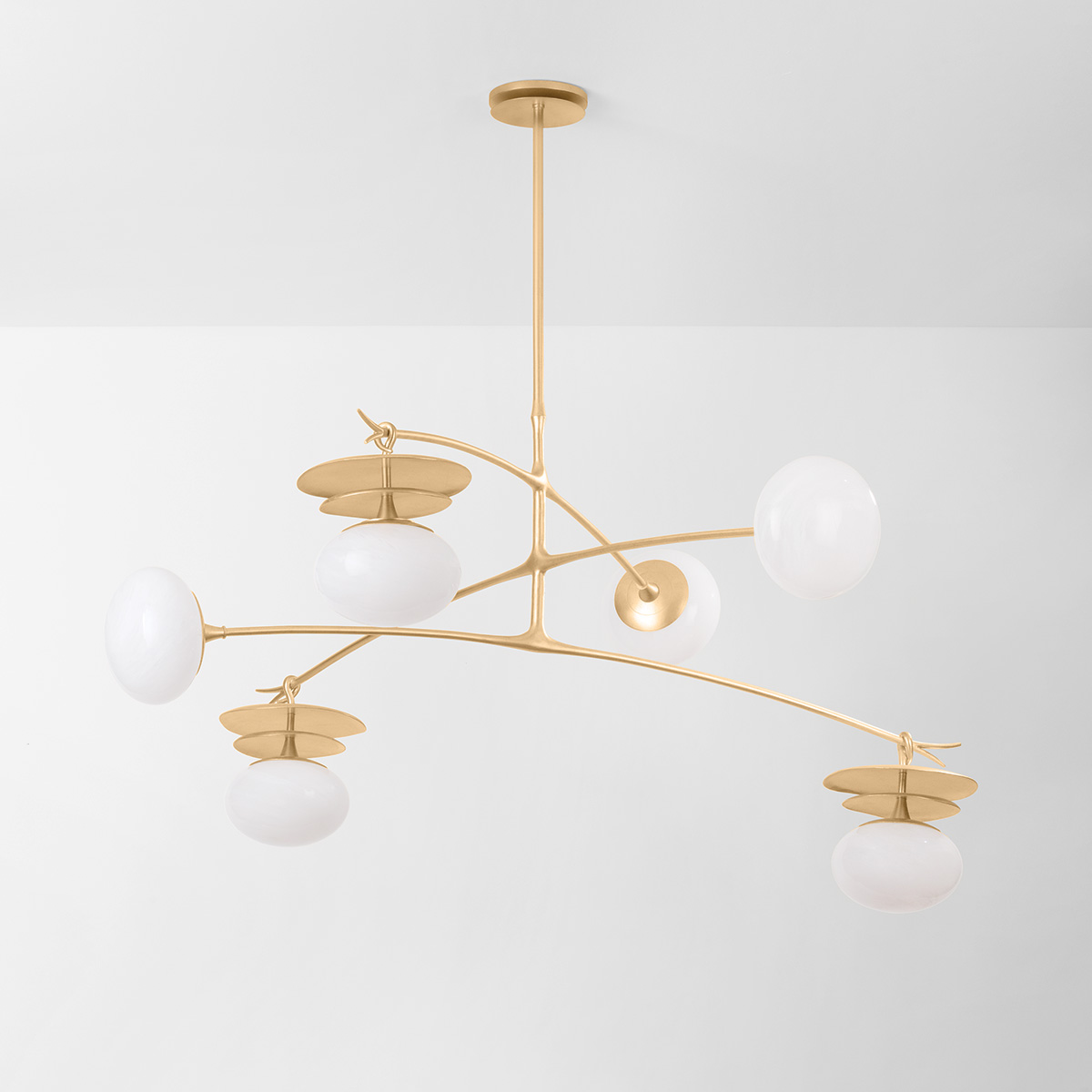 Inspired by botanical forms, this mobile chandelier balances organic shapes and delicate proportions to create a modern lighting fantasy. Stems of fluid metalwork support slender leaf-like disks. Resembling flowers in bloom, cloud glass spheres dangle gracefully from the Vintage Gold Leaf framework. Available as a 1-light sconce or 6-light pendant, Ceylon serves as a poetic representation of nature.