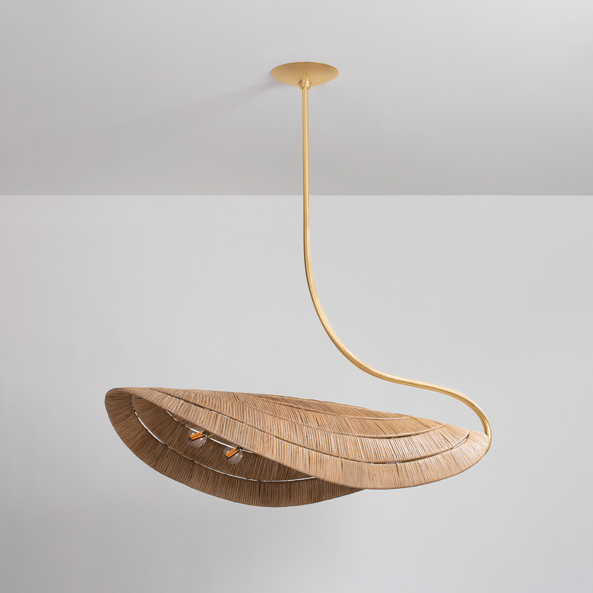 Handwoven from natural rattan, the graceful canopy of Medea reimagines a large leaf in a tropical oasis. A swooping arm finished in gleaming Vintage Gold Leaf perfectly complements the curves of the shade, creating a dialogue between nature and luxury. Available as a 4 or 6-light island, Medea creates a refreshing statement above a dining table or in a living room.