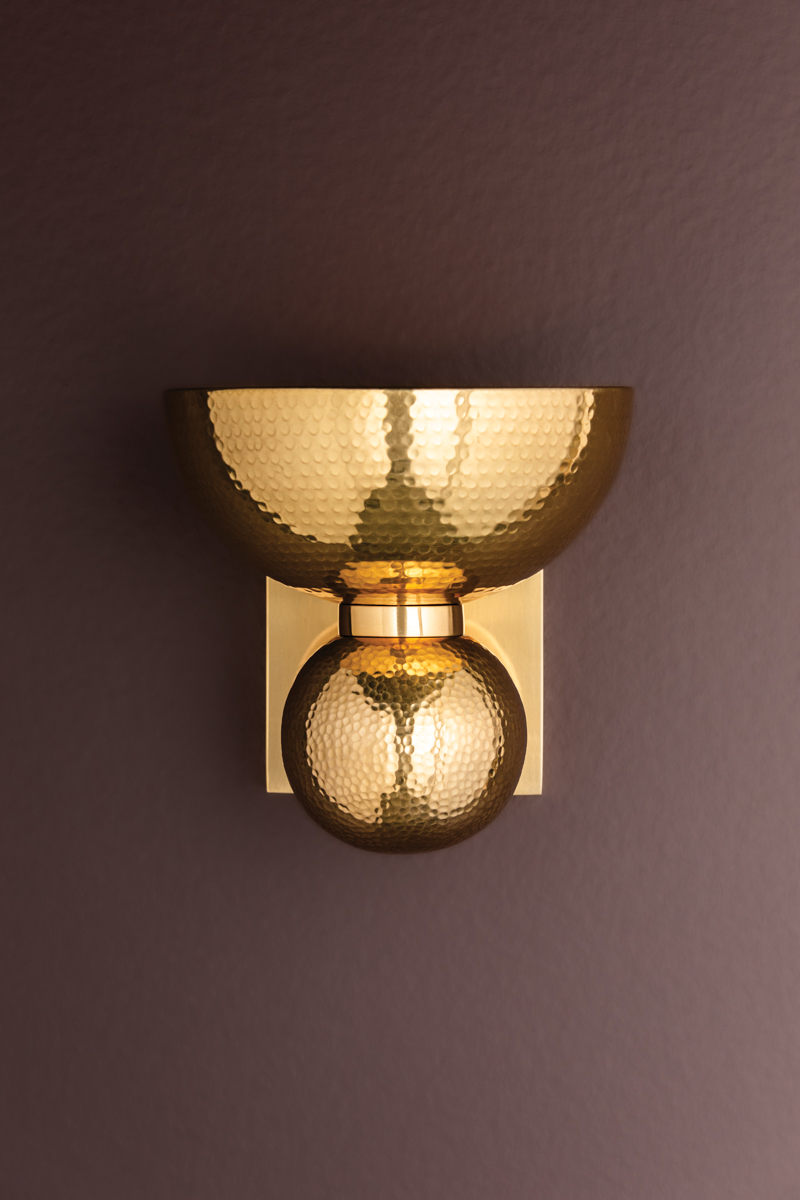 Drawing inspiration from antique jewelry, the Catania sconce stirs up nostalgia for a bygone era. The thoughtfully proportioned design features an upward-facing bowl accented by a large lower finial. Subtly hammered Vintage Brass metalwork adds another layer of vintage charm. Despite its petite stature, Catania makes a bold statement in any space.