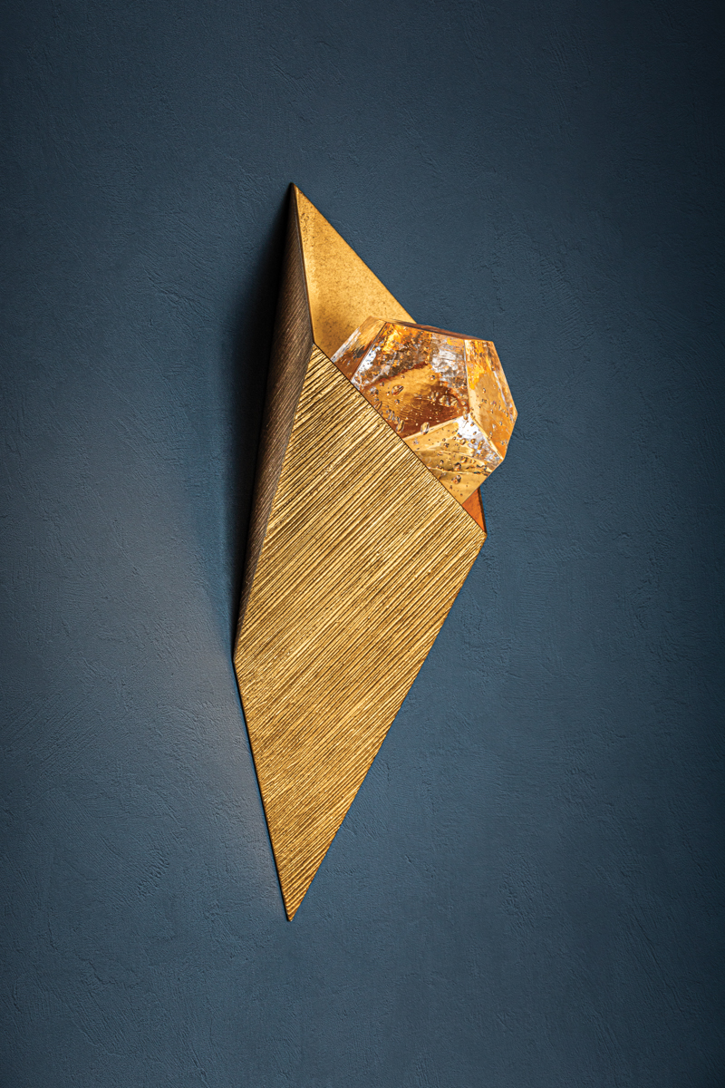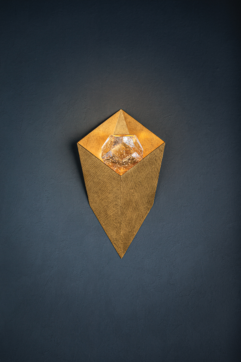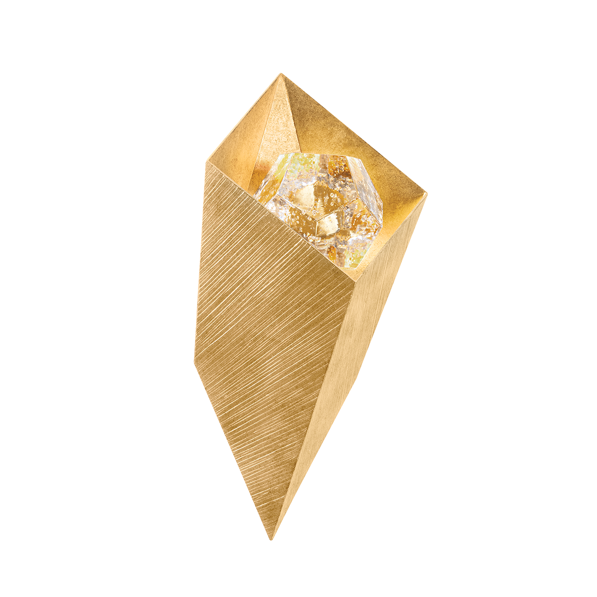 An unexpected treasure takes shape in this striking single light sconce. Like a pearl inside an oyster shell, Conch features a faceted metal shade inlaid with a crystal glass jewel. An LED light source, shining light up illuminates the seedy, cast glass gem. A warm, Vintage Gold Leaf finish enhances this dazzling lighting experience. Part of our Noz Nozawa collection.