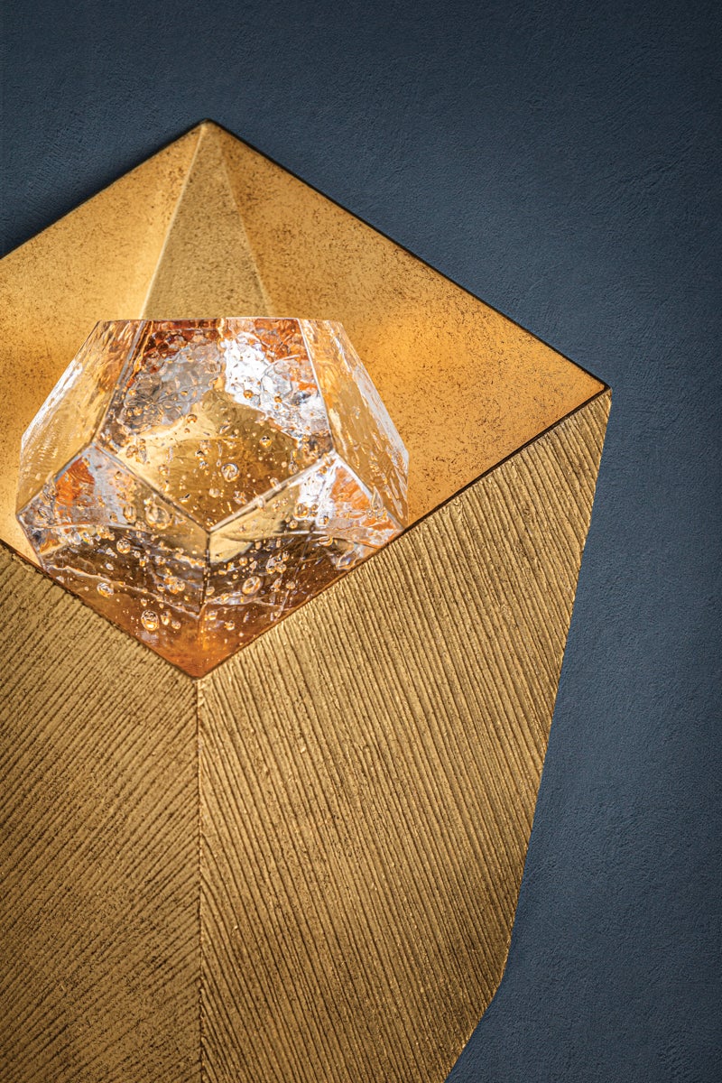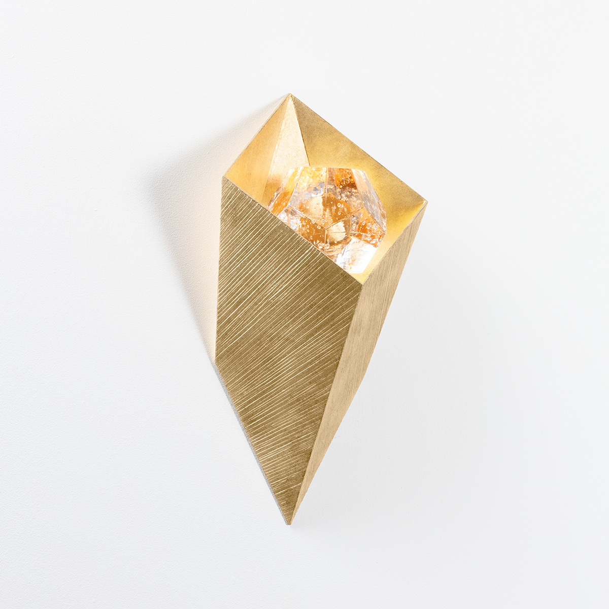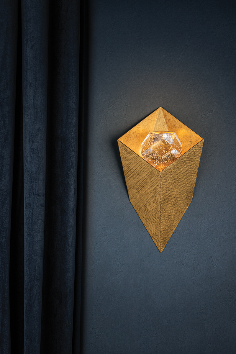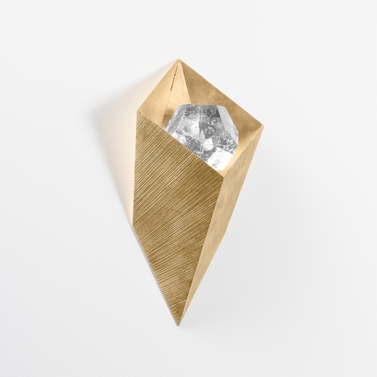 An unexpected treasure takes shape in this striking single light sconce. Like a pearl inside an oyster shell, Conch features a faceted metal shade inlaid with a crystal glass jewel. An LED light source, shining light up illuminates the seedy, cast glass gem. A warm, Vintage Gold Leaf finish enhances this dazzling lighting experience. Part of our Noz Nozawa collection.