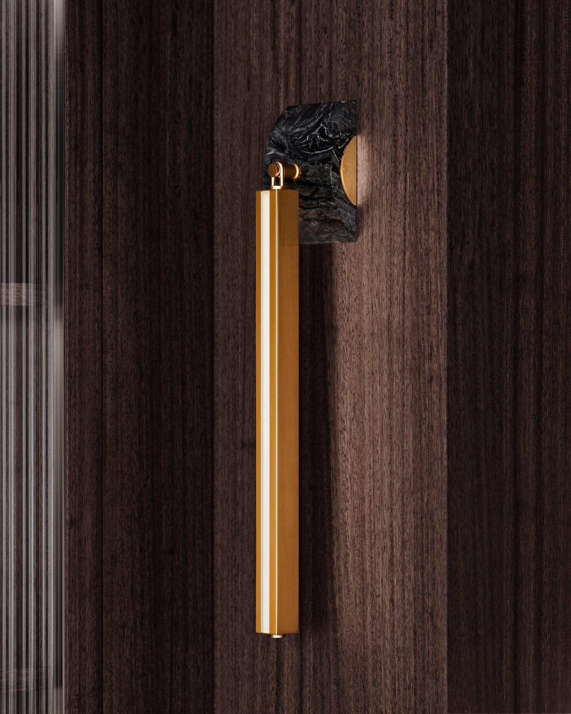 Silja exudes modern elegance by melding architectural and jewelry design languages together. The rectangular profile of the Vintage Brass metalwork emits light from both the front and back, illuminating all sides with a warm glow. The Nero Madera marble backplate lends a luxe material quality to this fixture, adding value to a piece that is perfectly suited to a bath area.