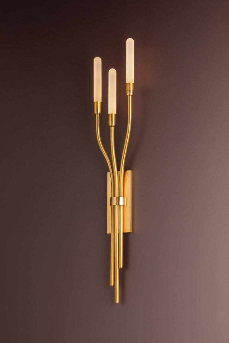 Defined by a poetic, gestural array of sweeping arms, the family of Amalthea is alluring and modern. Perched at the tip of each arm is a thin etched acrylic rod, end-lit with LED. While reminiscent of slender torches, the Vintage Brass branches also come across as organic. Each variation in this family, including a 3-light sconce and 18 or 30-light chandelier offers distinctive visual appeal while providing a lighting solution to meet the needs of your space.
