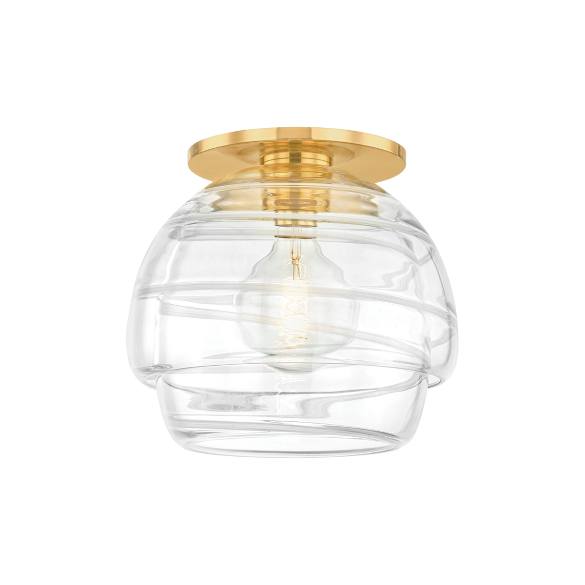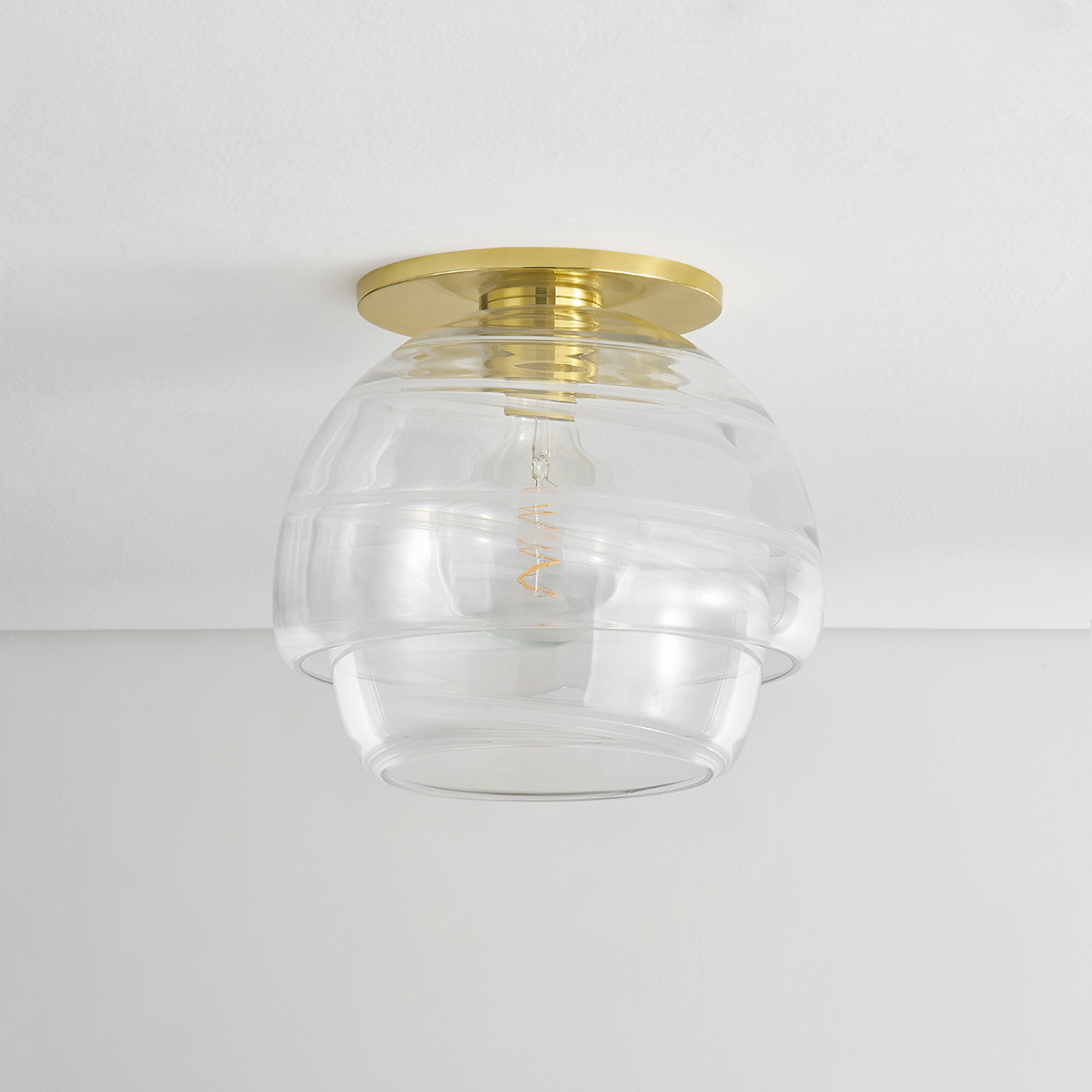 Made from distinctive Tourbillon Blanc glass, this elegant bubble-shaped flush mount is complemented by a sleek Aged Brass canopy. Characterized by its clarity and white swirl details, the unique glass enhances the organicism of this artistic design. With its contemporary appeal, Montvale effortlessly injects a fresh and modern ambiance into any interior space.