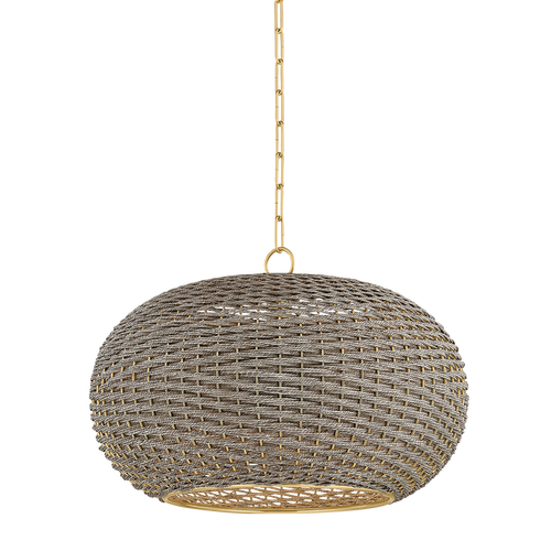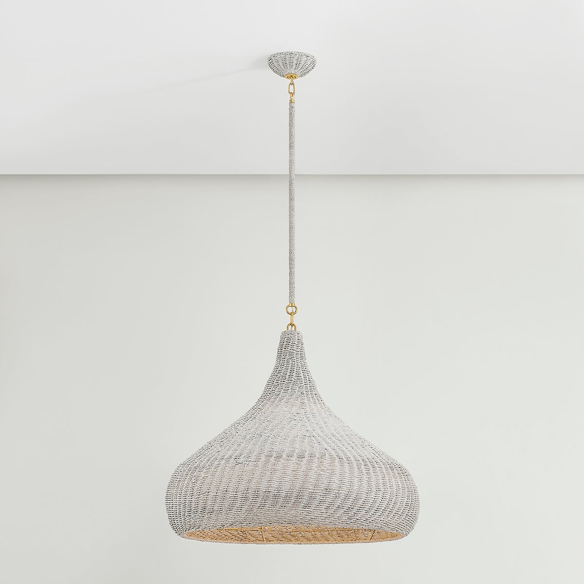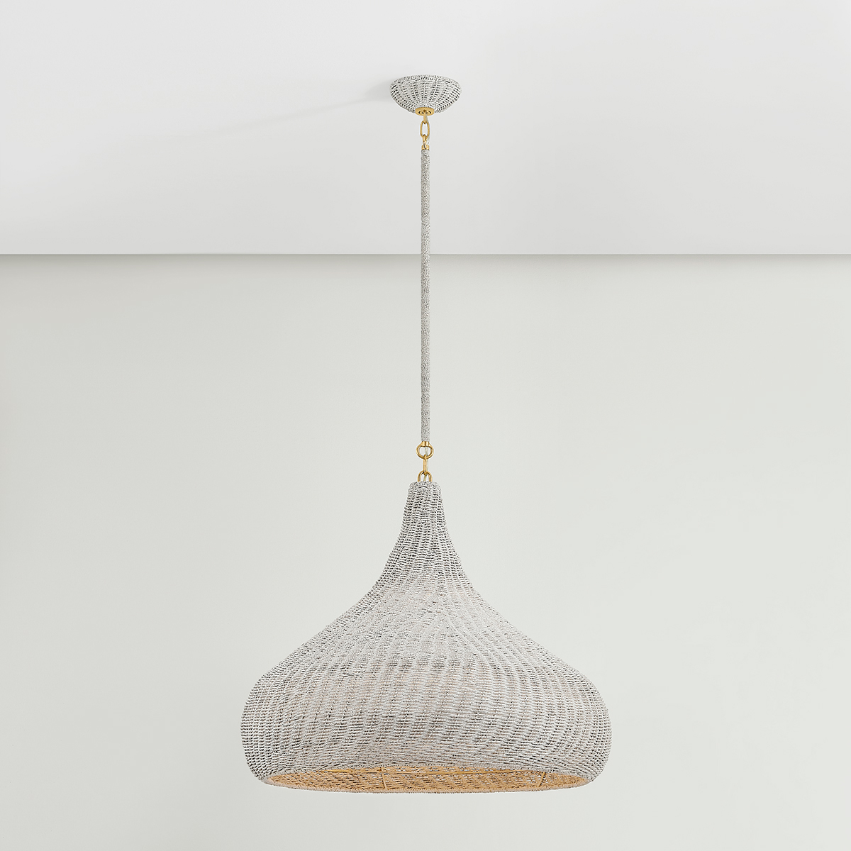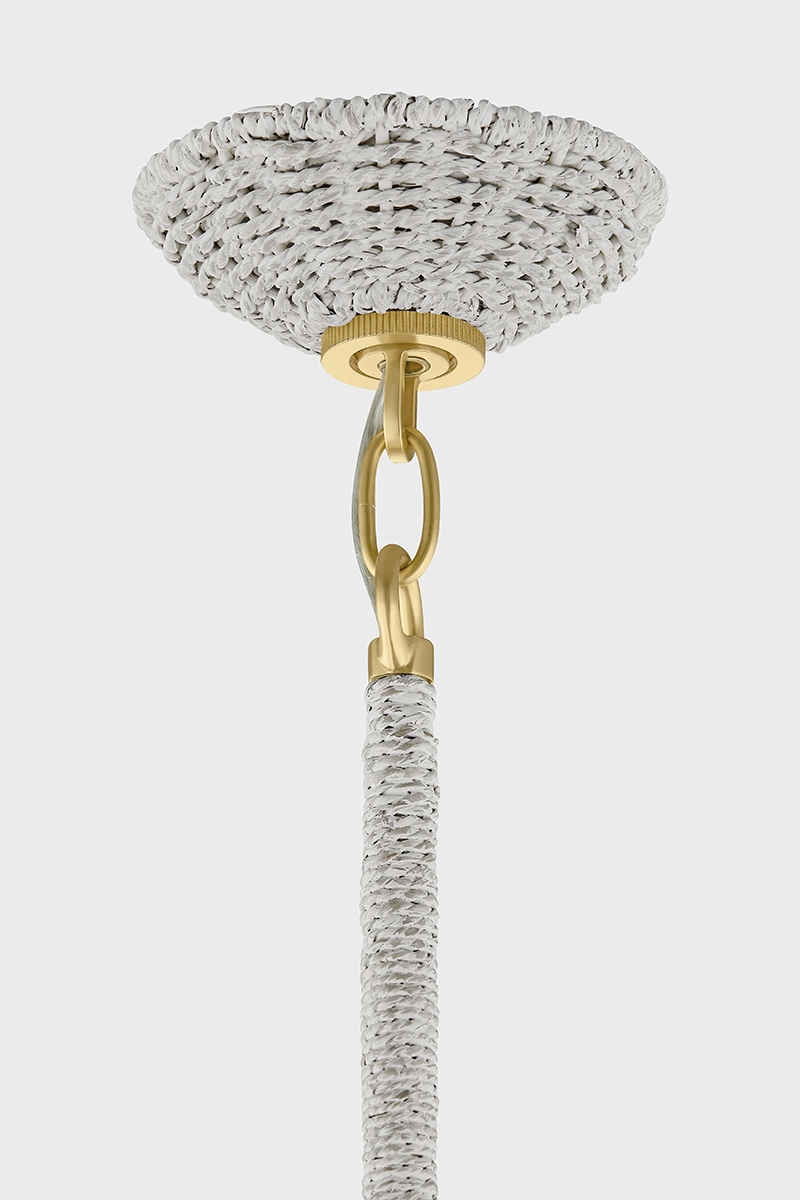 Bring the beauty of nature indoors with the white-washed seagrass Hampstead pendant. The sweeping design lines are complemented by the soft tonality of the shade, giving Hampstead an organic, yet structured feel. As the twisted weave spirals downward, it creates a dynamic effect that follows the curve of the silhouette. A matching canopy ties the fixture together with a cohesive material story. Available in two sizes with an Aged Brass finish, this pendant adds warmth and character to any space.