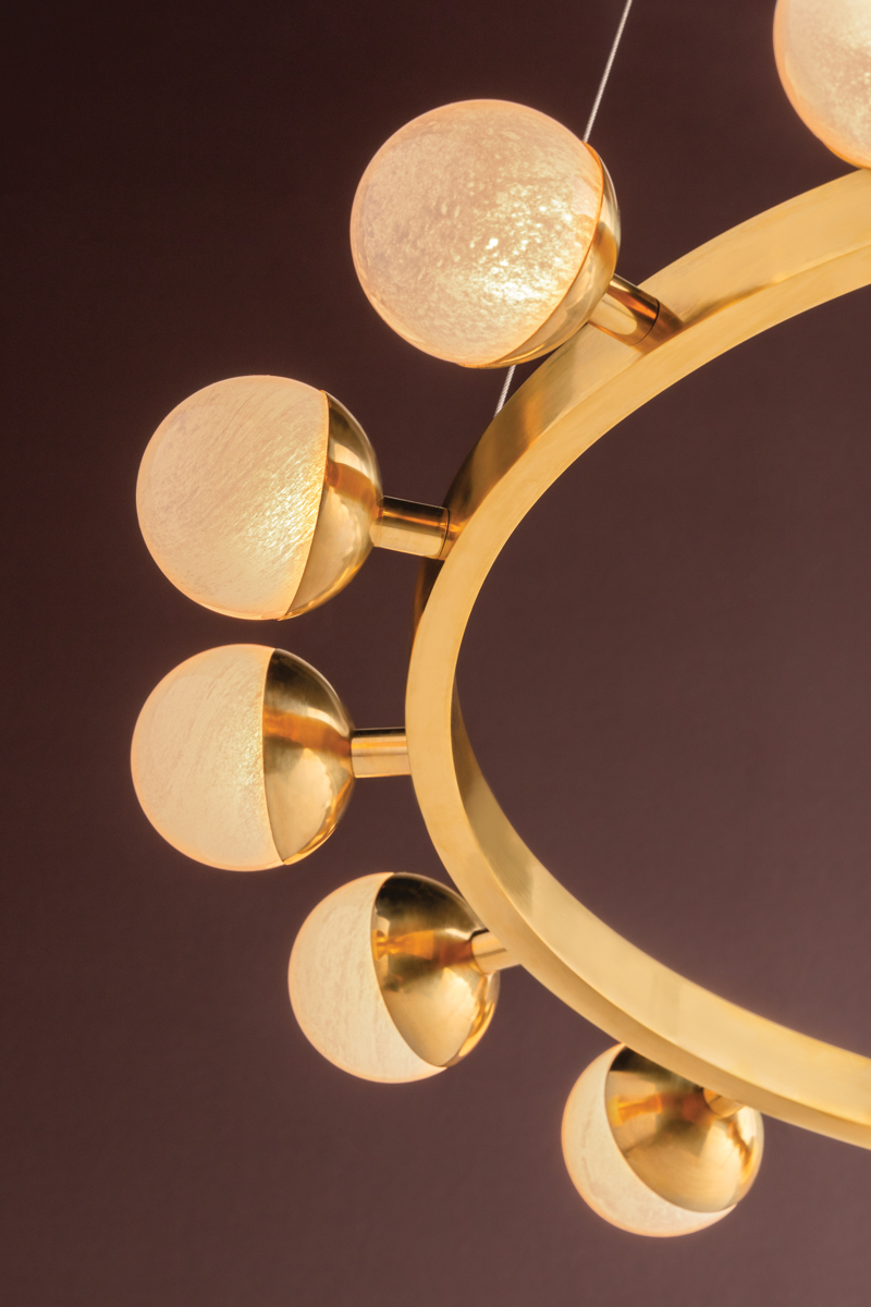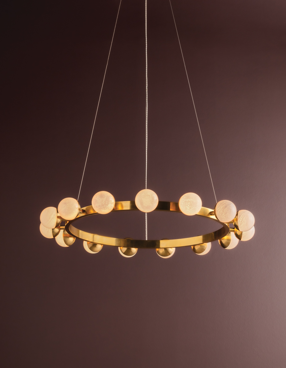 Elements of repetition and scale are skillfully balanced in the Linus chandelier to create a striking visual impact. Finished in Vintage Brass, the concentric rings that form the framework support a series of globes. Marked by a unique, crackled effect, the antique quality of the White Luna glass adds an air of artistry. What sets this family apart is its versatility: despite the five distinct options, only three rings are used to create an array of configurations.