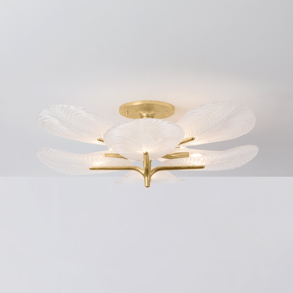The layered botanical design of the Kamal semi-flush mount adds a pop of freshness overhead. Beautiful leaf patterns have been etched onto each piece of textured glass, creating a dynamic wave-like outward diffusion of light. The candelabra cluster positioned just beneath the ceiling canopy casts light through the layers to create a warm glow around the room. Available in two sizes and finished in Vintage Gold Leaf, Kamal makes a fresh statement in hallways, bedrooms, and beyond.