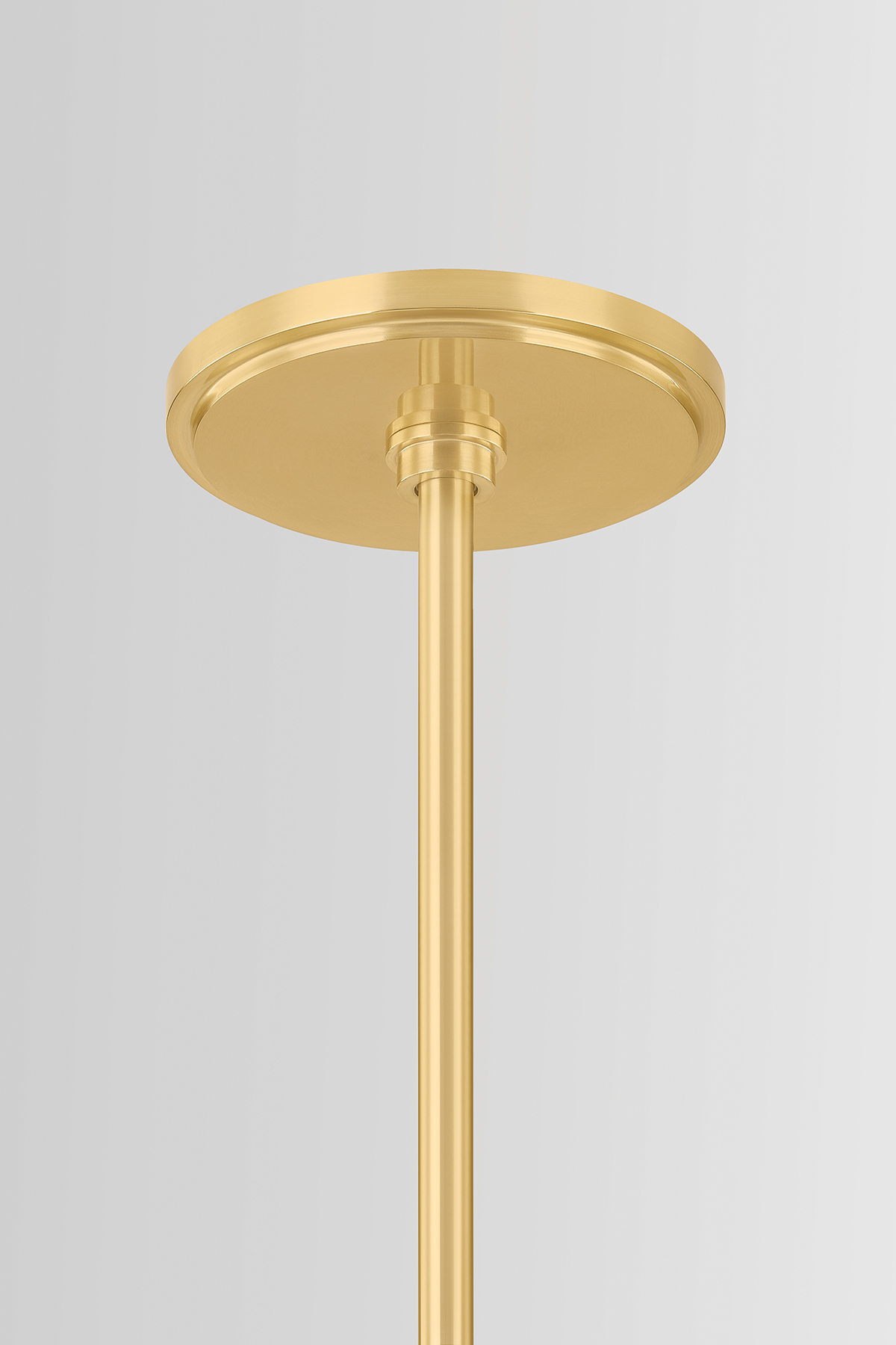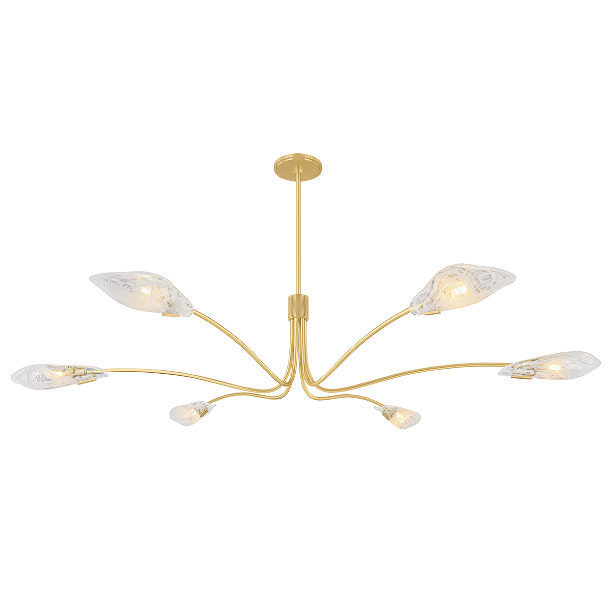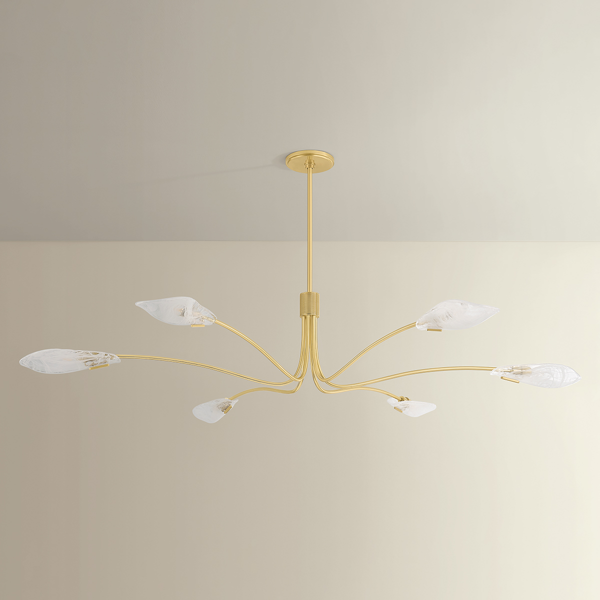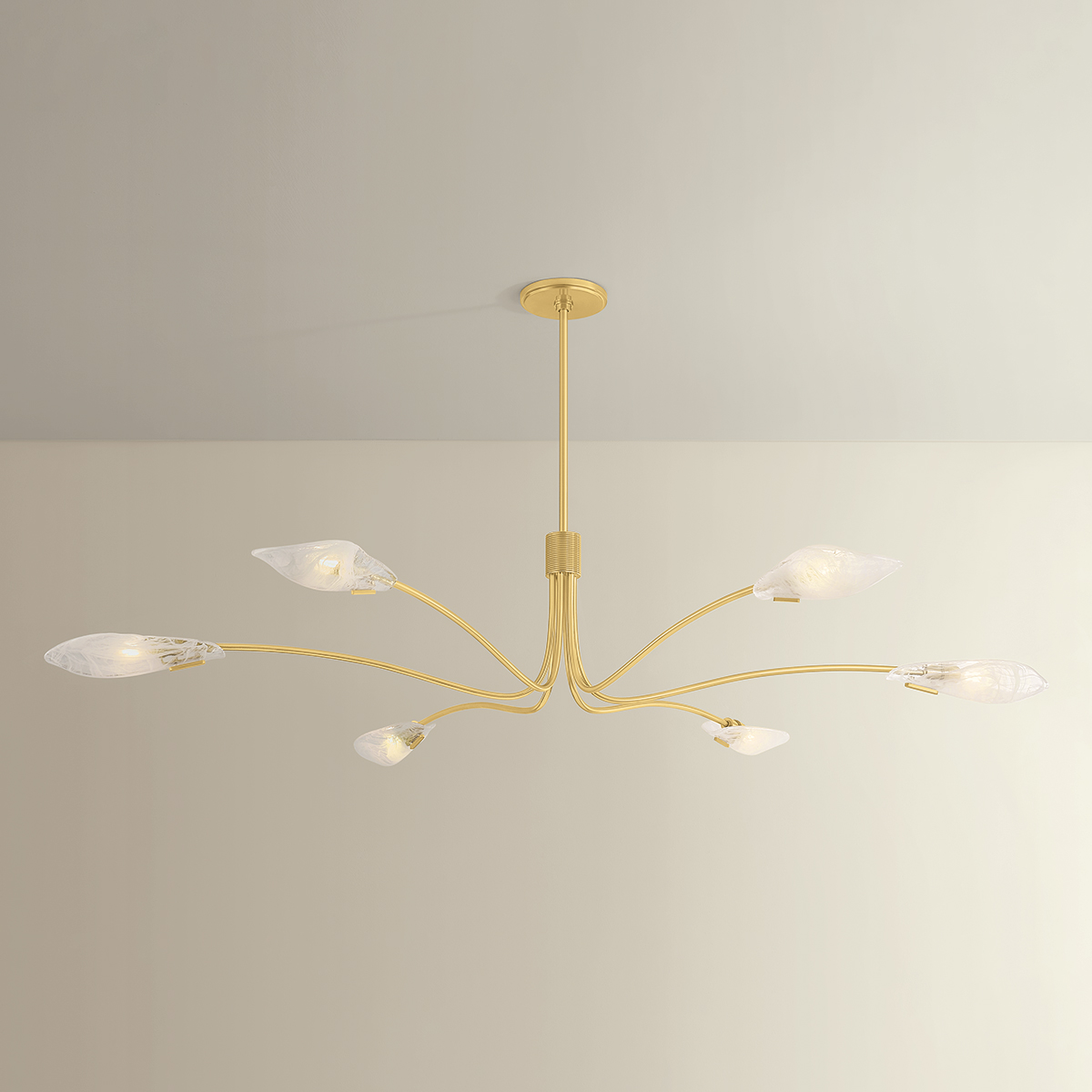 Inspired by the shape of calla lilies, the sprightly Tenafly chandelier features piastre glass shades that bloom outward. A reeded central detail adds texture, referencing a string-bound floral bouquet. To complement the ethereal glass, the slender arms are elongated and curved. Finished in Aged Brass, Tenafly is available with 5 or 6 lights.