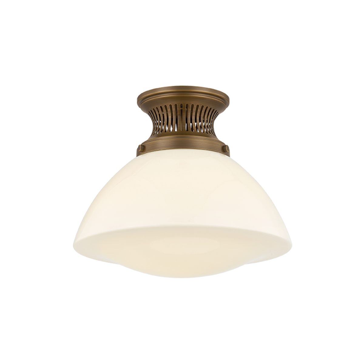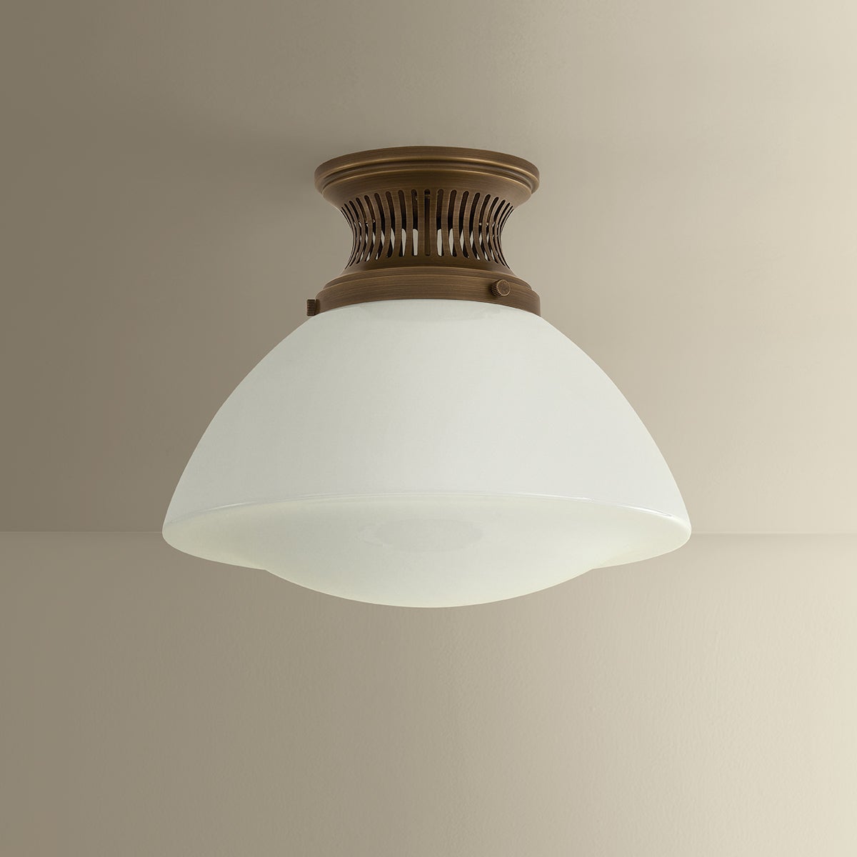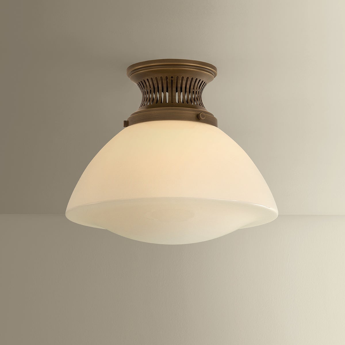 The Bruceville family distills a traditional lantern design into a simplified silhouette. A pronounced, chimney-like canopy anchors the design with a slotted gallery that introduces visual interest. From the metalwork to the opal glossy glass shade, the design flows as it tapers in and flares out. The pendant’s distinctive chain linkage adds a nautical note, echoed by the Heritage Bronze finish. Available as a flush mount in two sizes and as a pendant in two sizes.