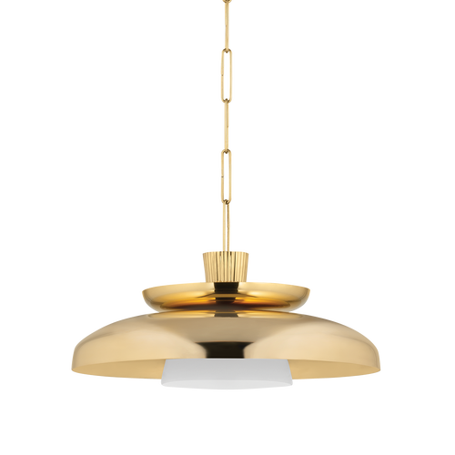 The architectural form and distinctive detailing of Ravenna make this shapely pendant a timeless treasure. Featuring alternating shallow bowl layers, the artistic stacked design culminates in a shiny opal glass shade nestled beneath a metal canopy. A ribbed cap adds an organic touch, while the allover Vintage Brass finish complements the glamorous silhouette.