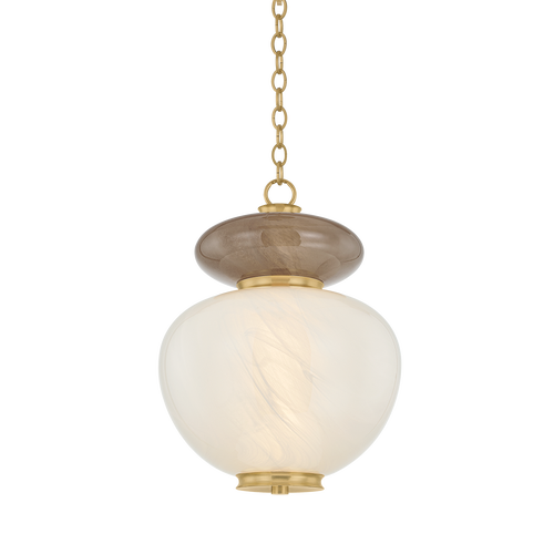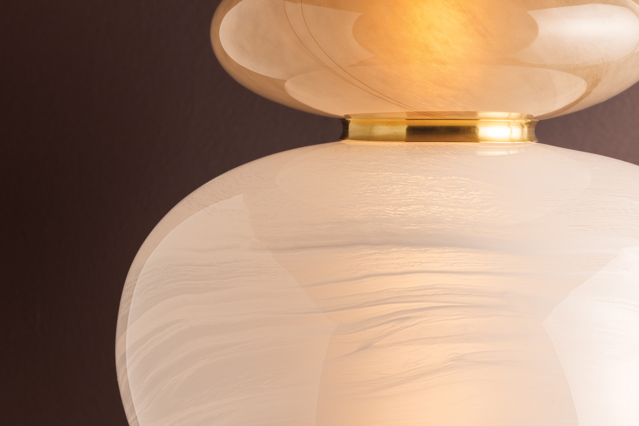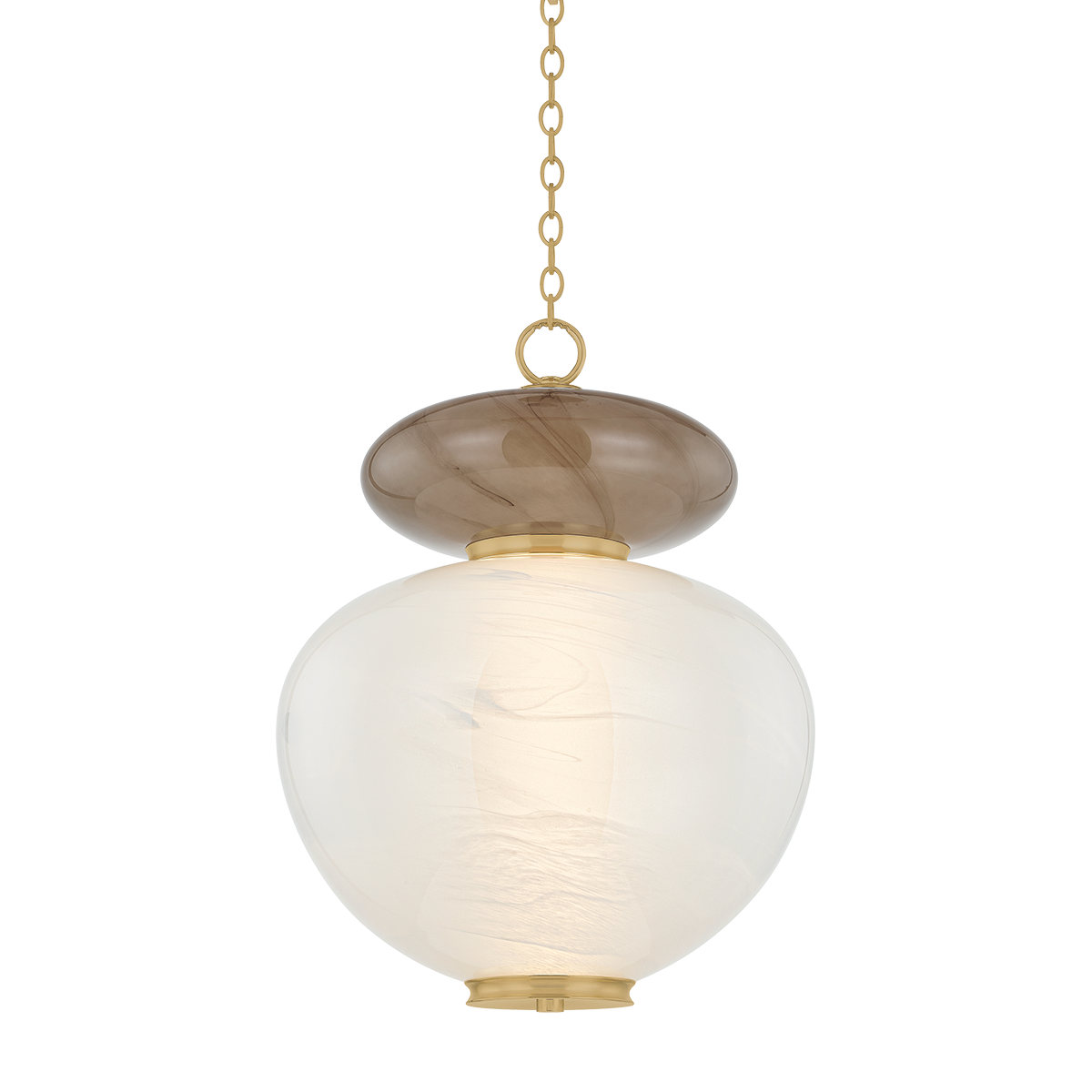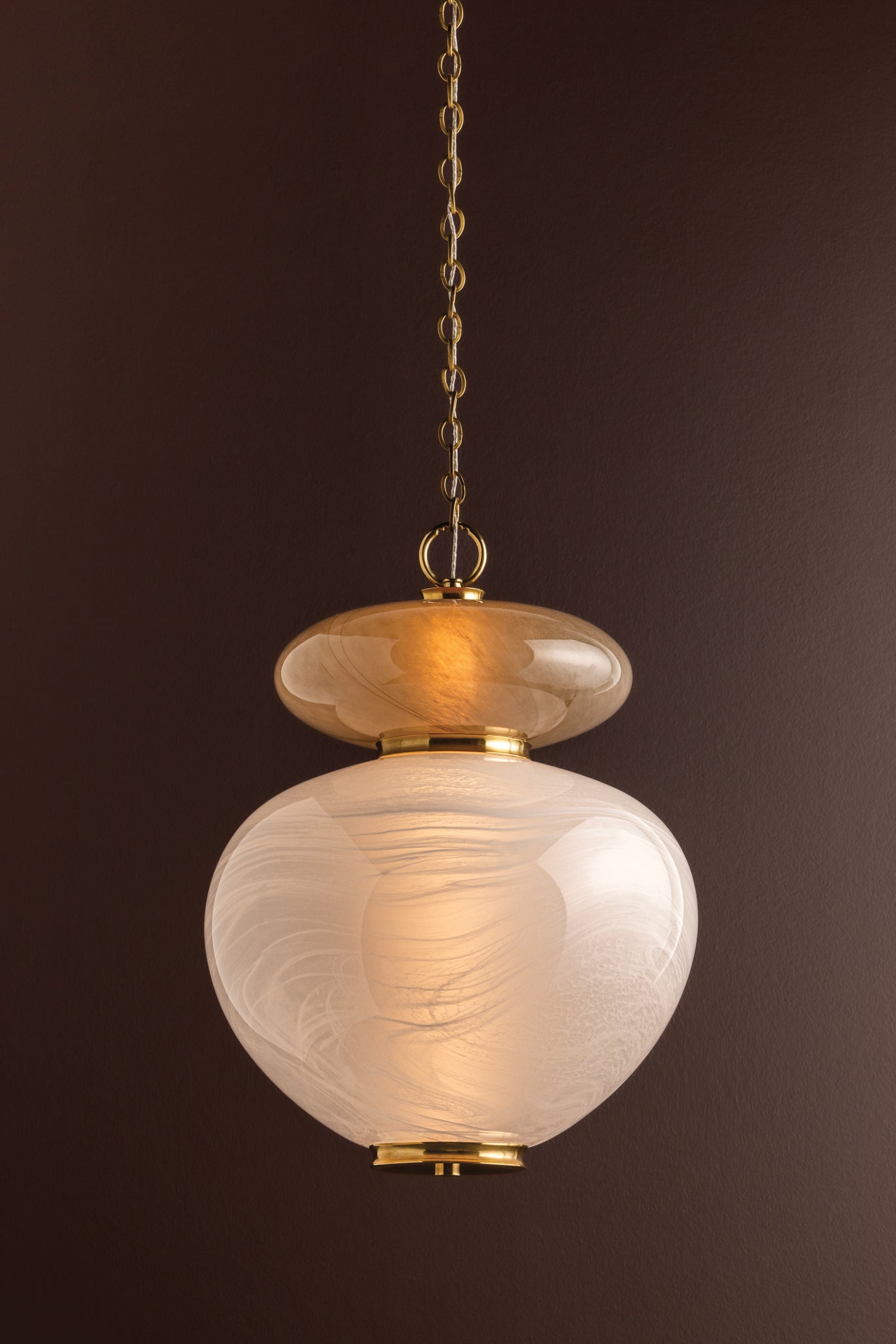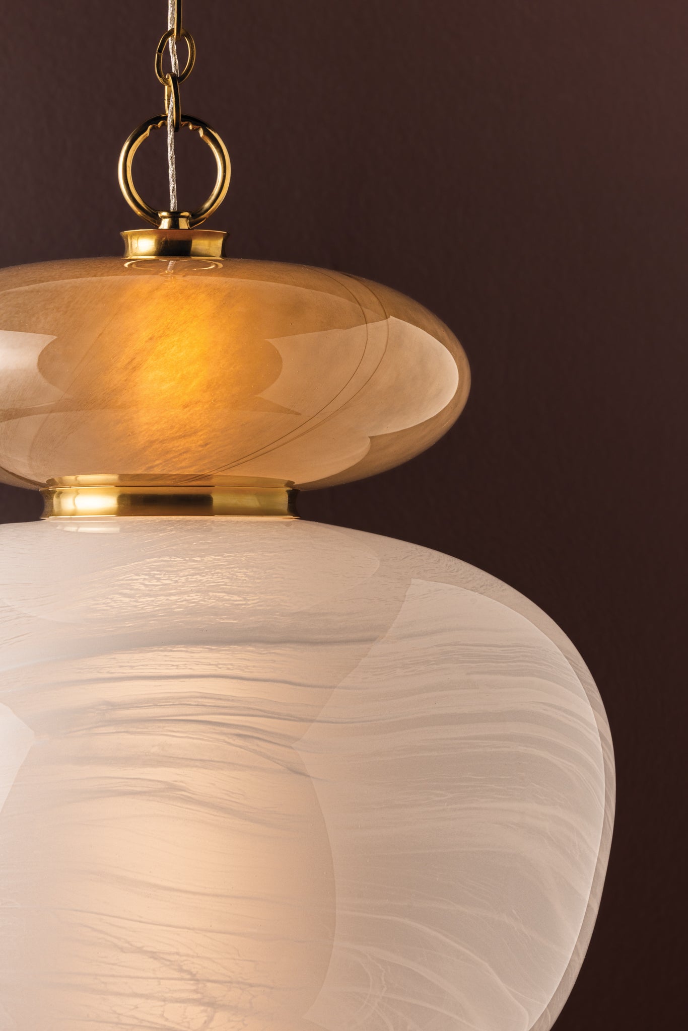 The organically-shaped Syros pendant is designed to be symmetric enough for use in multiples, while still feeling ornamental and elevated. It features a large Remolino Blanco glass shade topped by a smaller affogato glass shade. The sculptural stacked design is brought to life by the sense of movement in the specialty glass, accented by polished Vintage Brass metalwork. Available in two sizes.