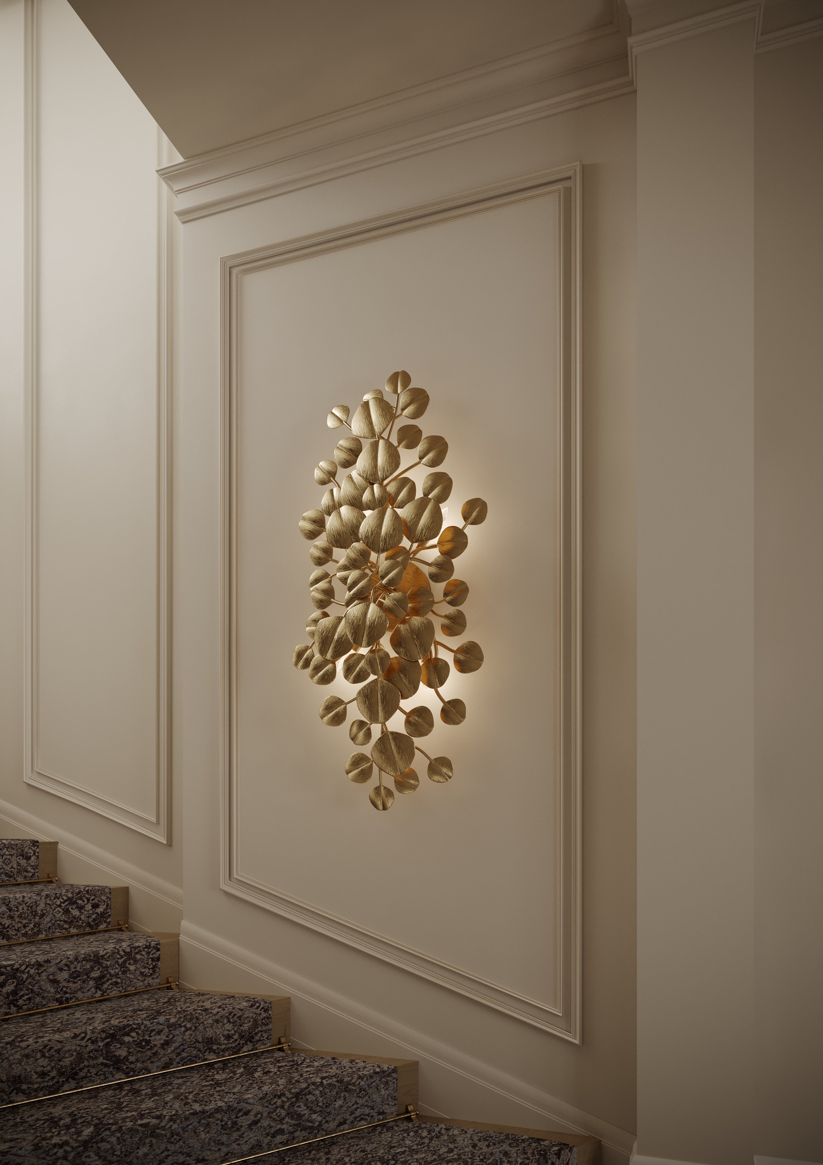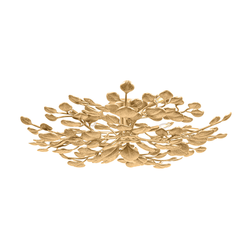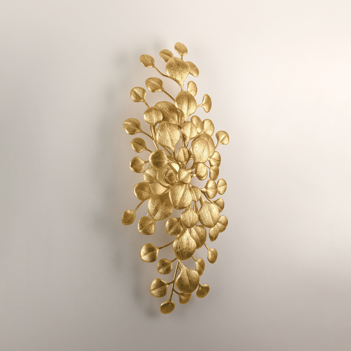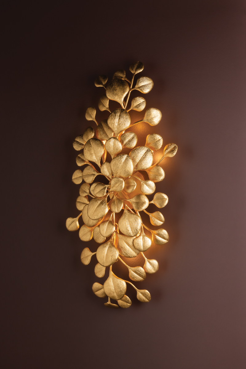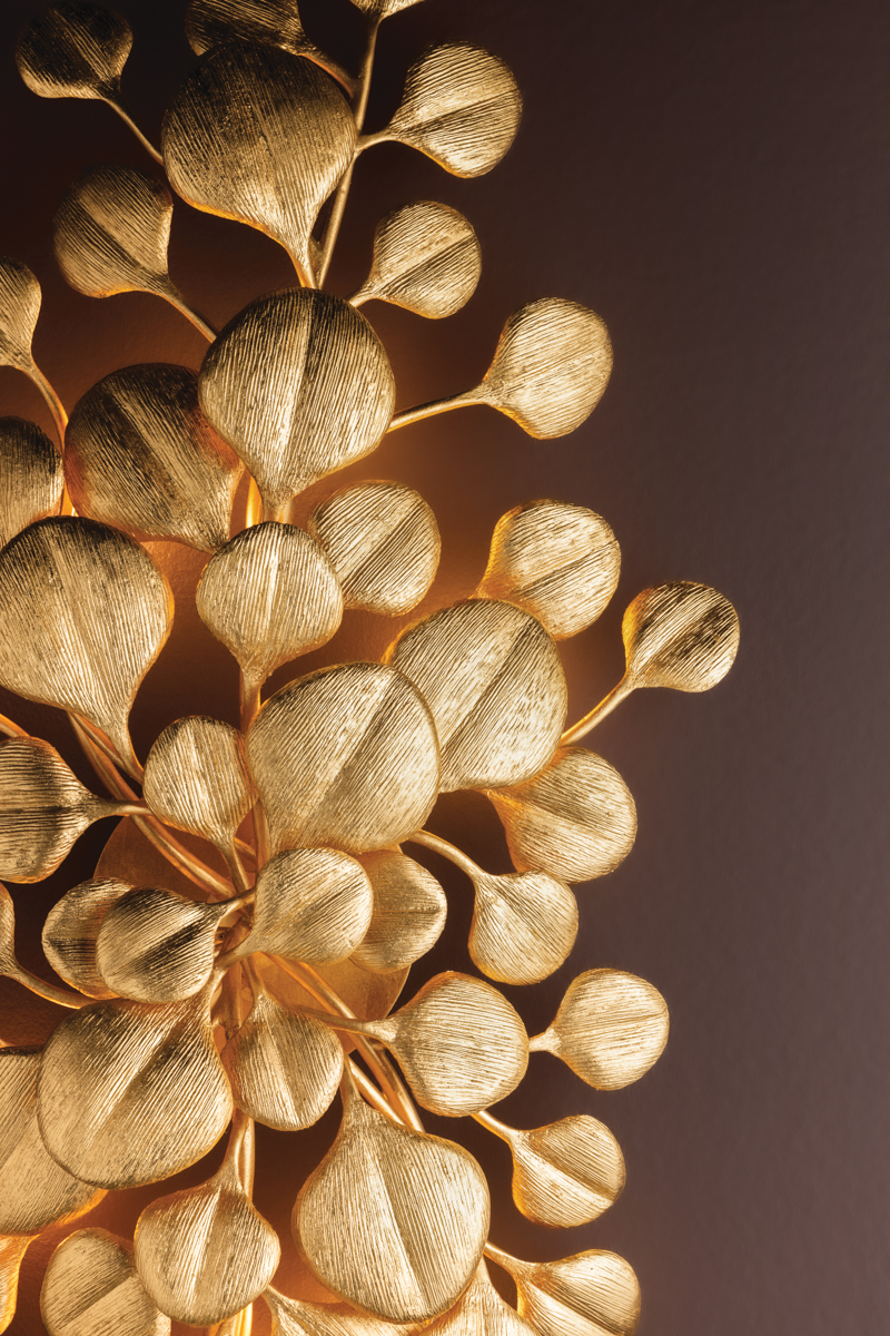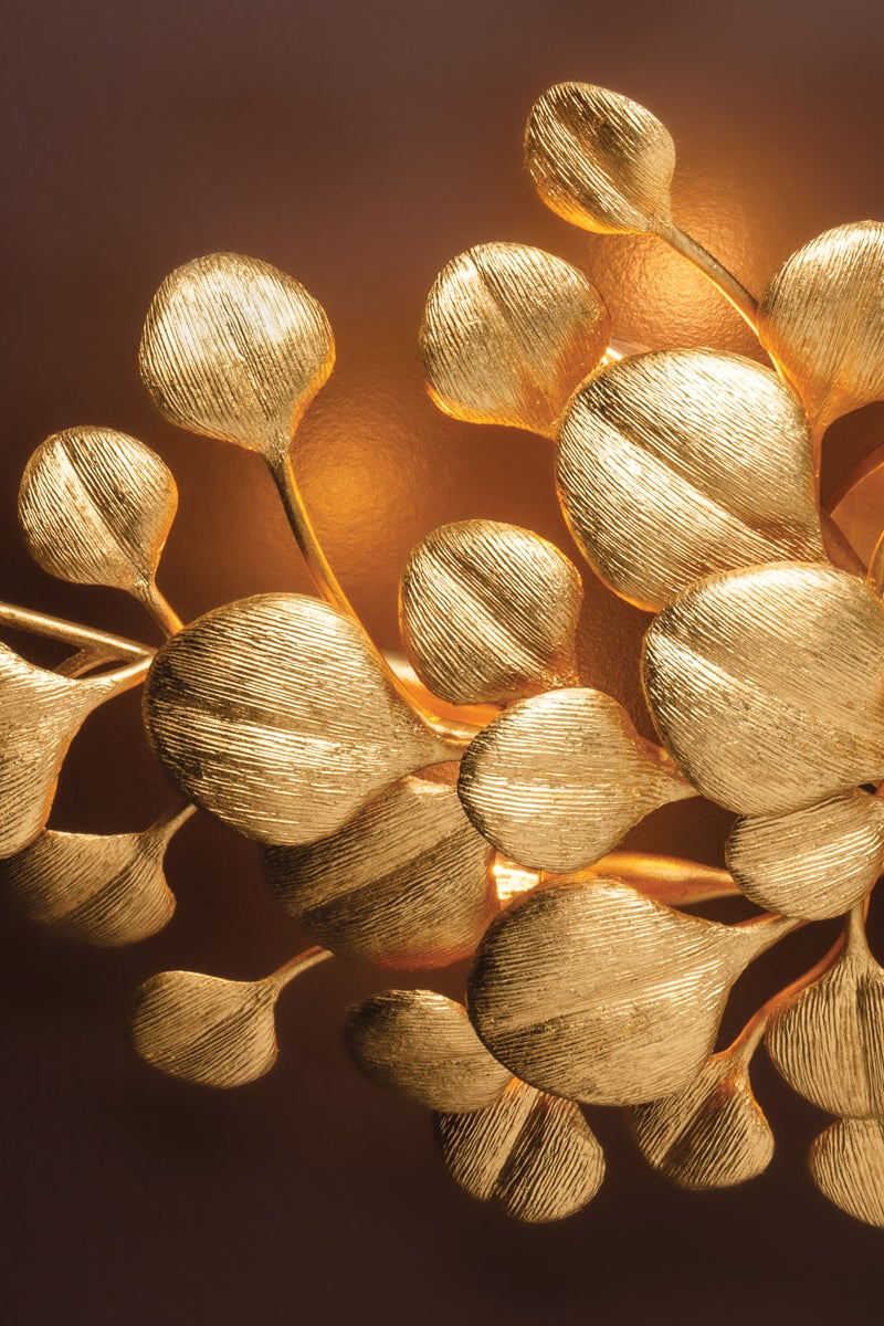 An overscale, exuberant expression of botanical beauty, Menorca animates a space. The design takes inspiration from eucalyptus leaves, which are illuminated from behind to create a dramatic, sculptural moment. The slight abstraction to the forms feels futuristic, while the Vintage Gold Leaf finish adds a luxurious note. Available as a sconce or semi-flush mount in two sizes, Menorca brings a touch of the wild and wondrous into your home.