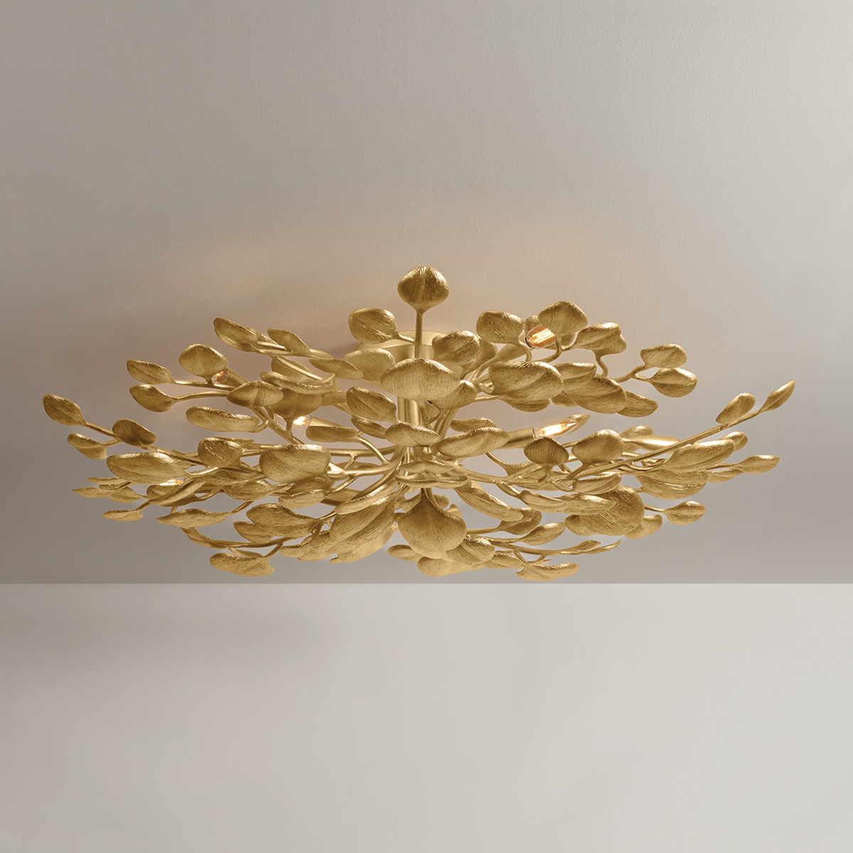 An overscale, exuberant expression of botanical beauty, Menorca animates a space. The design takes inspiration from eucalyptus leaves, which are illuminated from behind to create a dramatic, sculptural moment. The slight abstraction to the forms feels futuristic, while the Vintage Gold Leaf finish adds a luxurious note. Available as a sconce or semi-flush mount in two sizes, Menorca brings a touch of the wild and wondrous into your home.