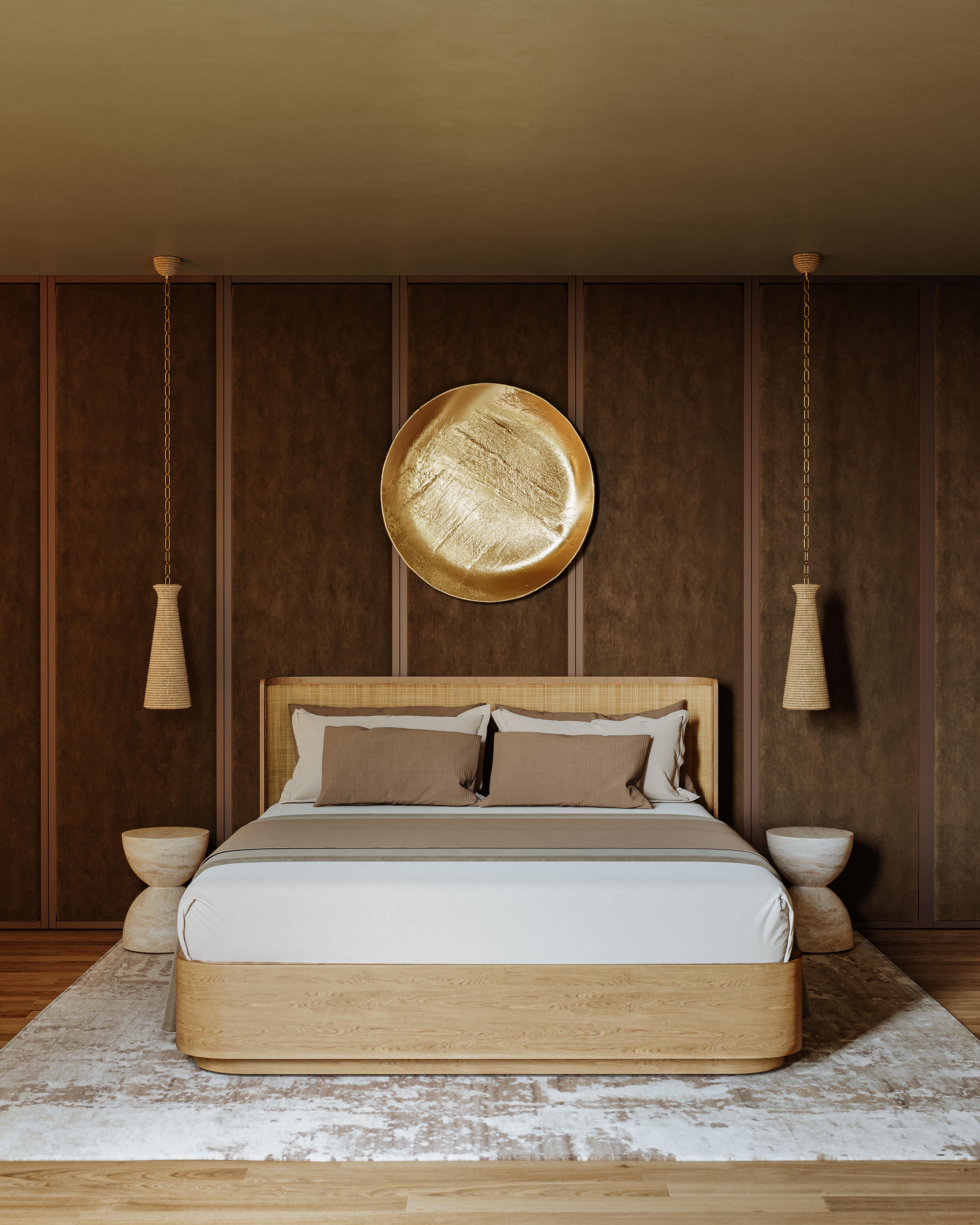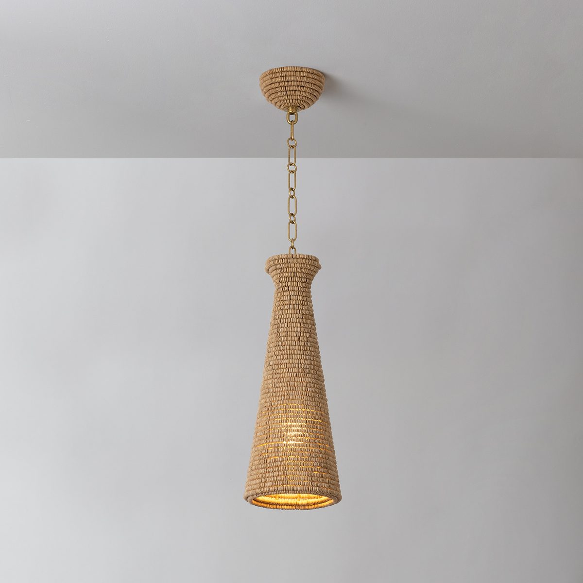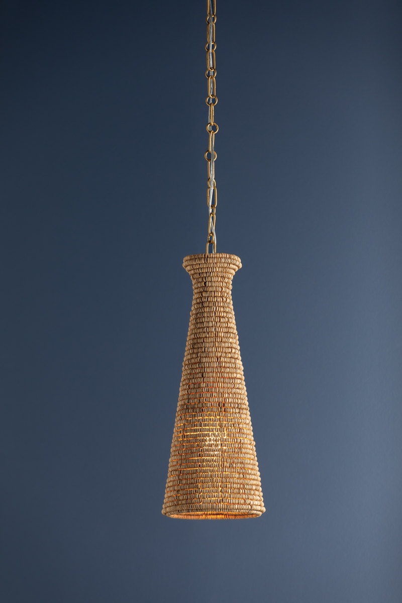 Handcrafted with natural wood beads, the conical shade of Tallman demonstrates artisanal finesse. It combines the fresh, organic materiality of the wood with the timeless elegance of a Vintage Gold Leaf chain. Available in two sizes, one with a slender profile and the other presenting a true cone shape, Tallman brings a fresh infusion of energy to kitchen counters or a dining room table.