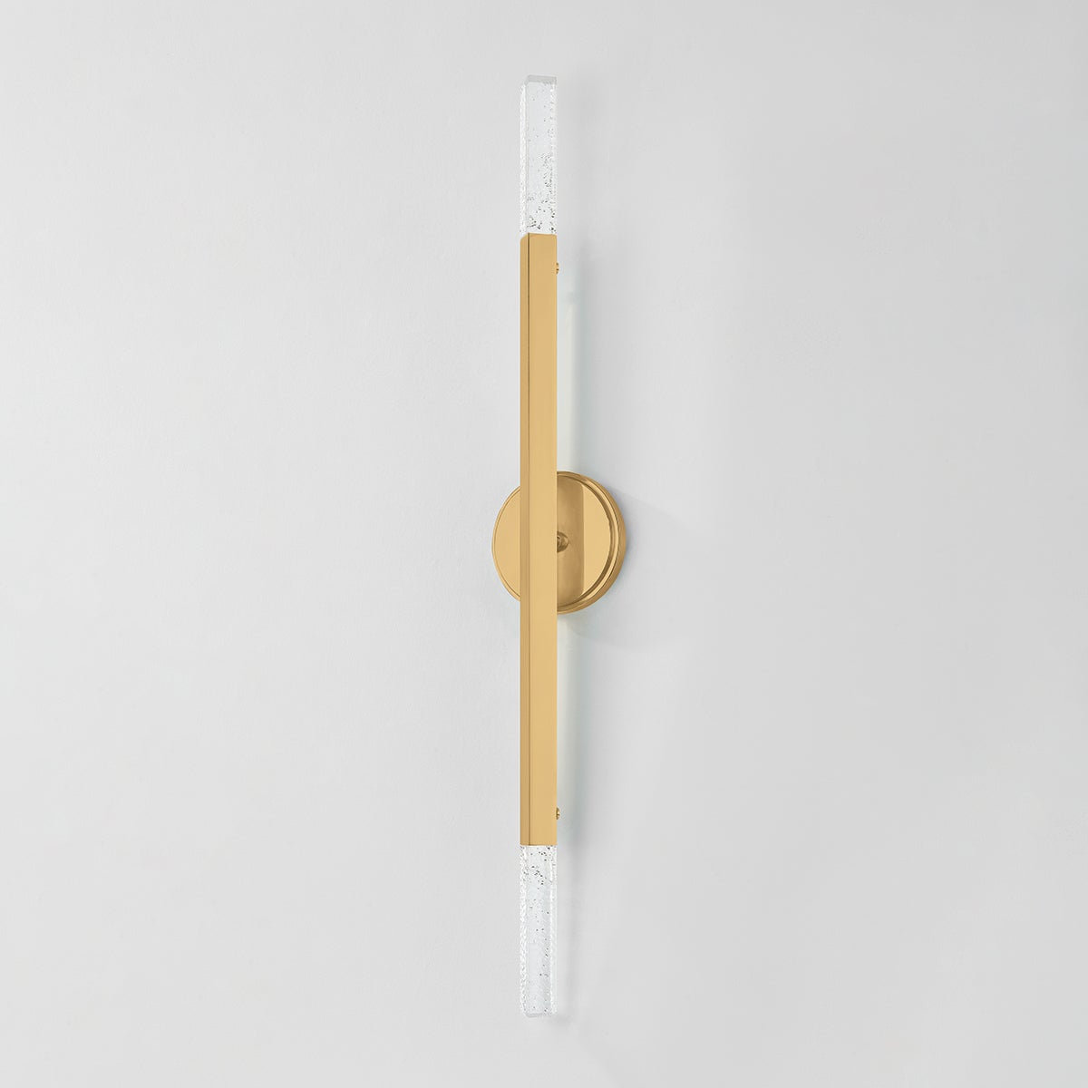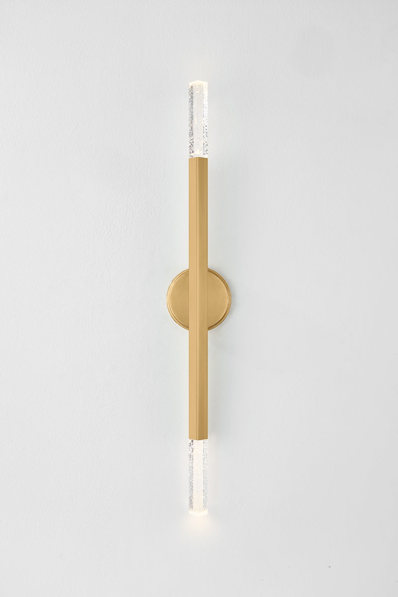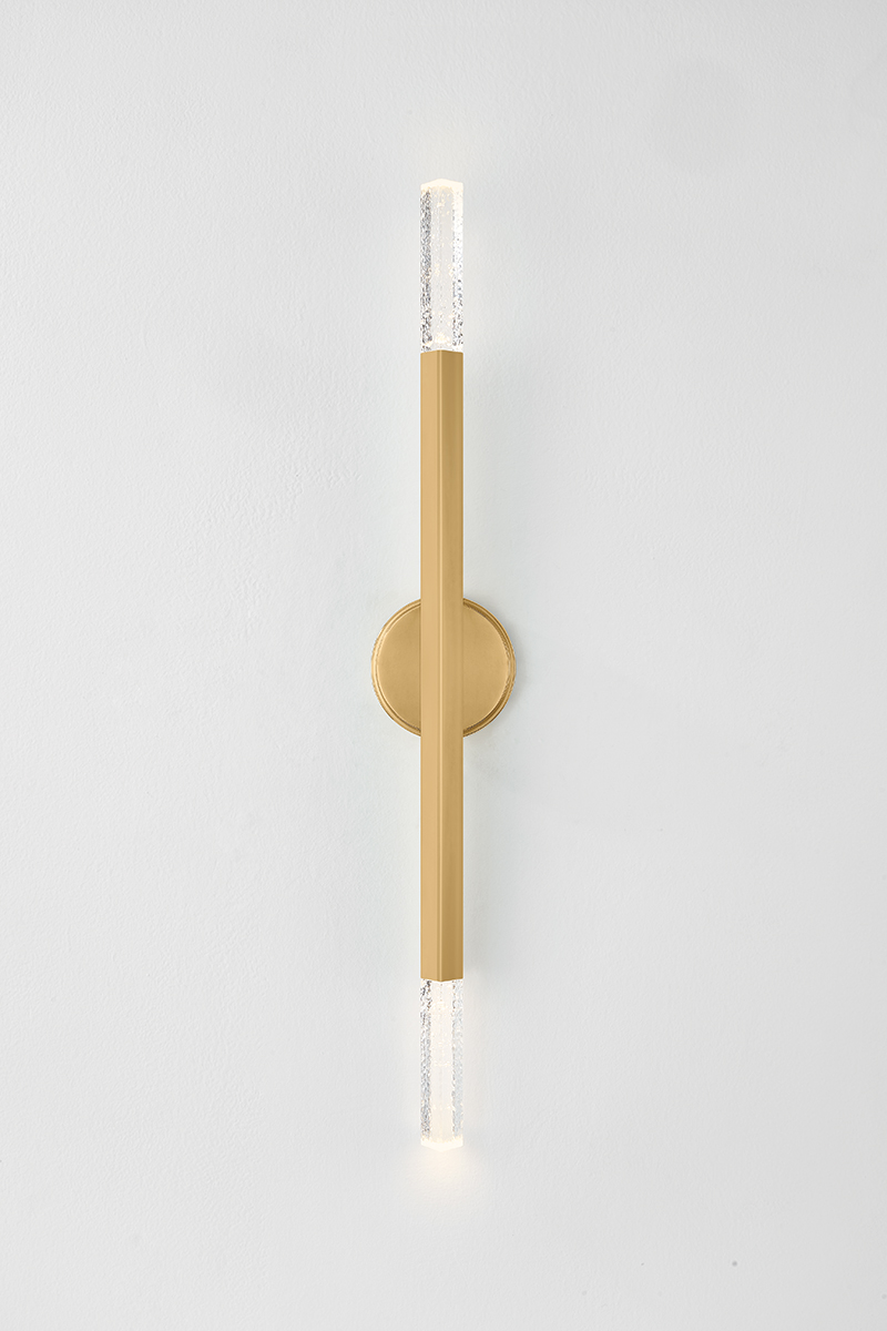 Bold and architectural, the Strasbourg family gives Art Deco style a modern twist. Available in two sizes, the chandelier features a fanned silhouette that forms a dynamic, artistic statement overhead. Finished in Vintage Brass, each arm is capped on both ends by a cast-seeded glass optic, creating an even spread of light that extends in all directions. The sconce shares the same edgy design language in a more compact, restrained form.