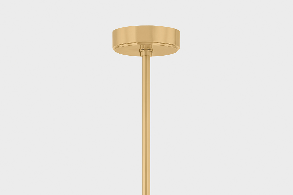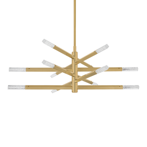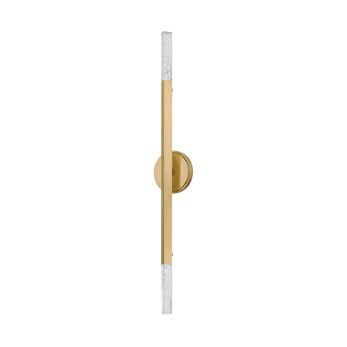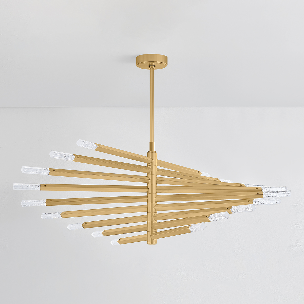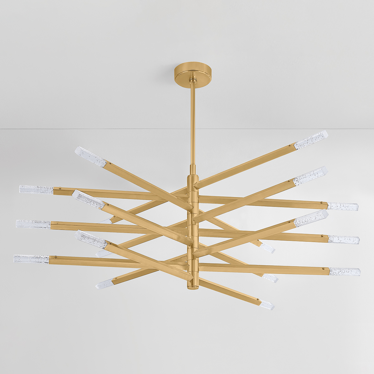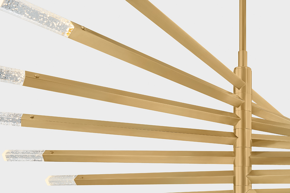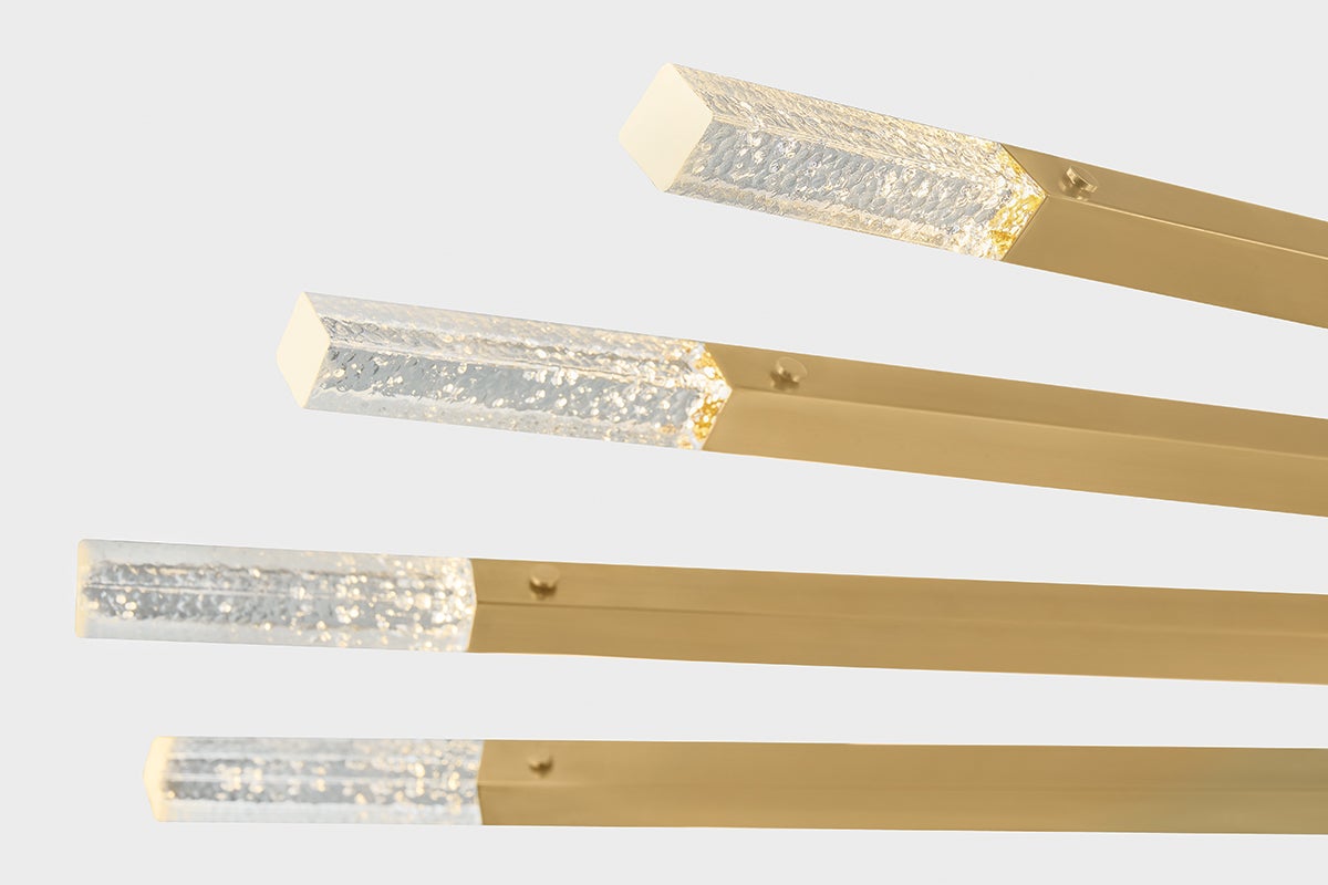 Bold and architectural, the Strasbourg family gives Art Deco style a modern twist. Available in two sizes, the chandelier features a fanned silhouette that forms a dynamic, artistic statement overhead. Finished in Vintage Brass, each arm is capped on both ends by a cast-seeded glass optic, creating an even spread of light that extends in all directions. The sconce shares the same edgy design language in a more compact, restrained form.
