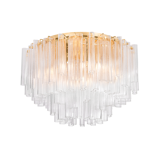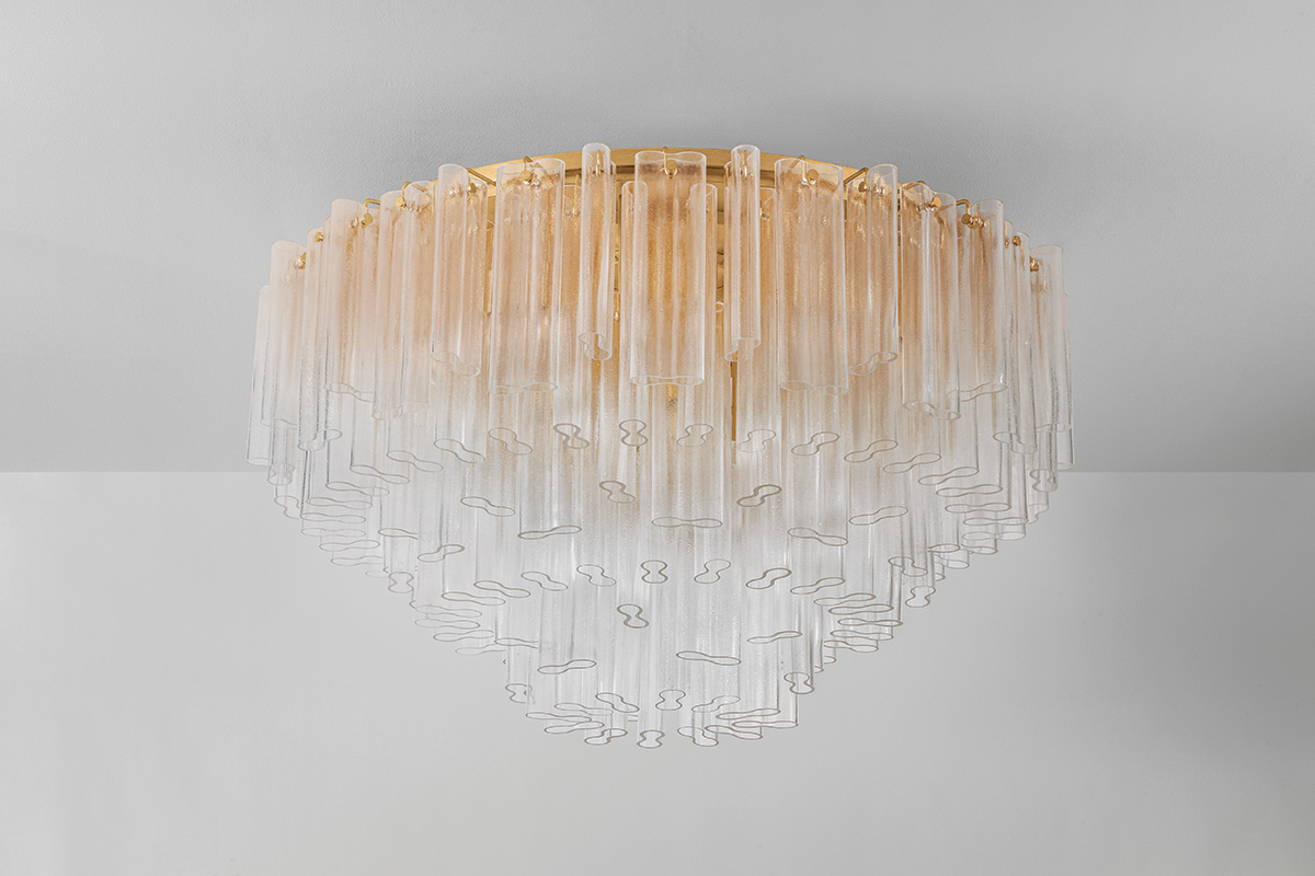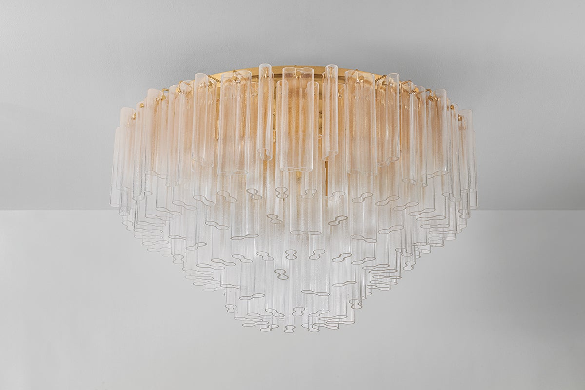 Mesmerizing Piastra glass tubes are layered in tiers to create the grand vision of Varenna. A soft, organic reimagining of an Art Deco silhouette, this flush mount comes in three sizes to create focal points in different-sized spaces. The sculpted waves in the specialty glass evoke an ethereal sense of movement while allowing for a more dynamic light diffusion. The close-to-ceiling canopy frames the fixture like a halo, finished in Vintage Gold Leaf.