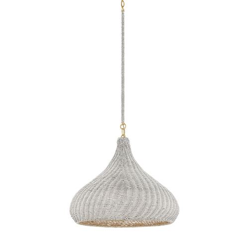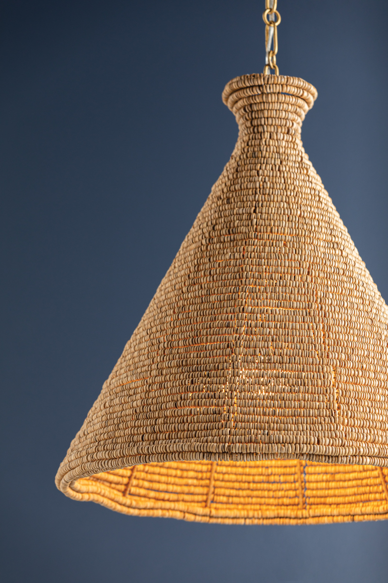 Handcrafted with natural wood beads, the conical shade of Tallman demonstrates artisanal finesse. It combines the fresh, organic materiality of the wood with the timeless elegance of a Vintage Gold Leaf chain. Available in two sizes, one with a slender profile and the other presenting a true cone shape, Tallman brings a fresh infusion of energy to kitchen counters or a dining room table.