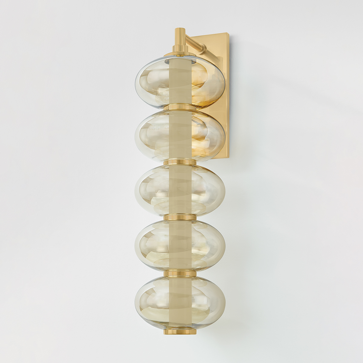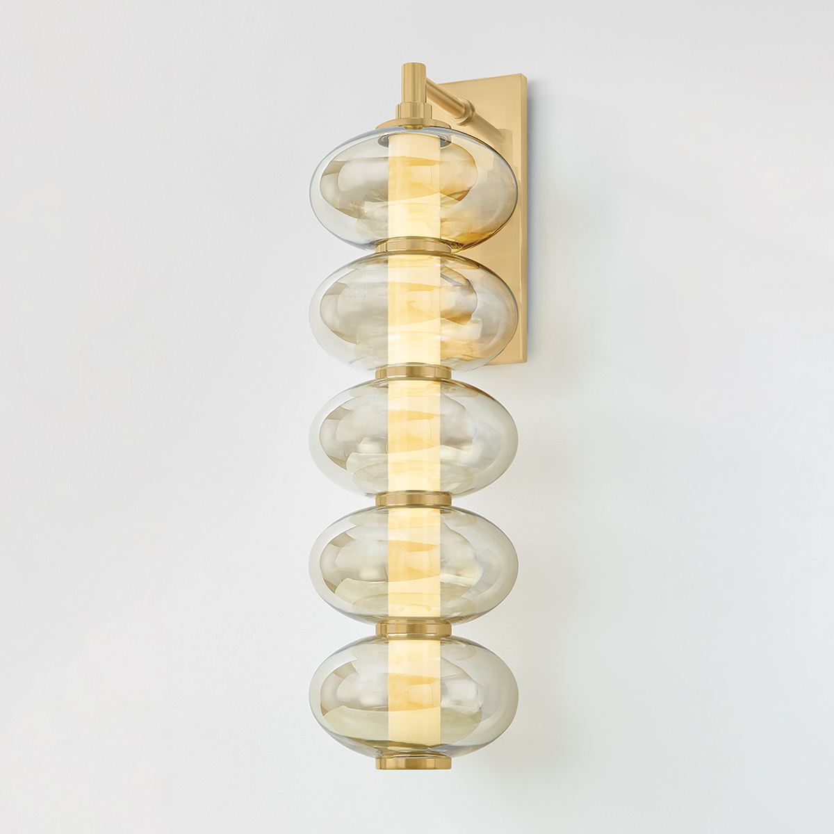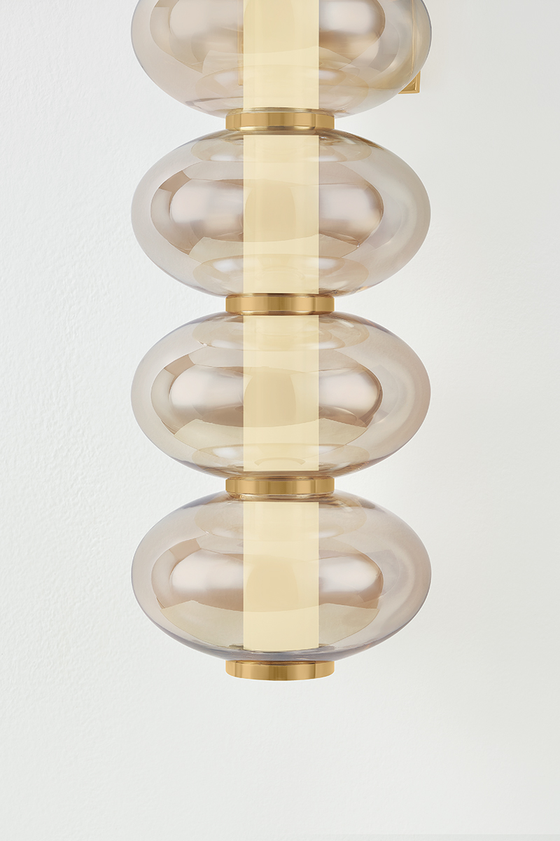Drawing influence from the modernist era, Toulouse features sleek LED tubes surrounded by stacked oval-shaped glass orbs. The moody light bronze glass shades create bubble-like stacks, separated by Vintage Brass cuffs. Available as a sconce and a chandelier in two sizes, Toulouse is perfect for those who appreciate maximalist style with a contemporary twist.