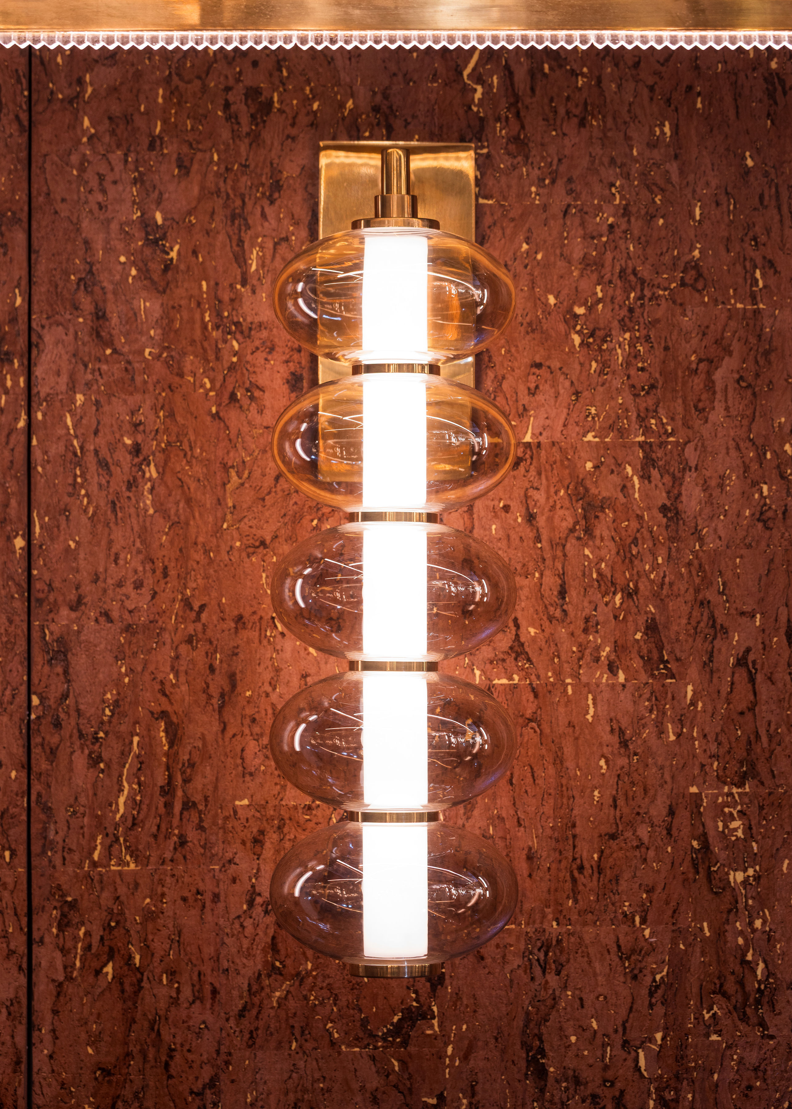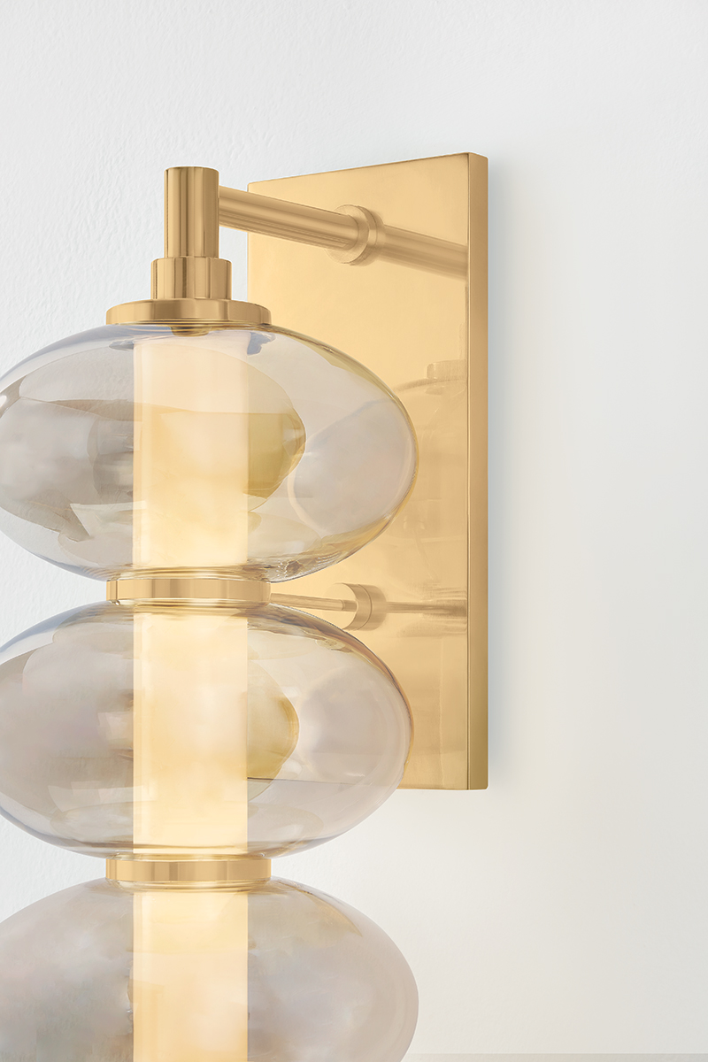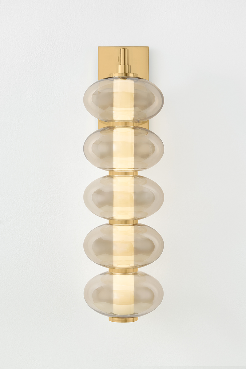 Drawing influence from the modernist era, Toulouse features sleek LED tubes surrounded by stacked oval-shaped glass orbs. The moody light bronze glass shades create bubble-like stacks, separated by Vintage Brass cuffs. Available as a sconce and a chandelier in two sizes, Toulouse is perfect for those who appreciate maximalist style with a contemporary twist.
